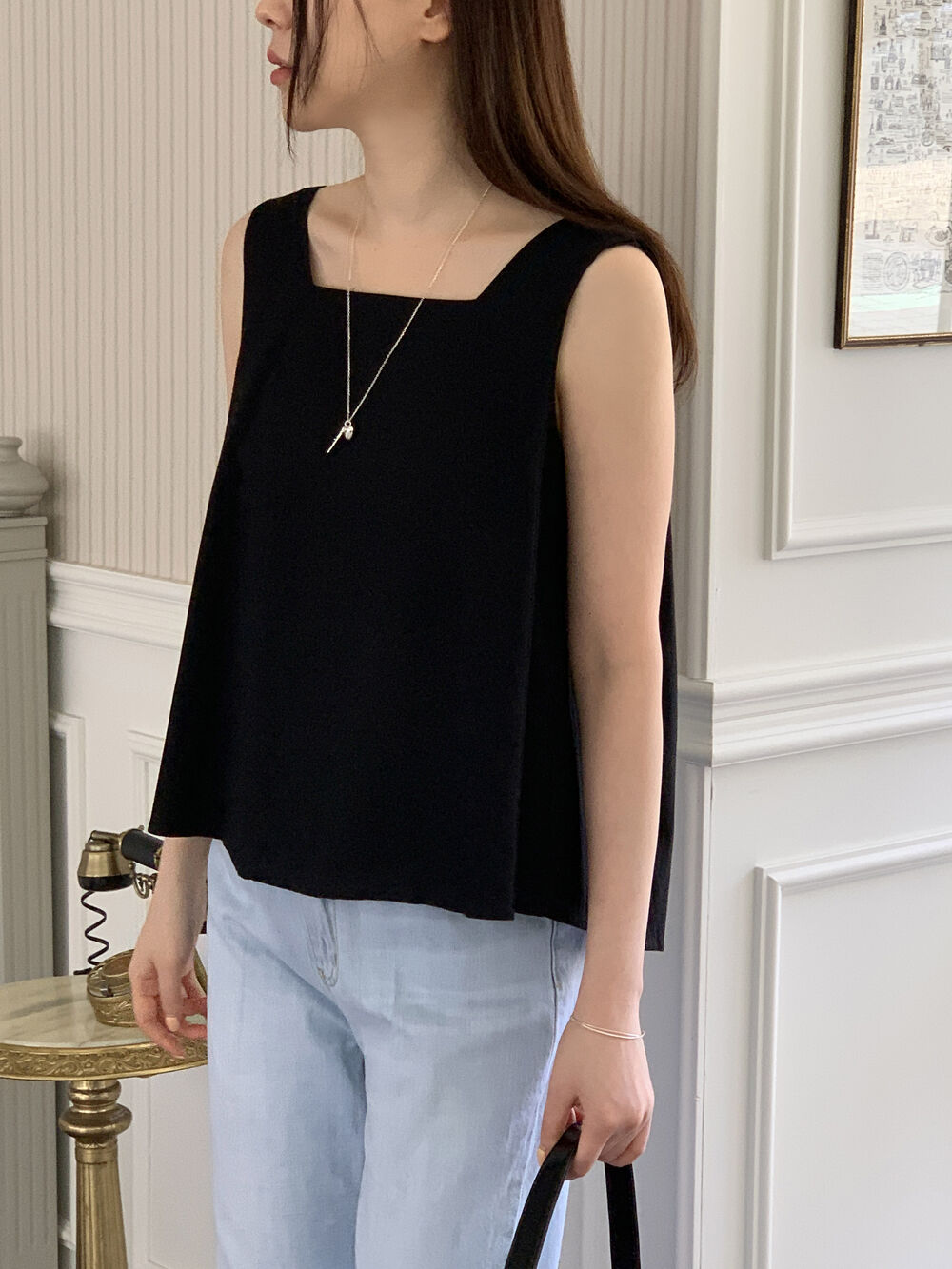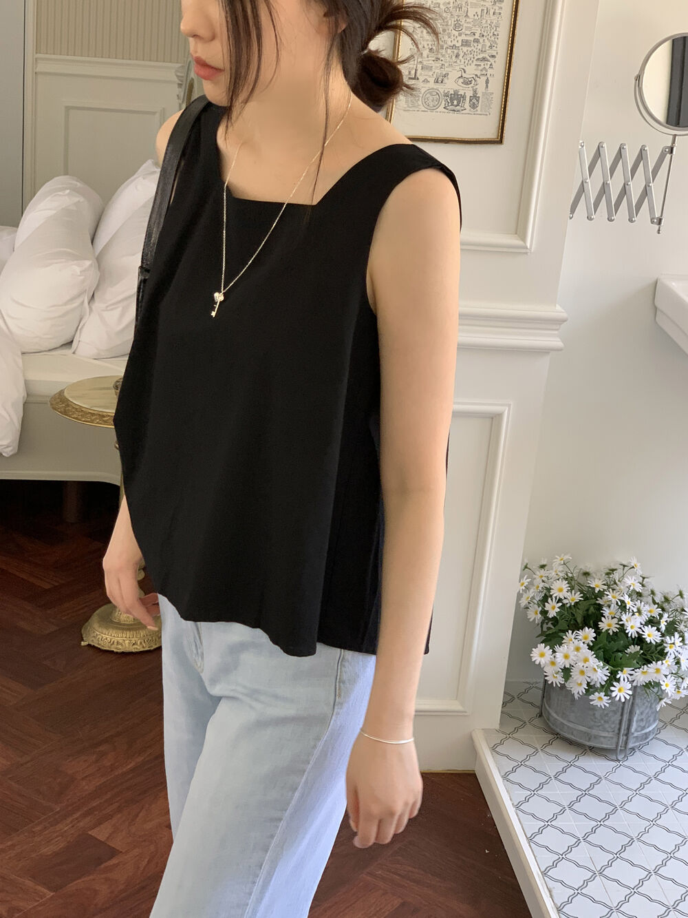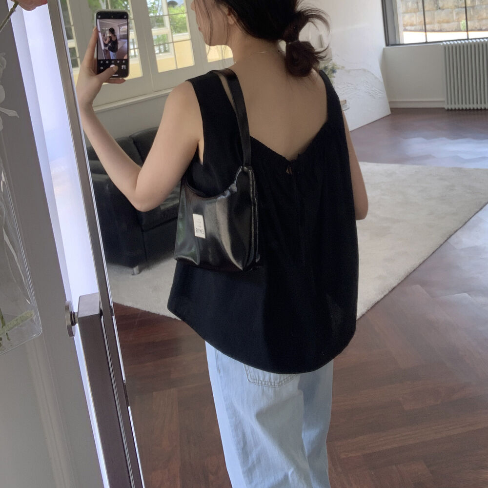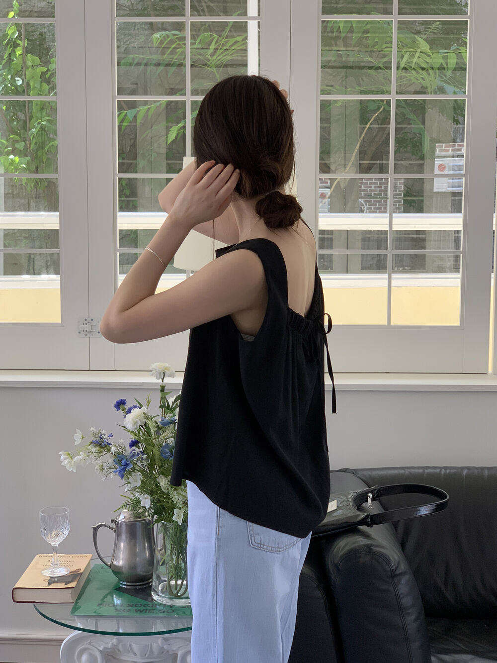 [3color]リネンスクエアバックリボンノースリーブブラウス
