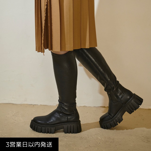 着こなしをスマートに仕上げてくれる一足。ボリュームソールがスタイルアップを実現し、マンネリコーデをブラッシュアップしてくれること間違いなしのストレッチブーツ