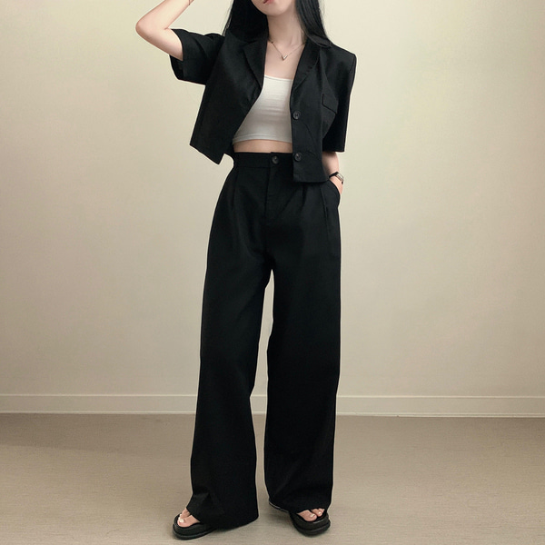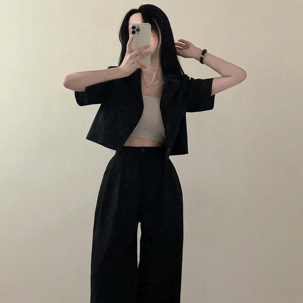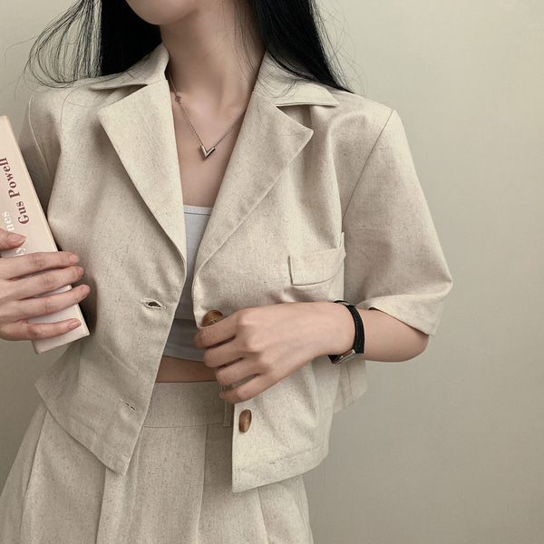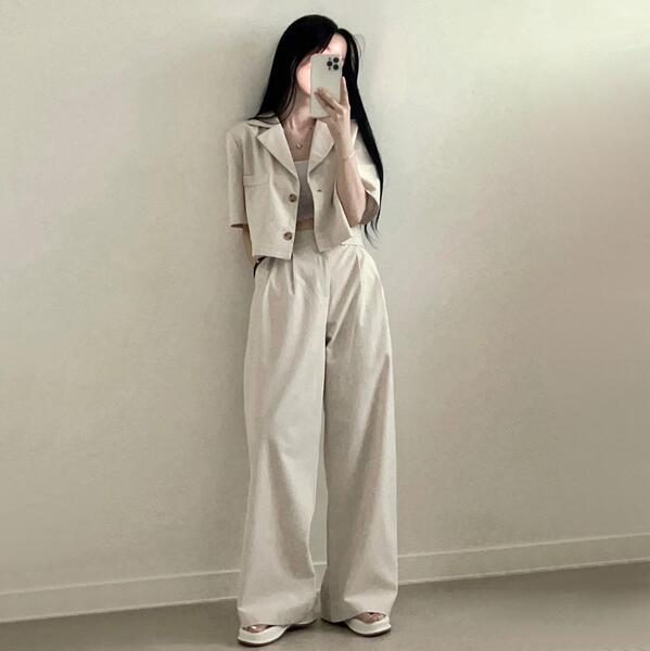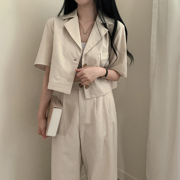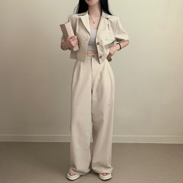 リネンクロップド半袖ジャケットワイドパンツセットアップ2ピース