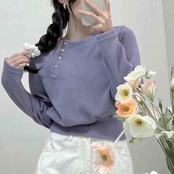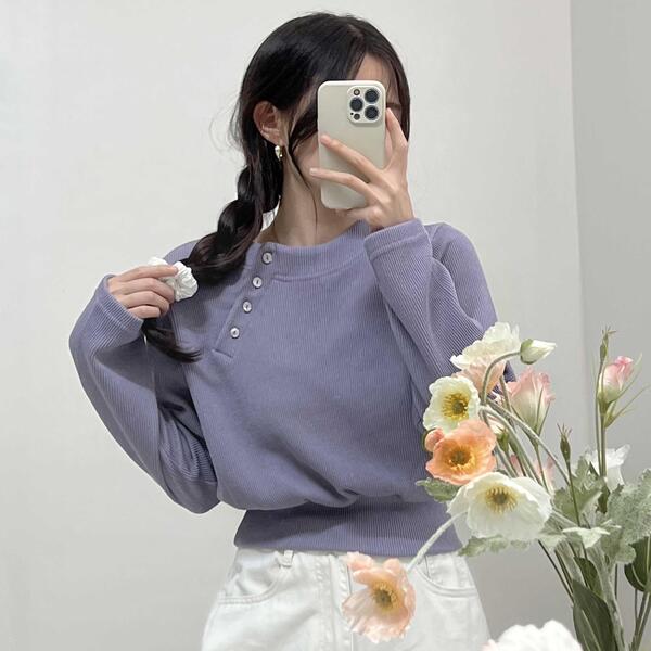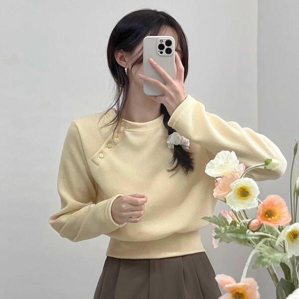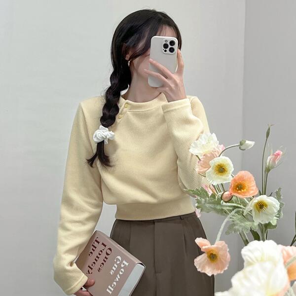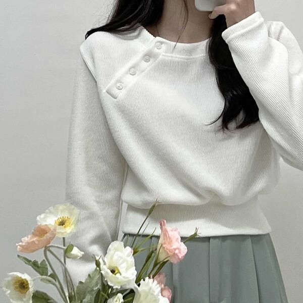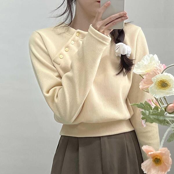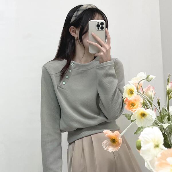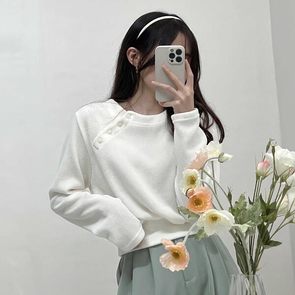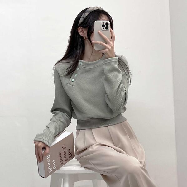 (6col)ラウンドネック斜めストライプボタンリブ長袖クロップドニット