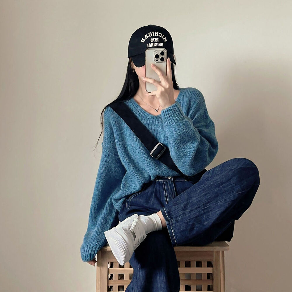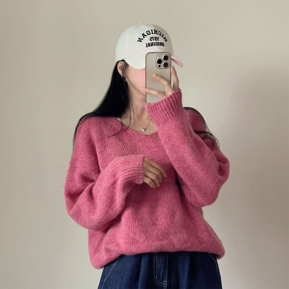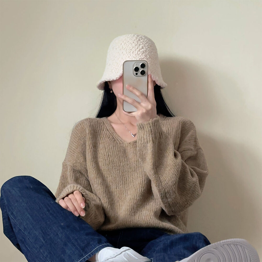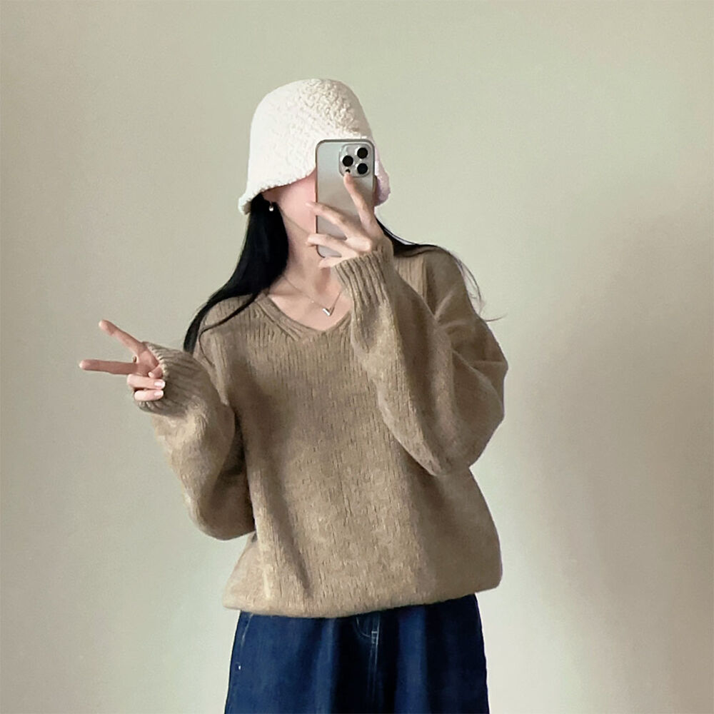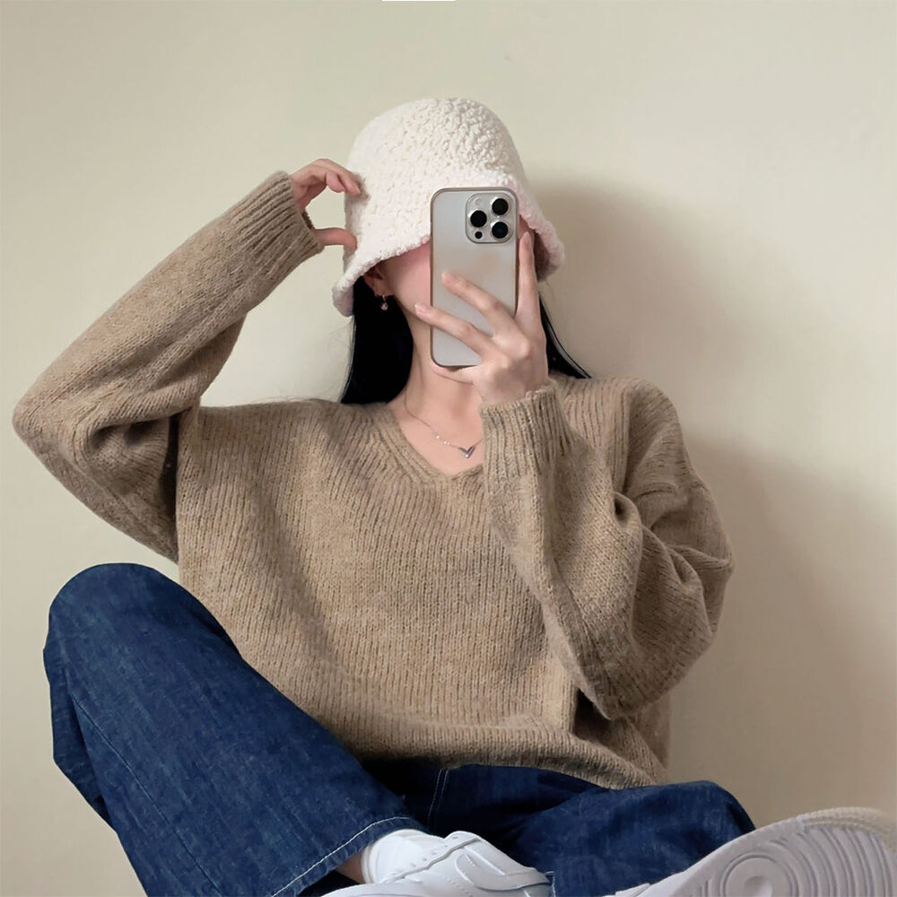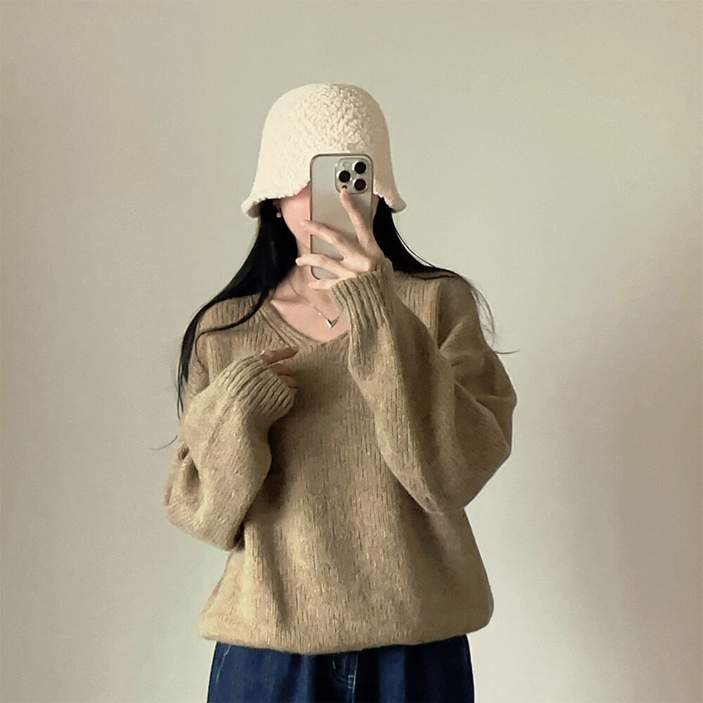 (6color)ウール+アルパカオーバーサイズVネック無地長袖ニット(秋の新商品)