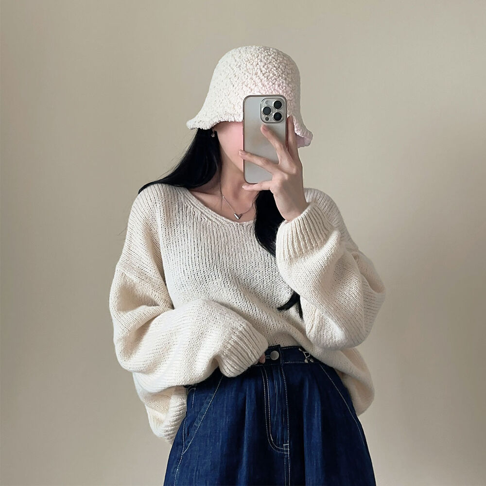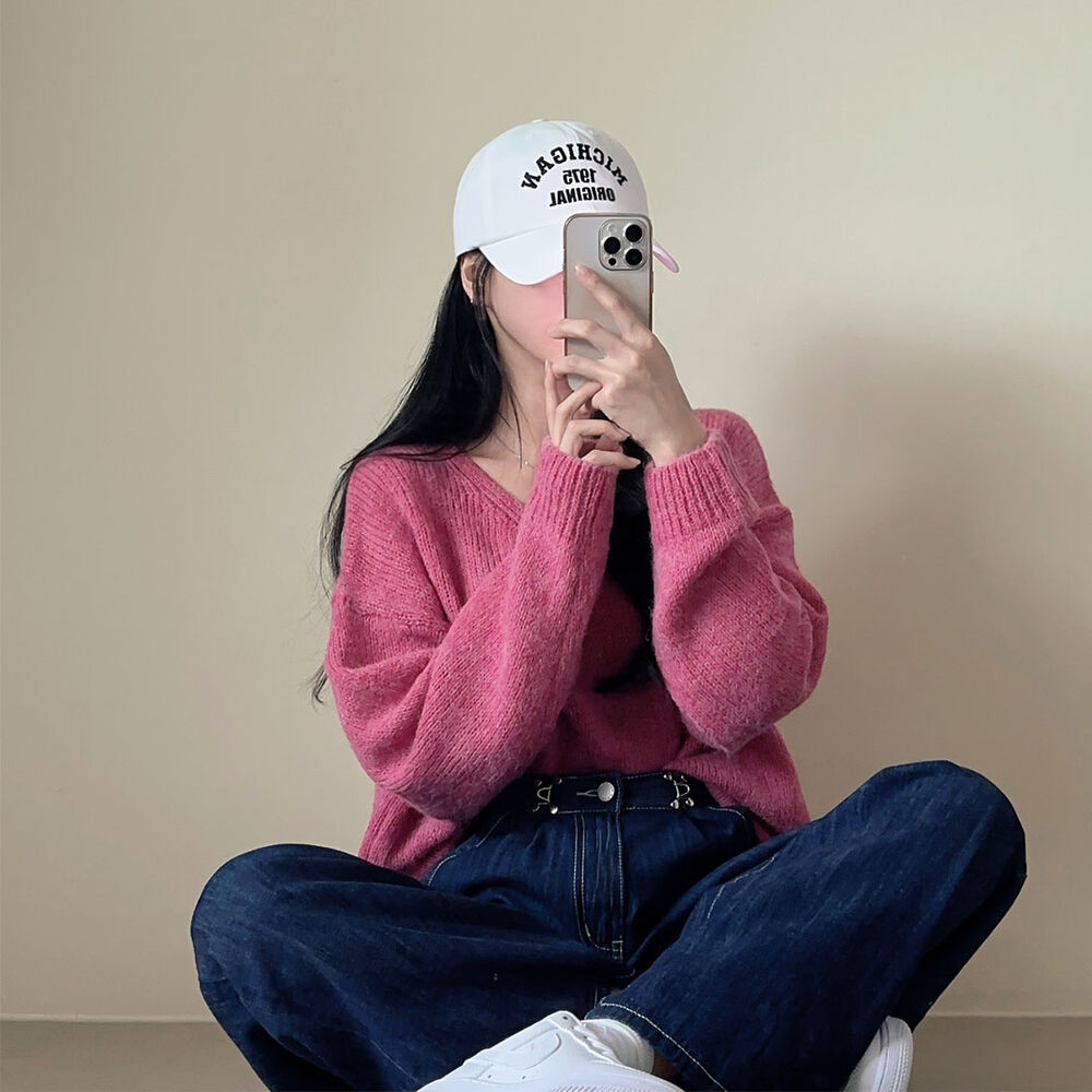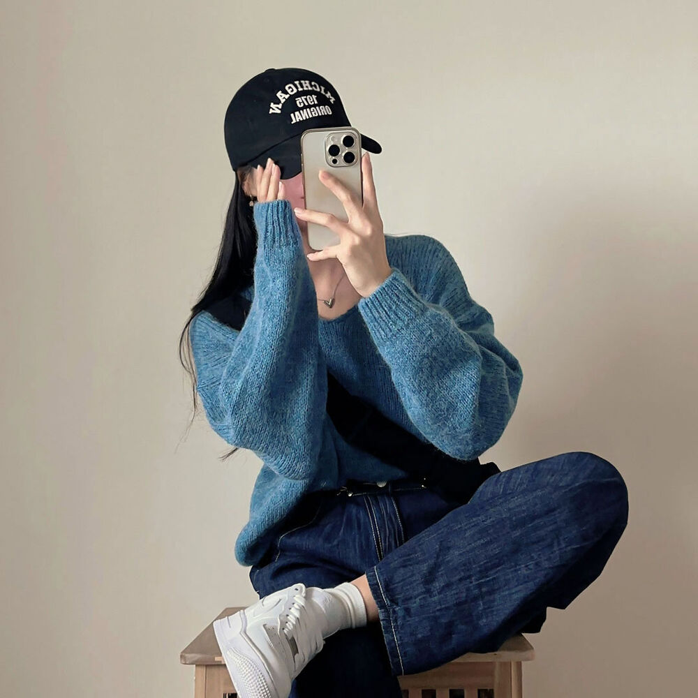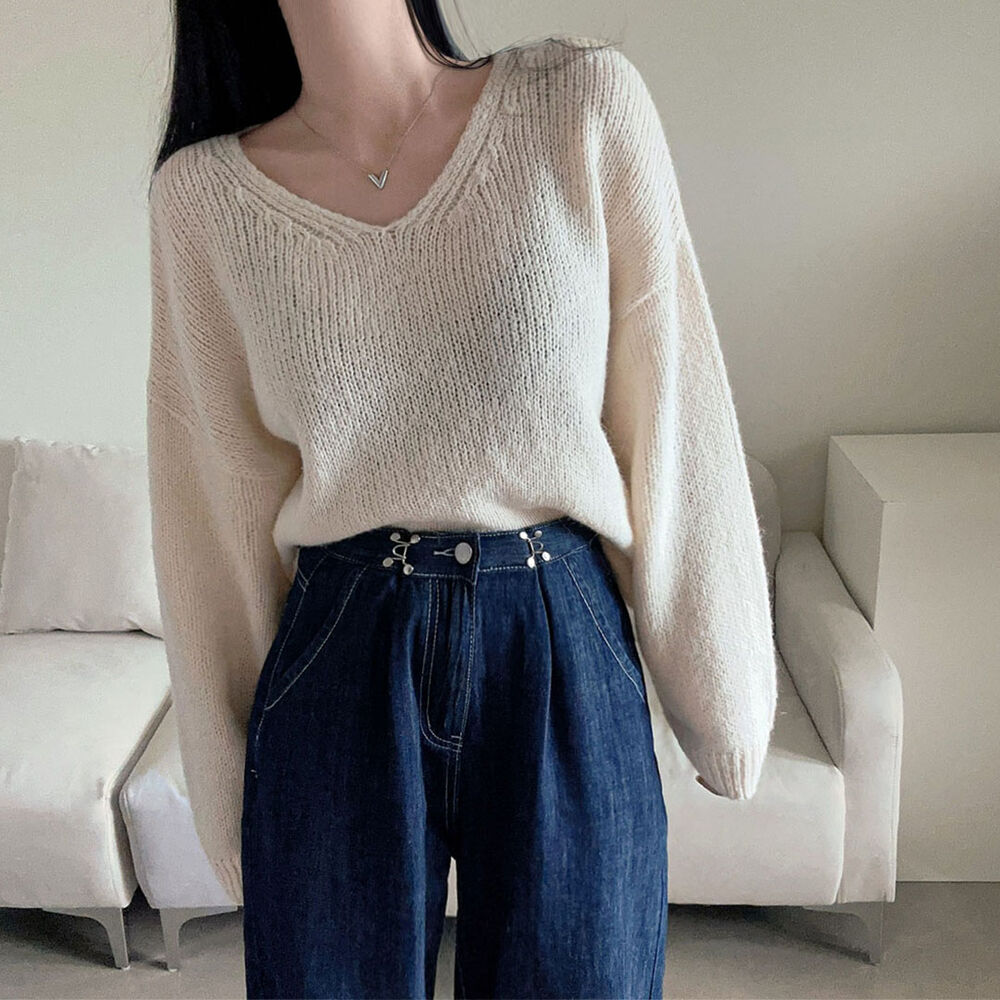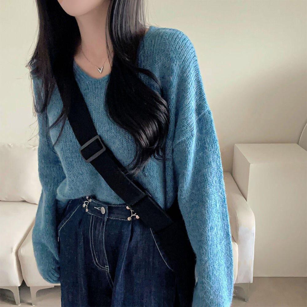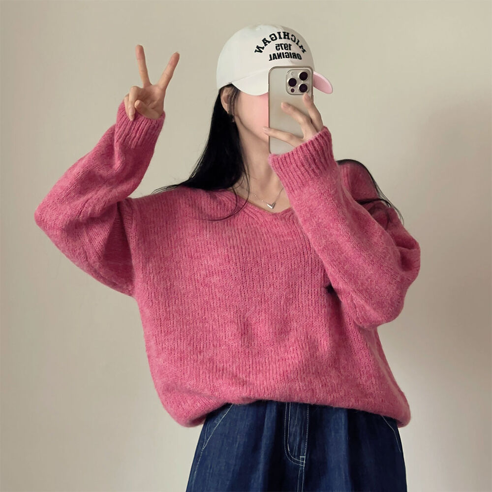 (6color)ウール+アルパカオーバーサイズVネック無地長袖ニット(秋の新商品)
