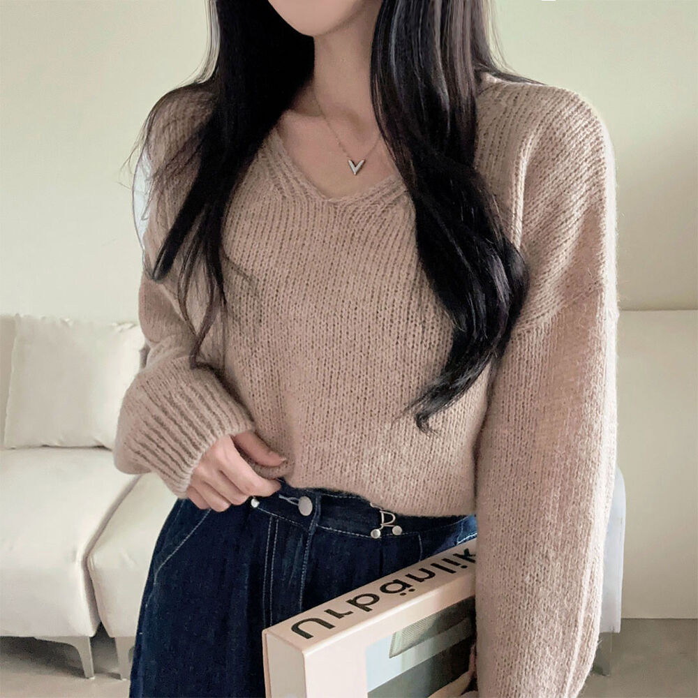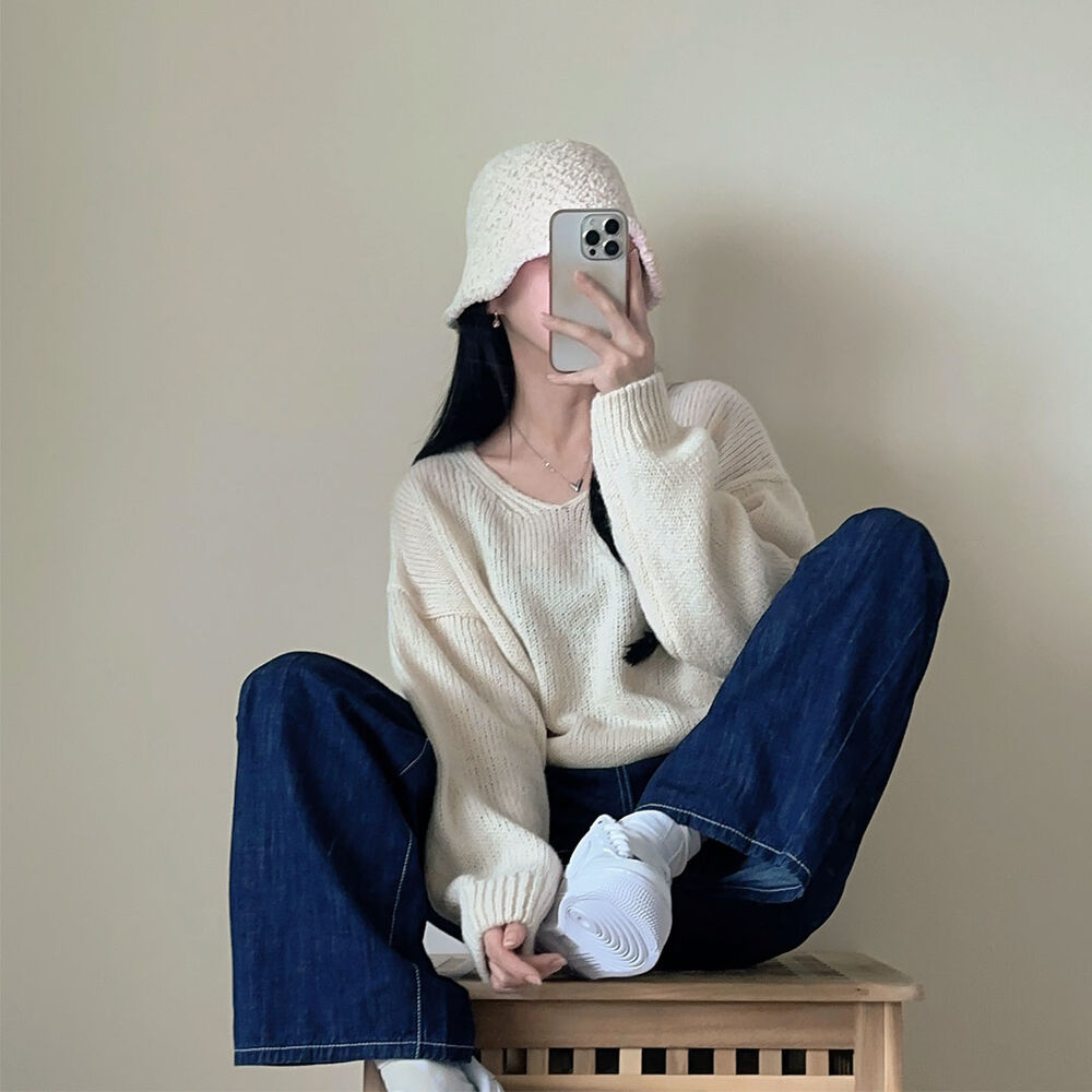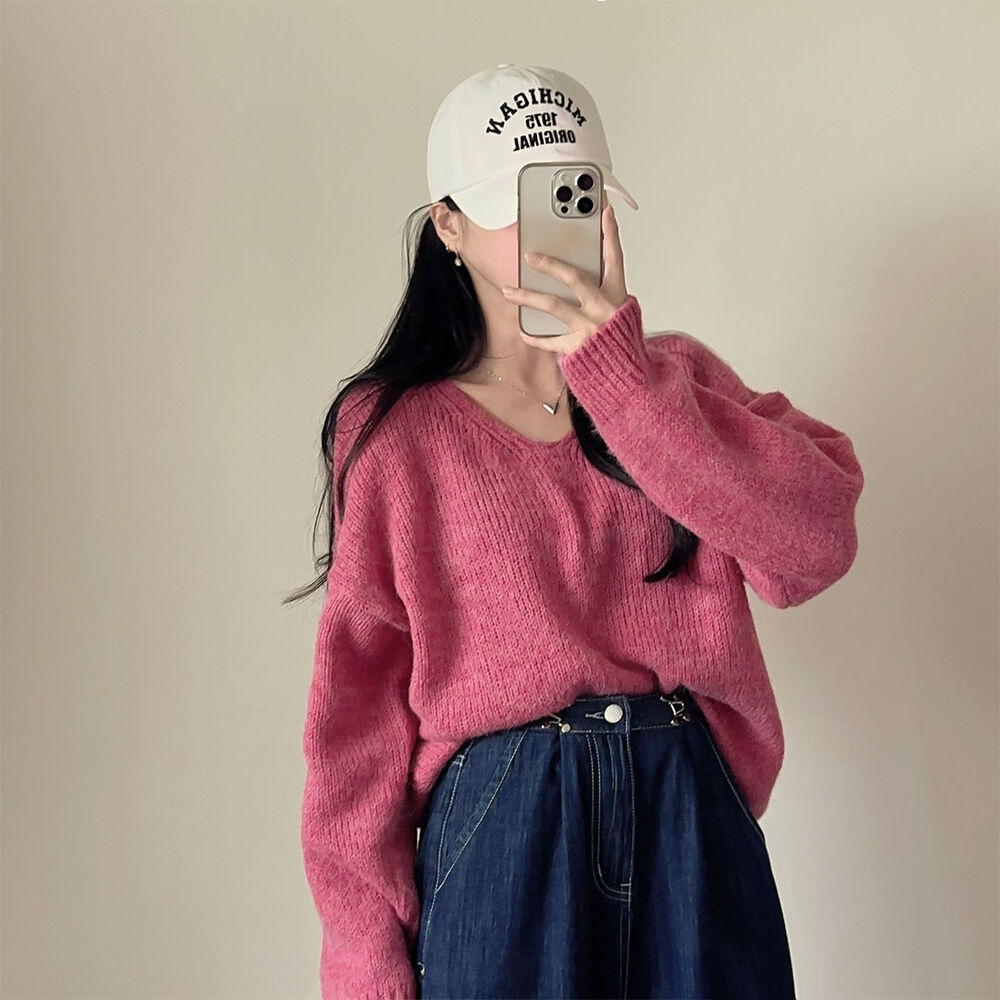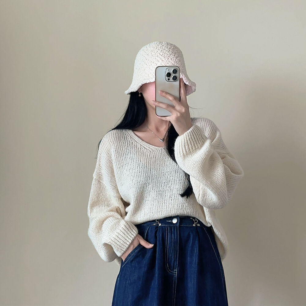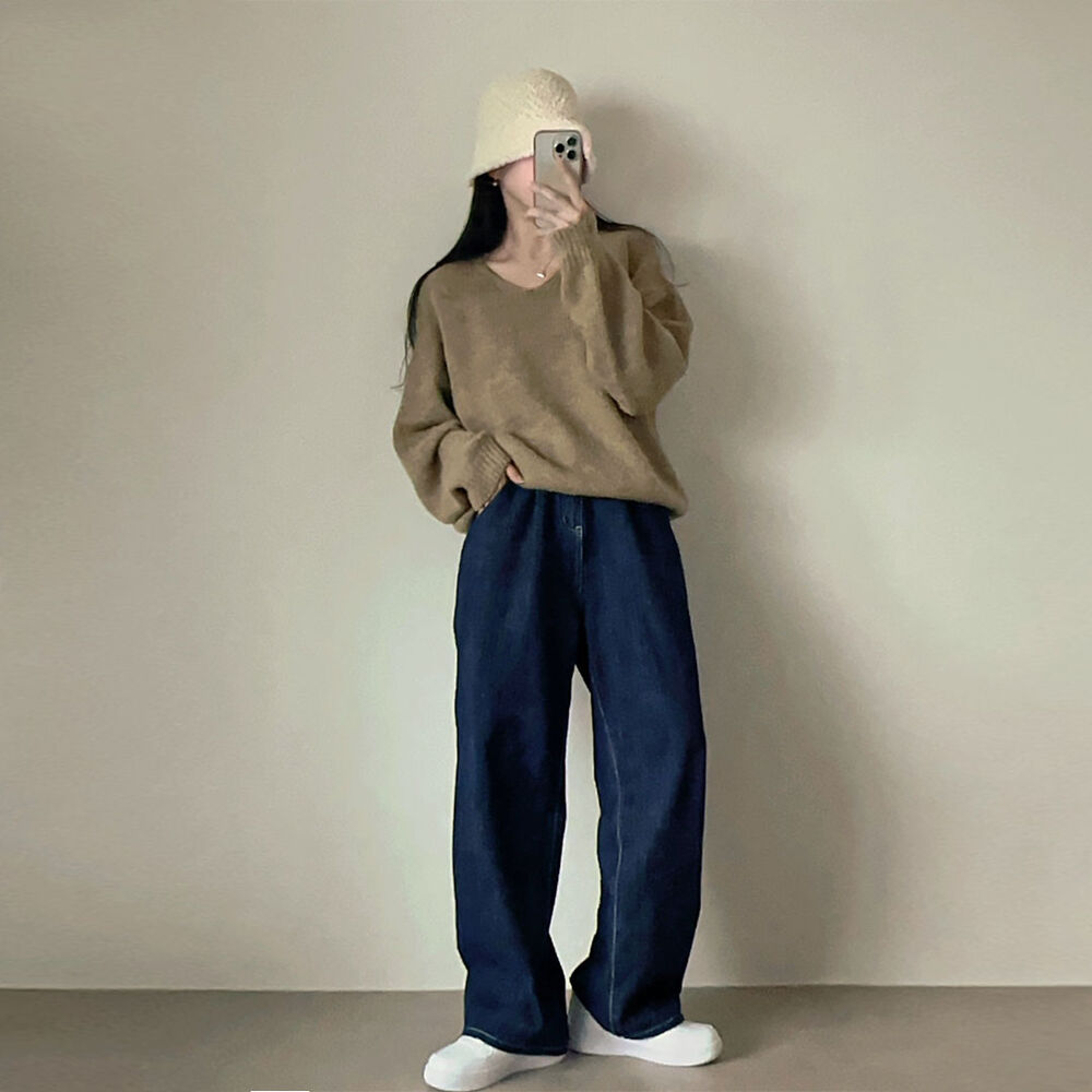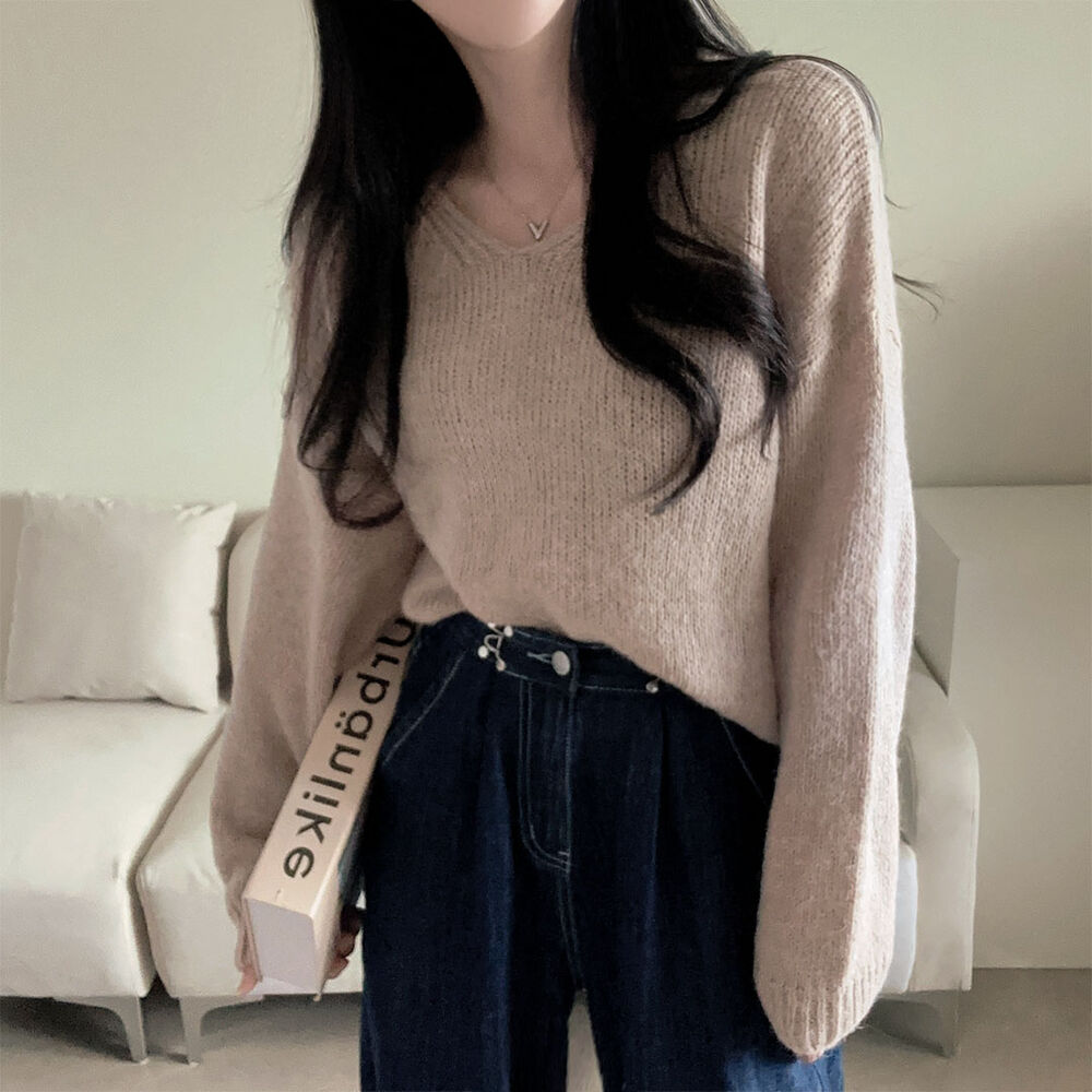 (6color)ウール+アルパカオーバーサイズVネック無地長袖ニット(秋の新商品)