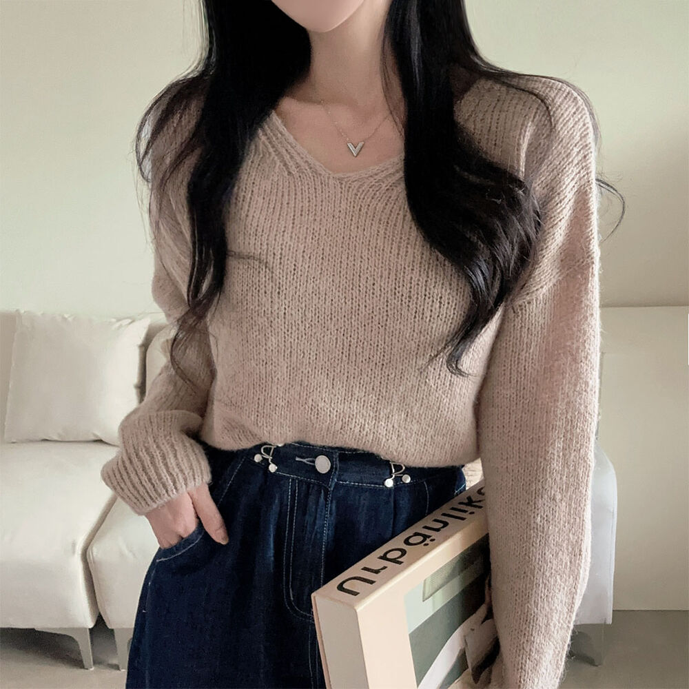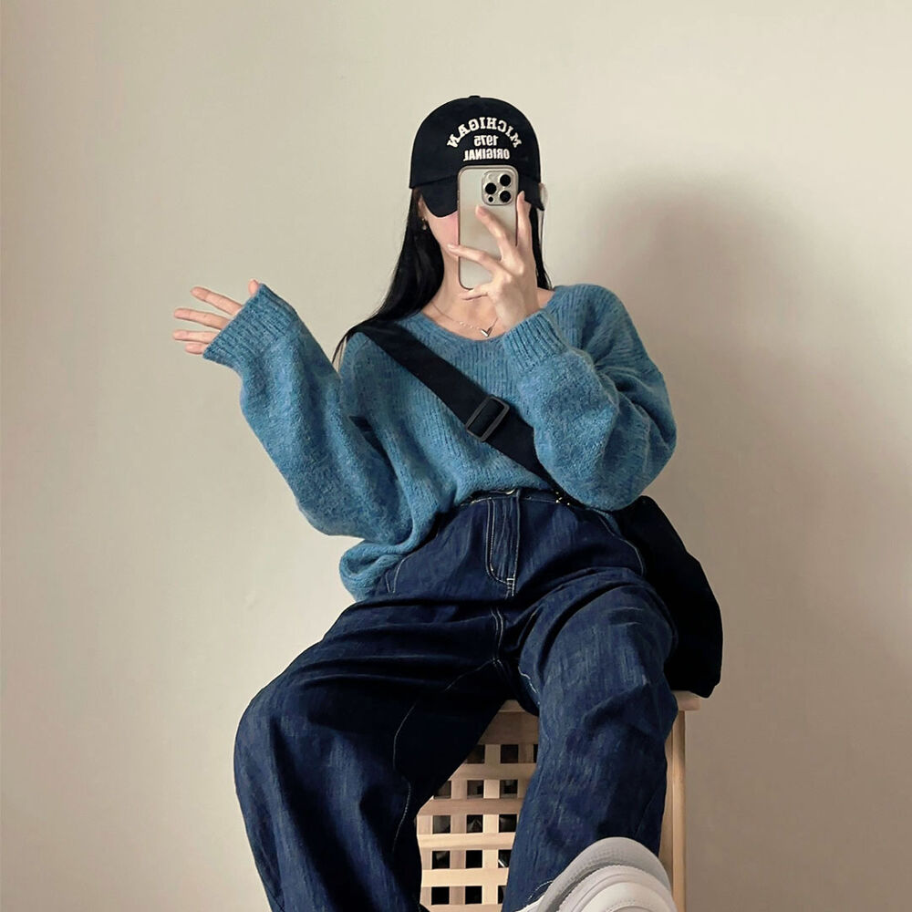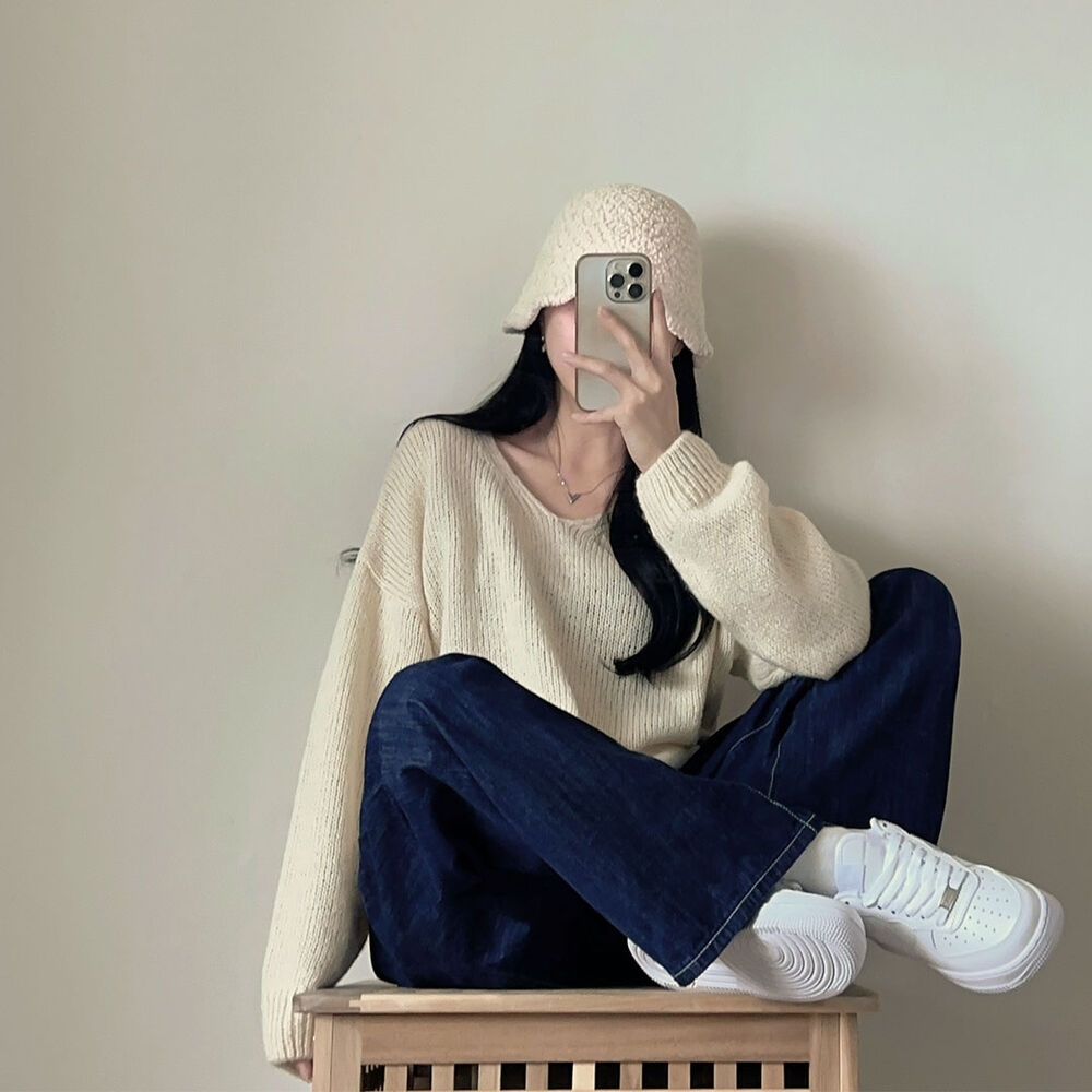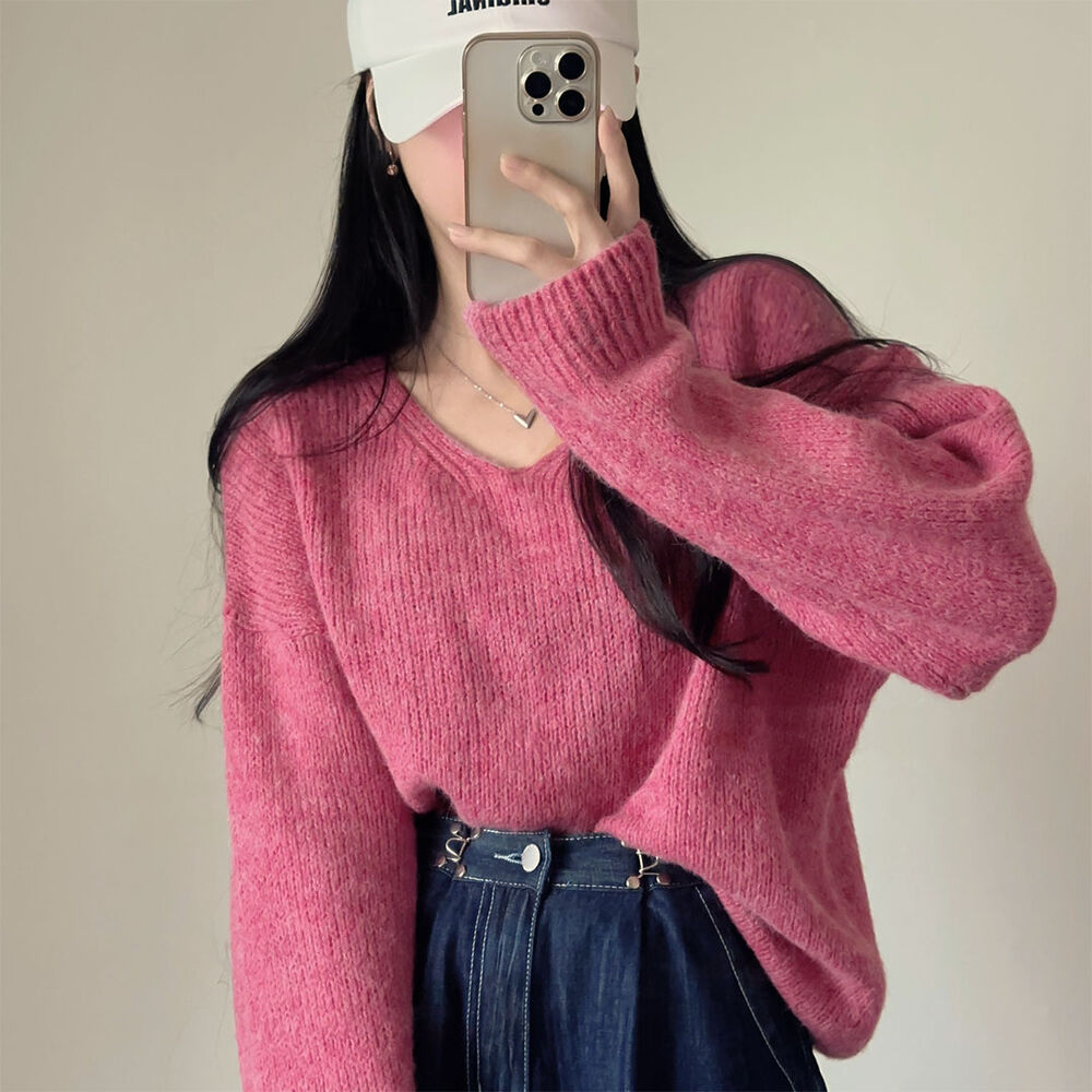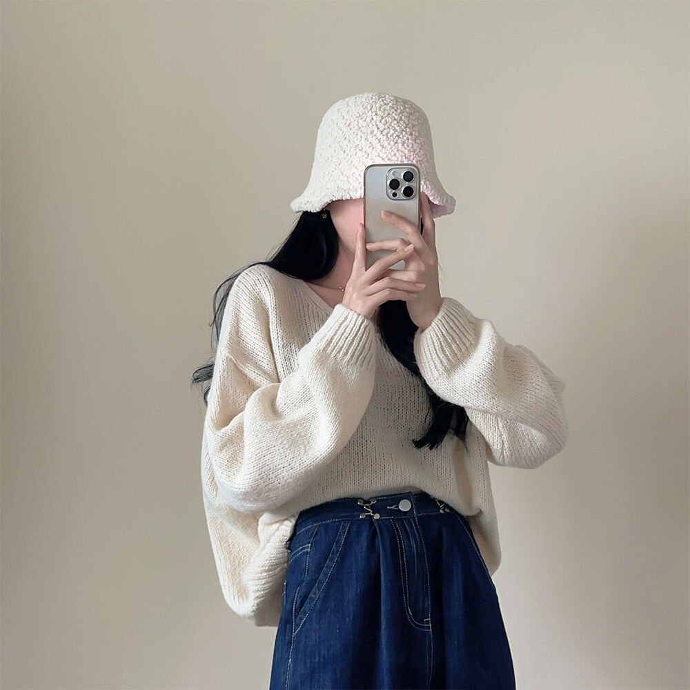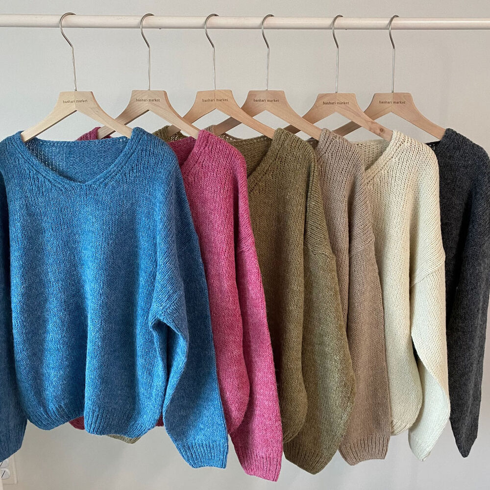 (6color)ウール+アルパカオーバーサイズVネック無地長袖ニット(秋の新商品)