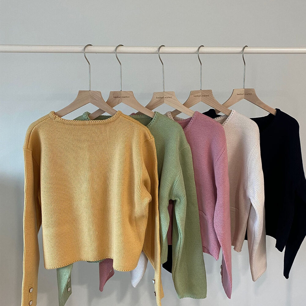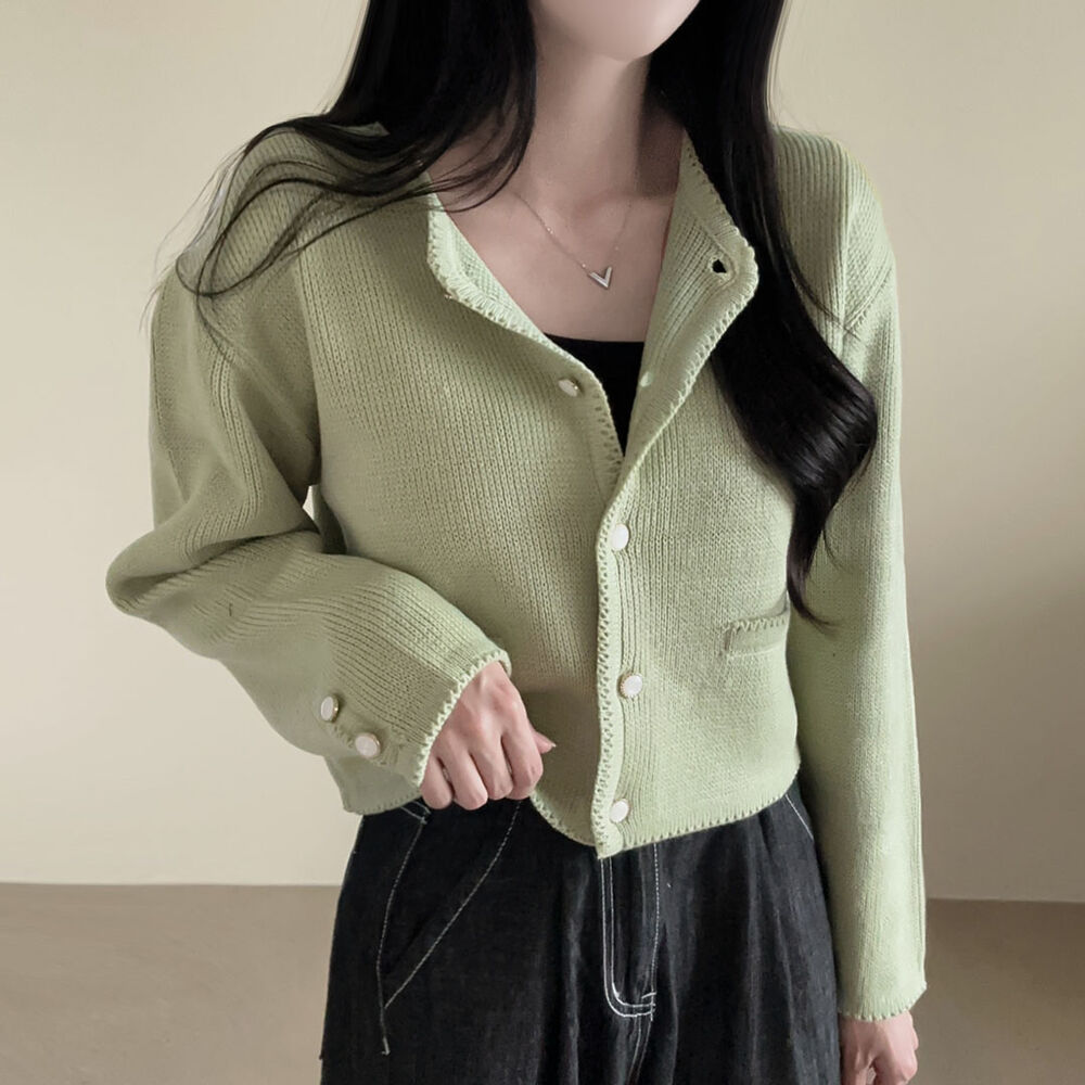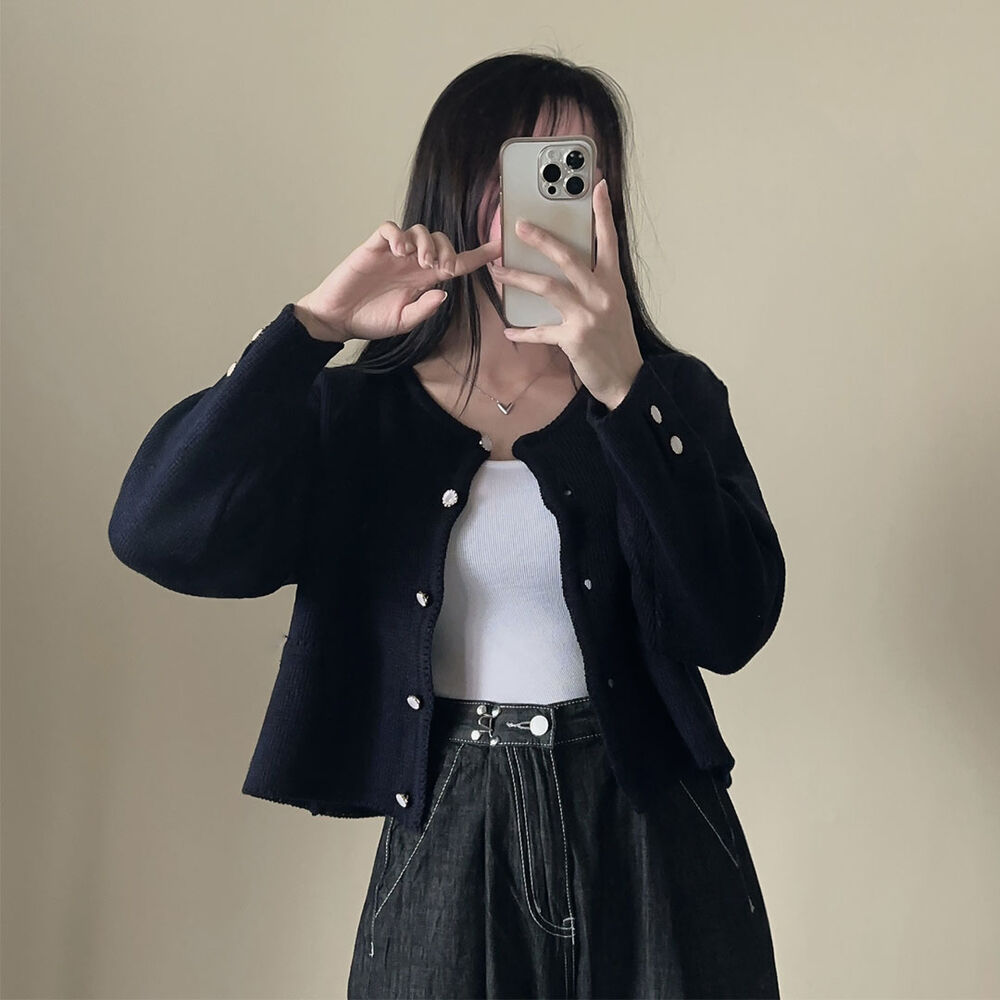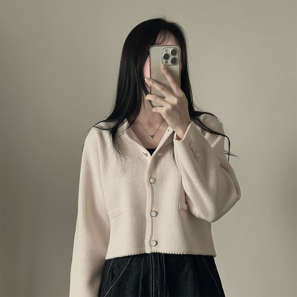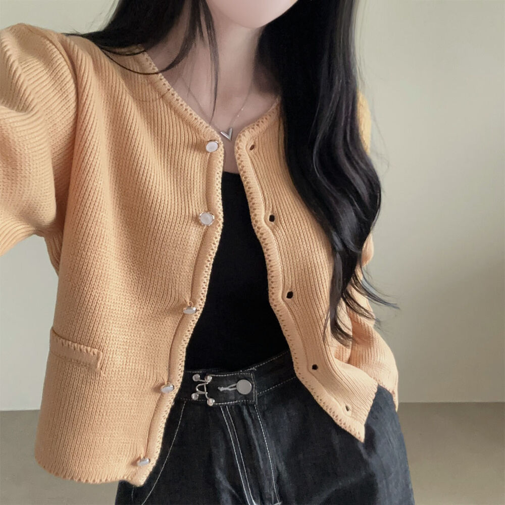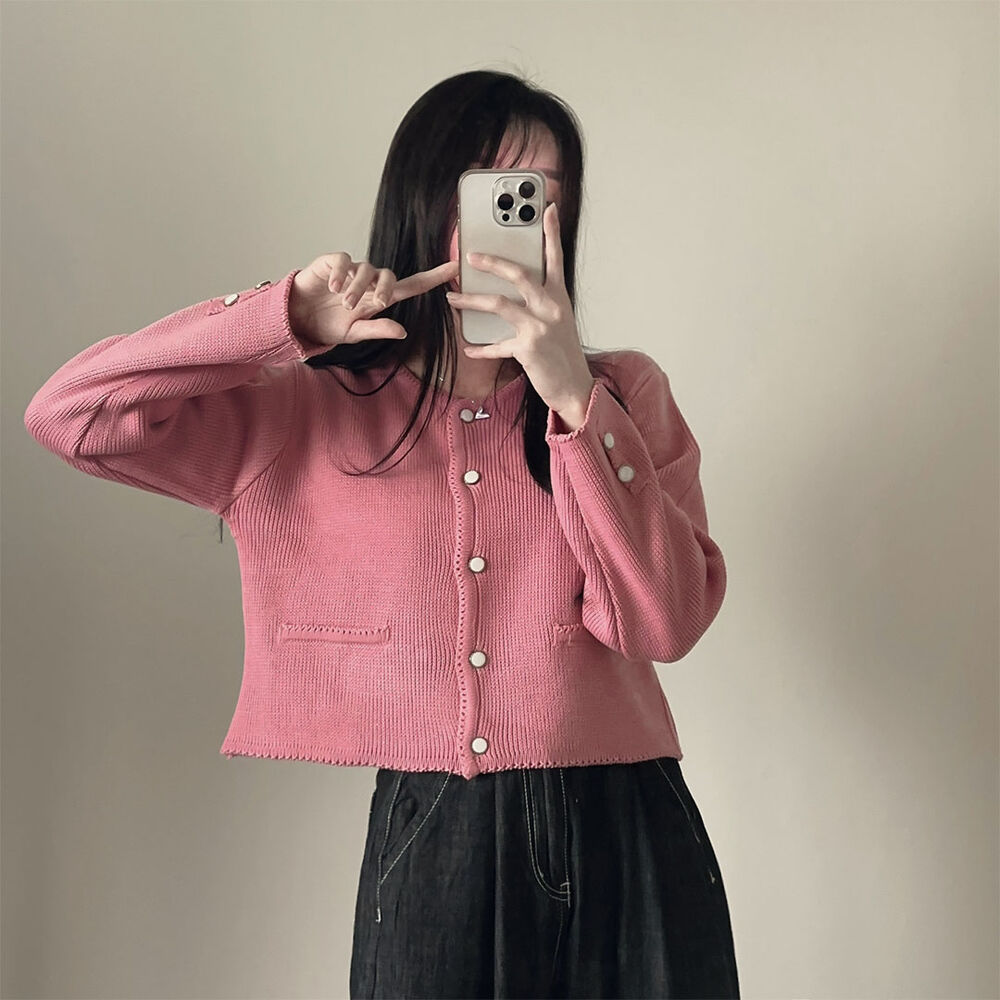 (5color)宝石ボタンラウンドポケットクロップド長袖ニットカーディガンジャケット(秋の新商品)