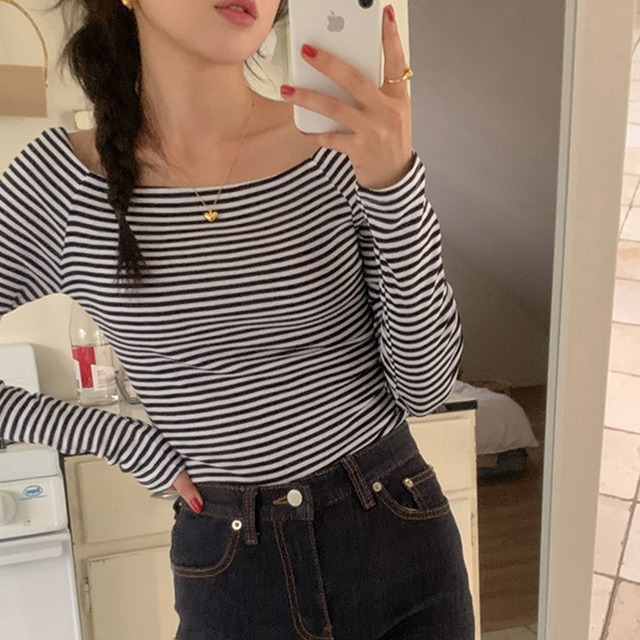 Sodaオフショルダーストライプボーダー柄Tシャツ