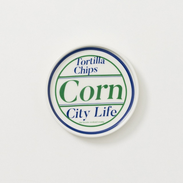 アイボリー色の釉薬にシティライフのグラフィック要素が入った円形プレートです。
