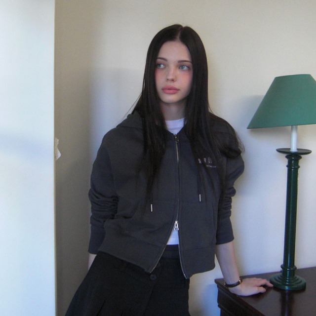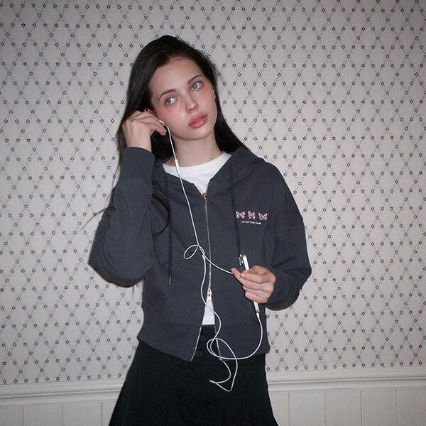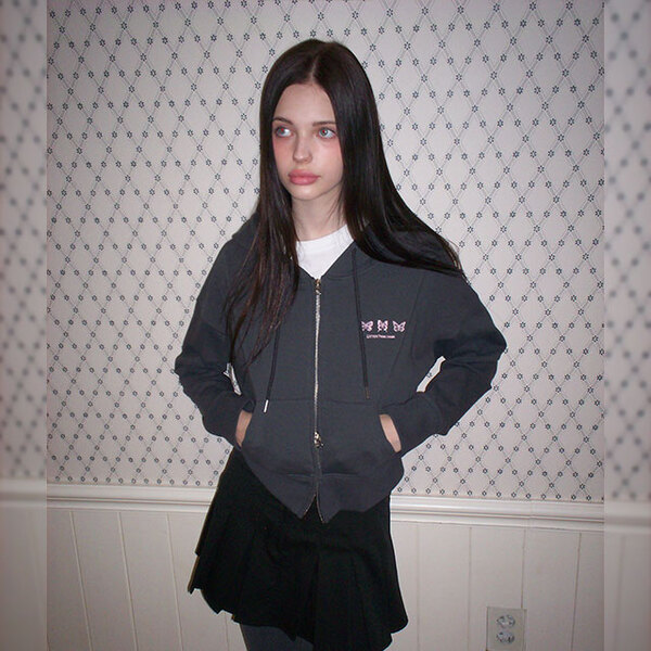 Triple Butterfly Embroidered Two-way Hood Zip up ( Charcoal )