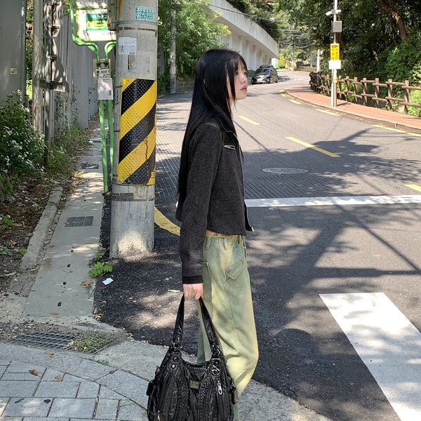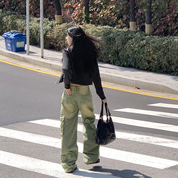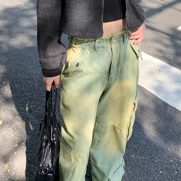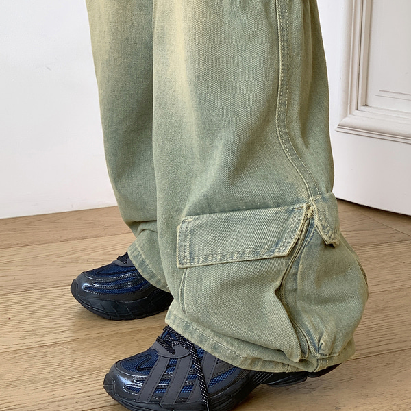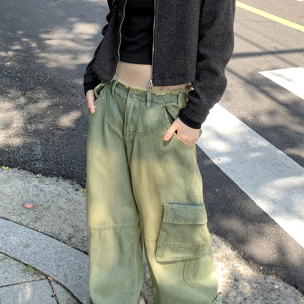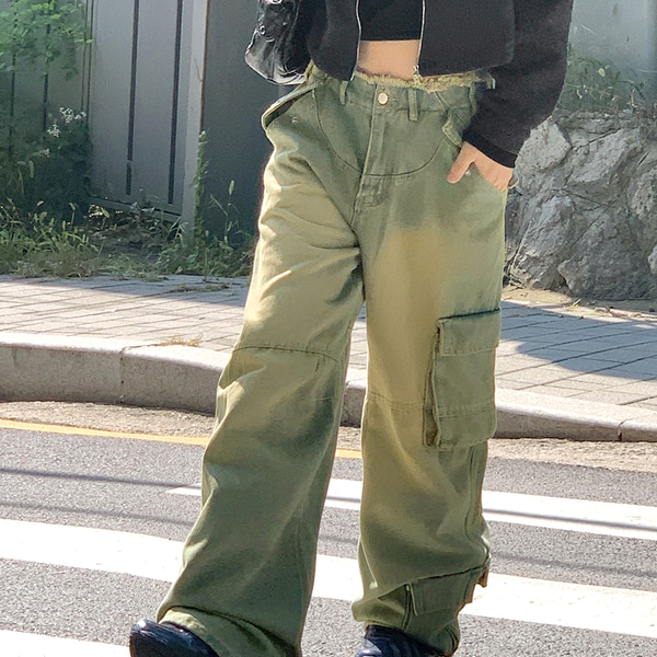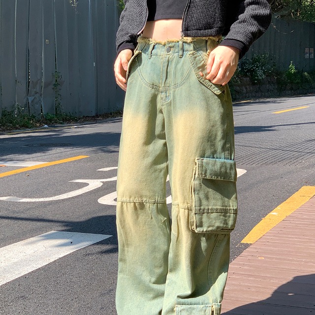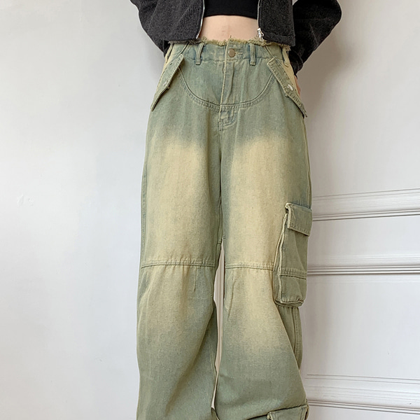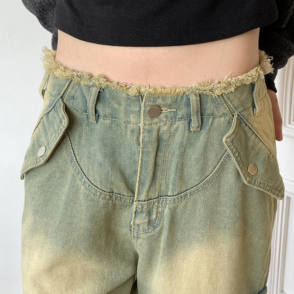 ヴィンテージウォッシュポケットカーゴフリンジデニムロングワイドパンツ