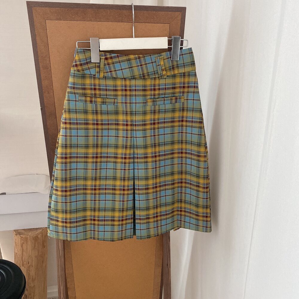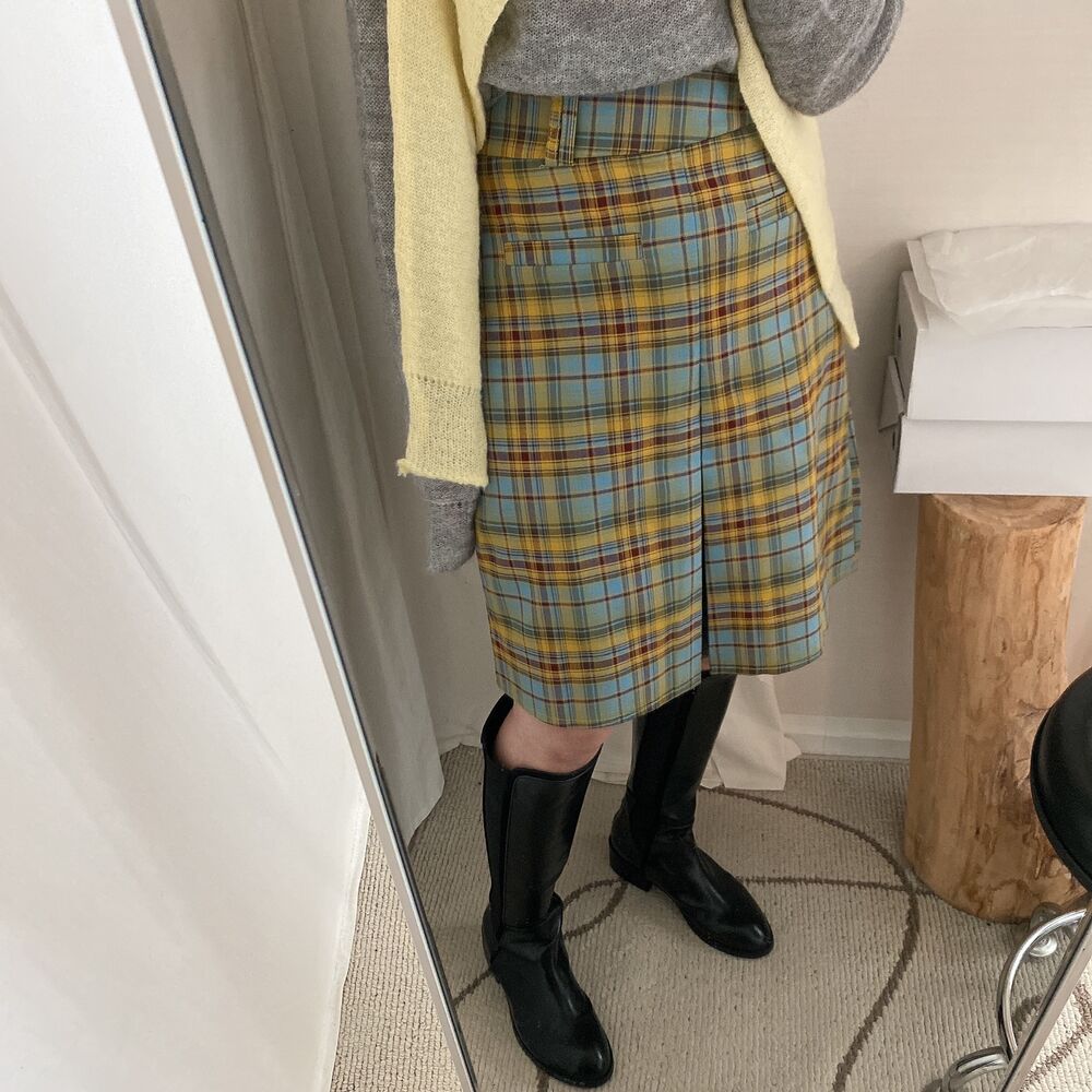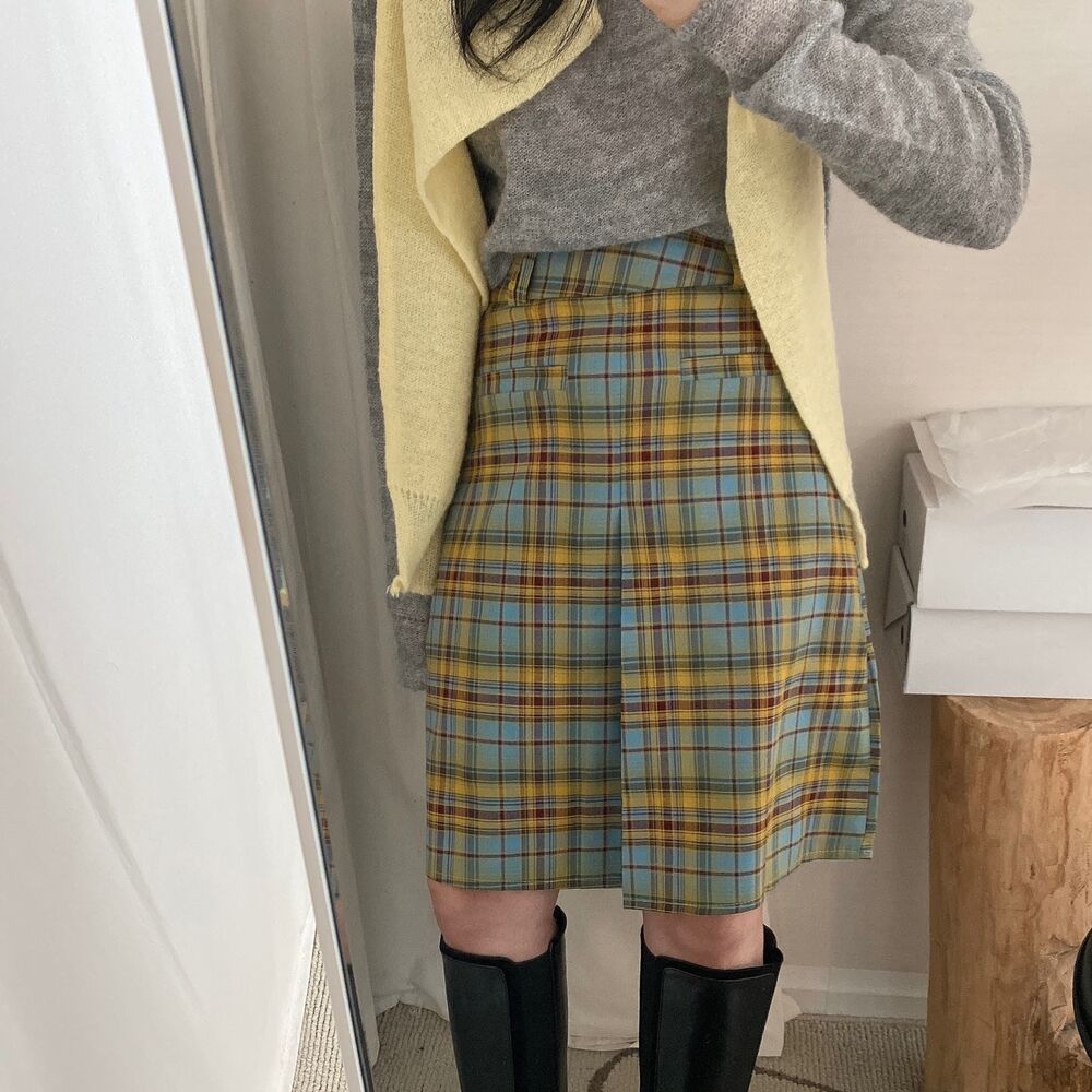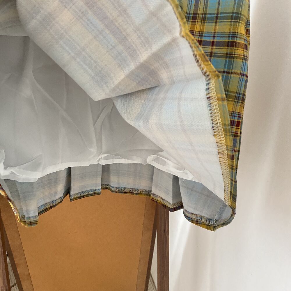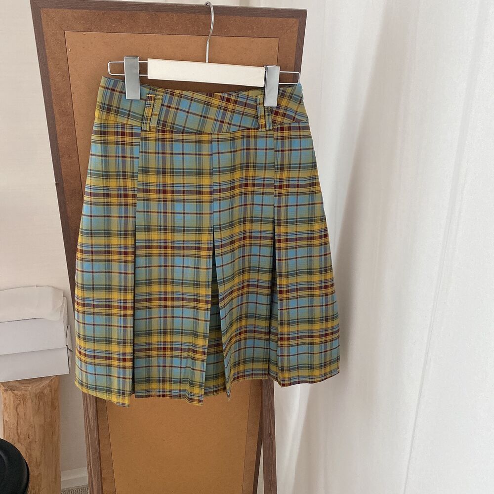 ハイティーンスクールチェック黄色いタック入りミディスカート