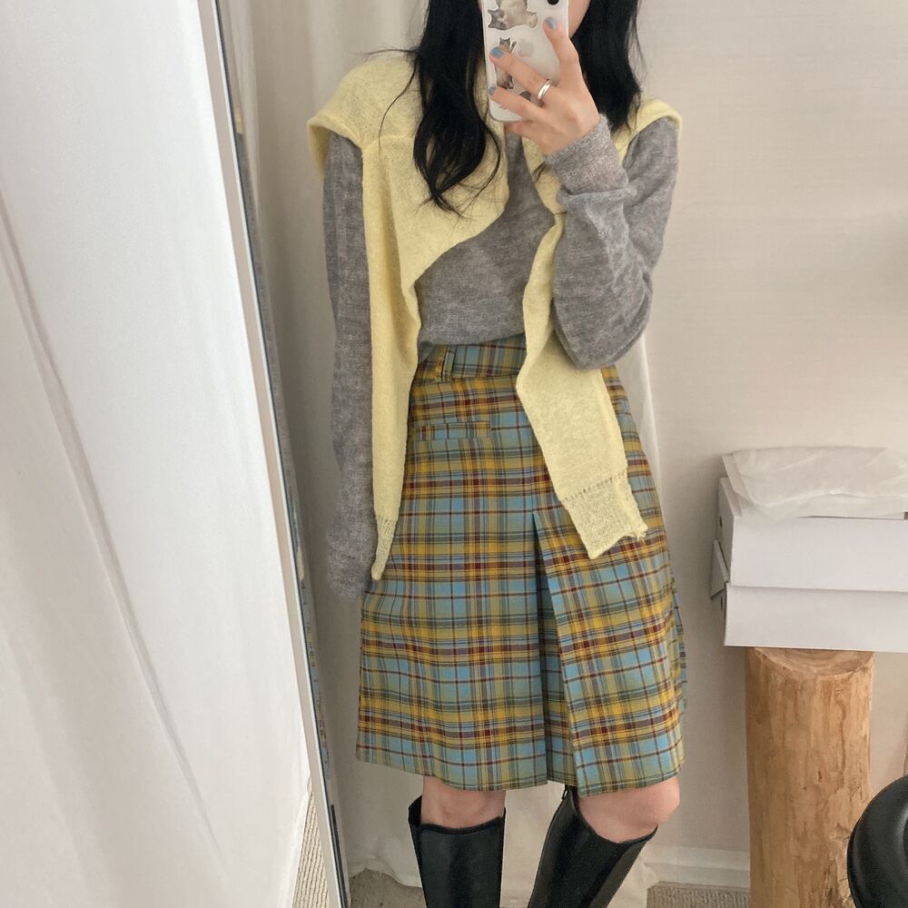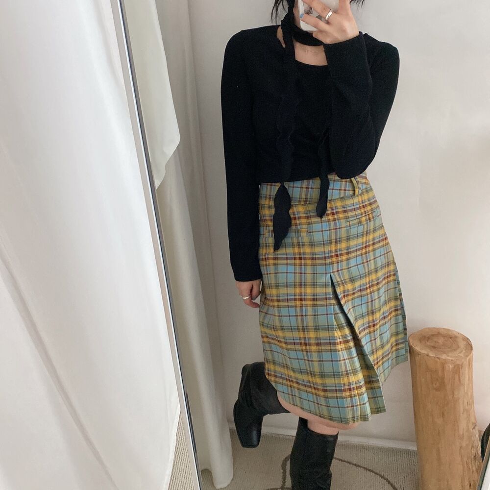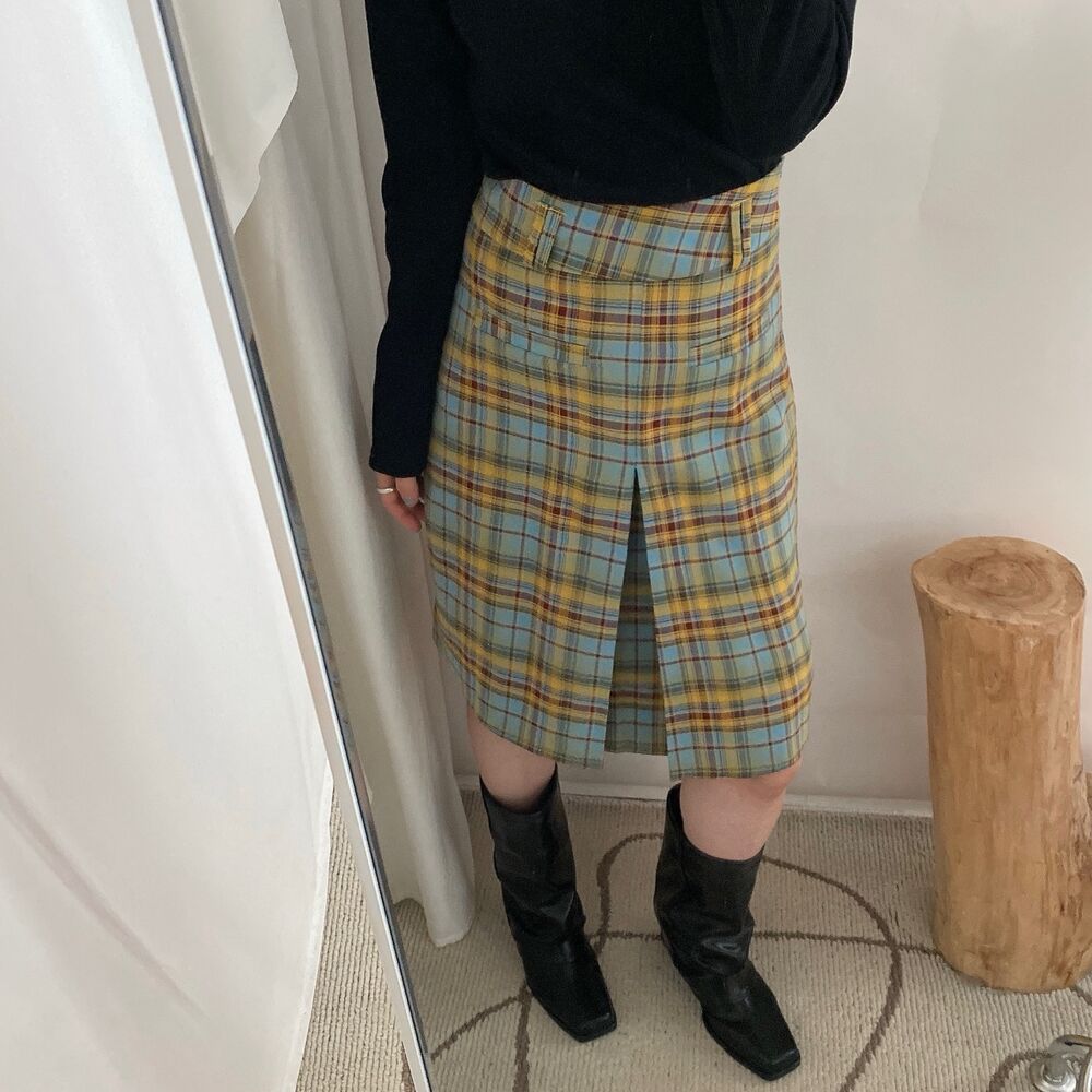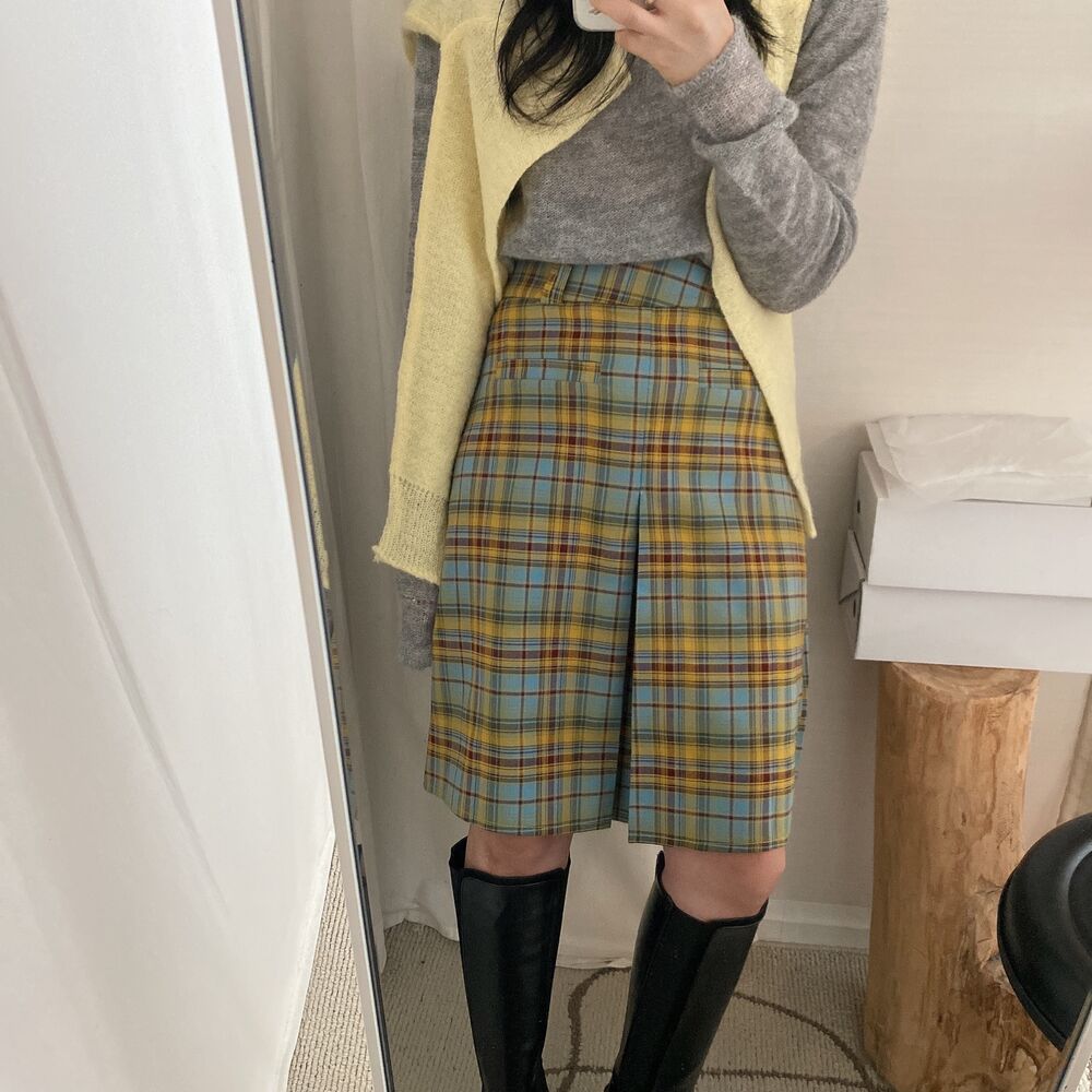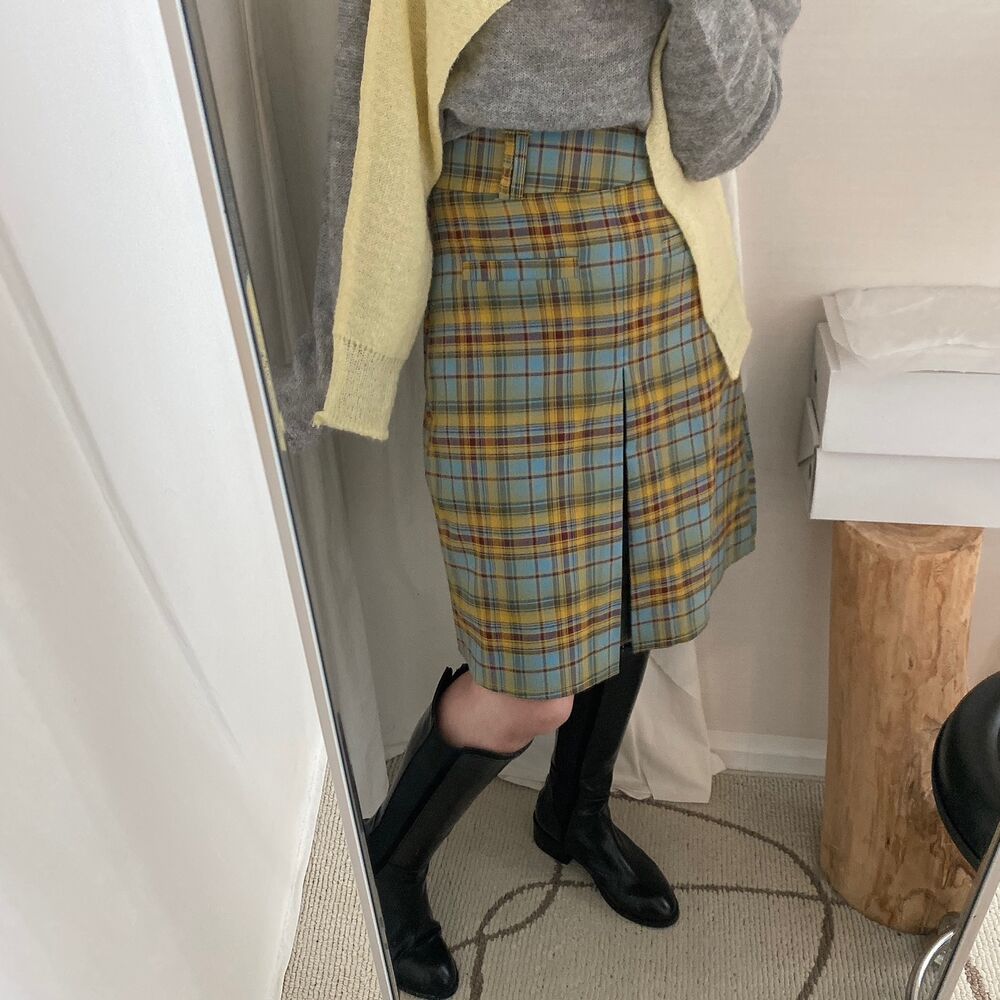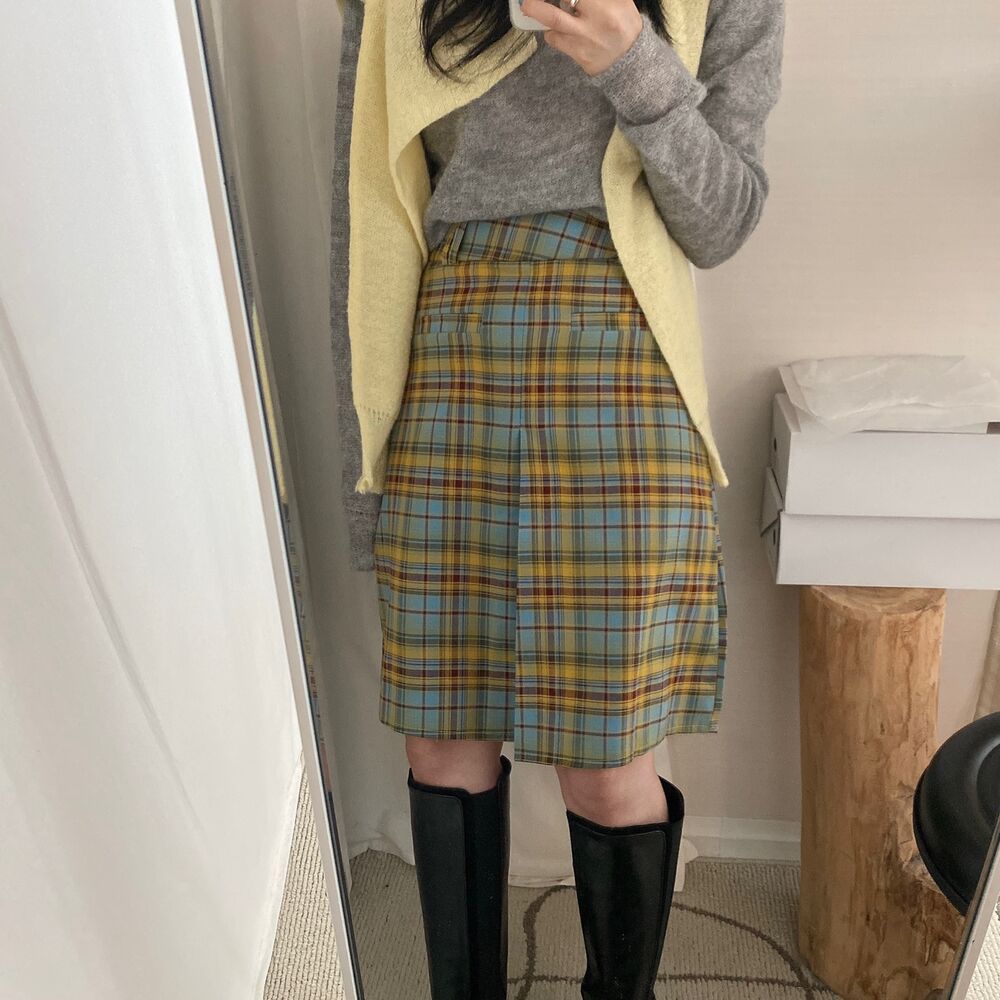 ハイティーンスクールチェック黄色いタック入りミディスカート