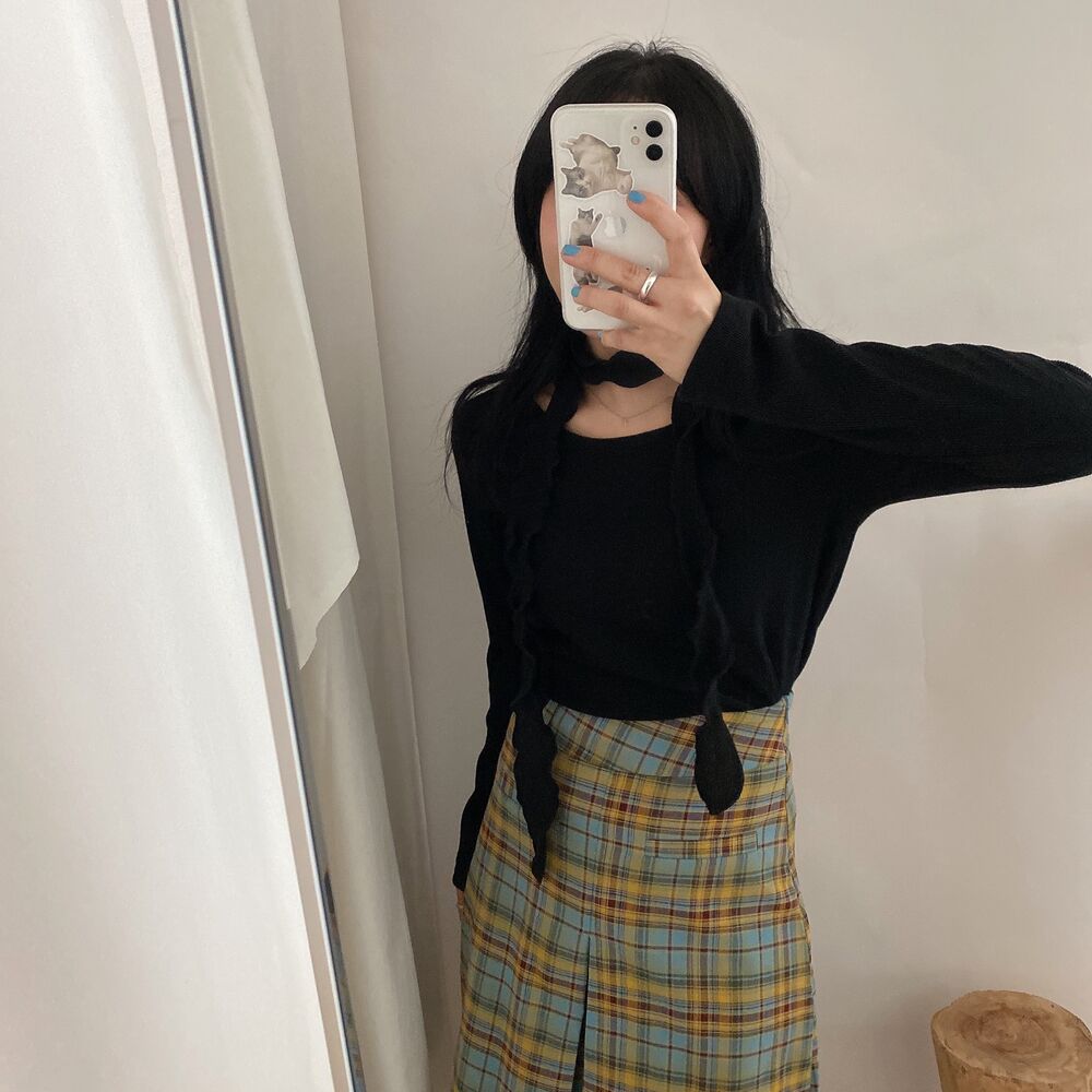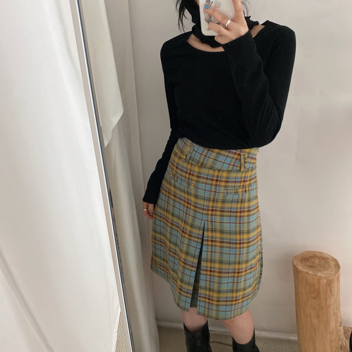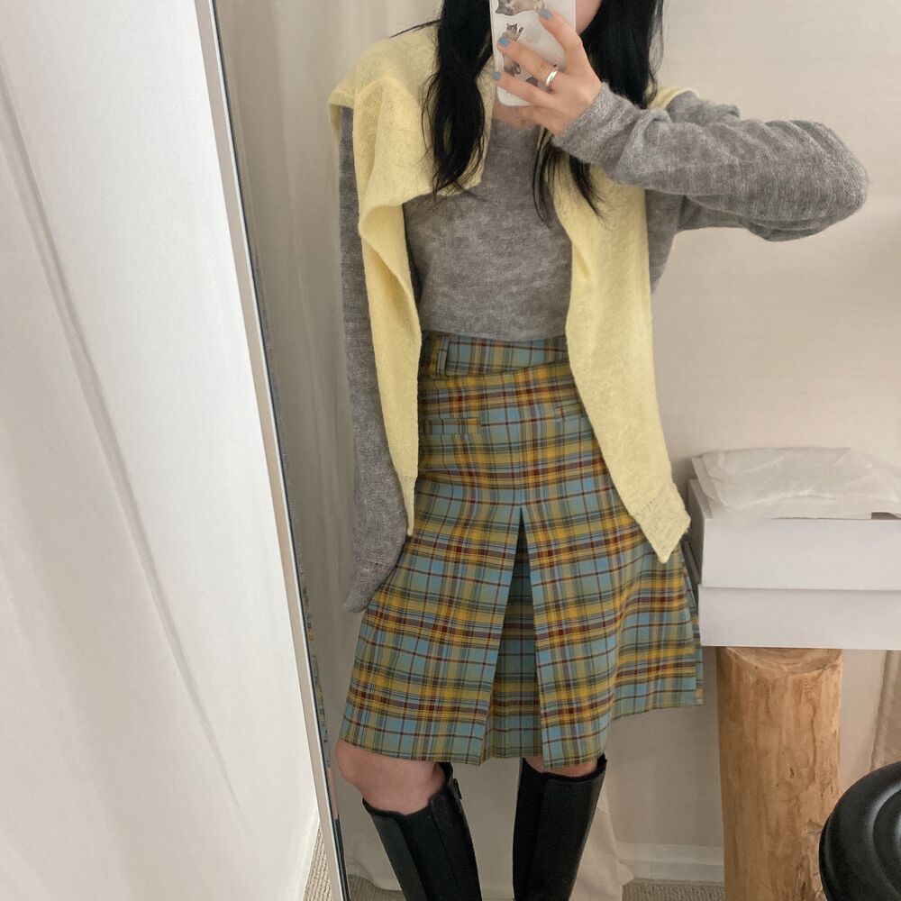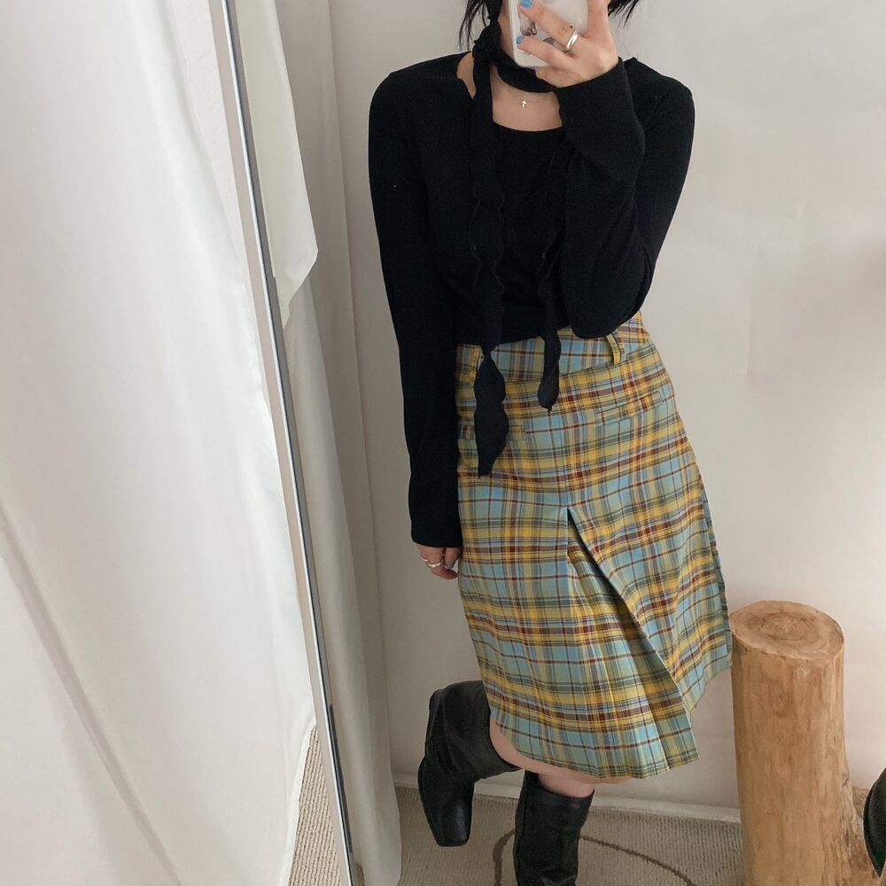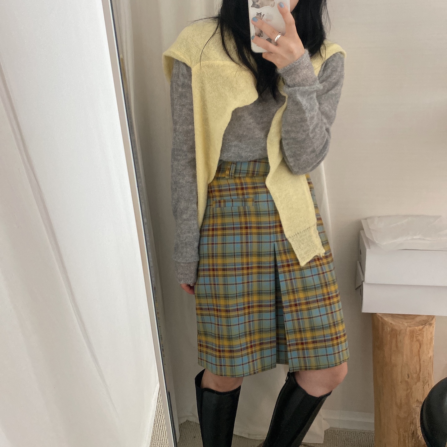 ハイティーンスクールチェック黄色いタック入りミディスカート