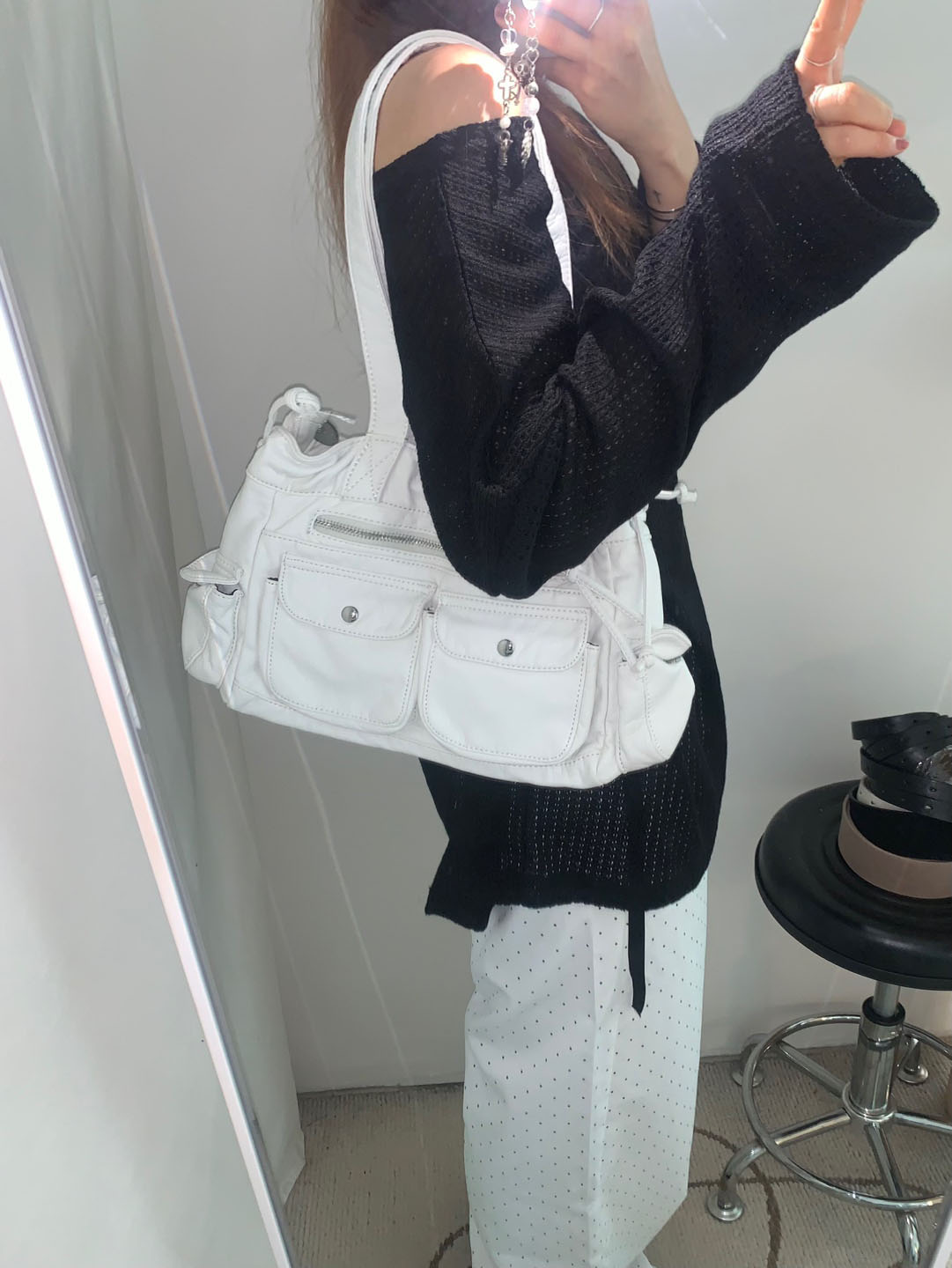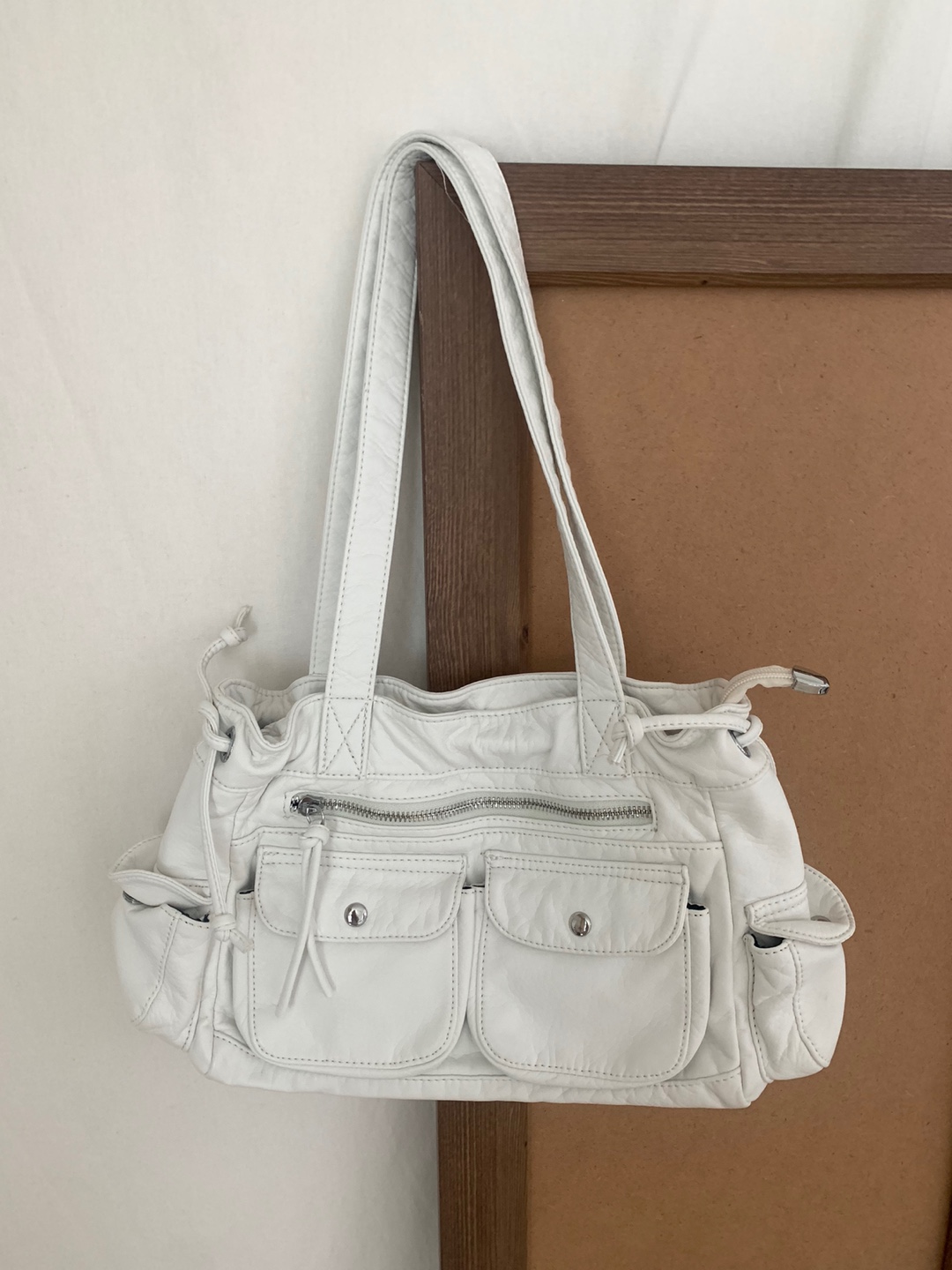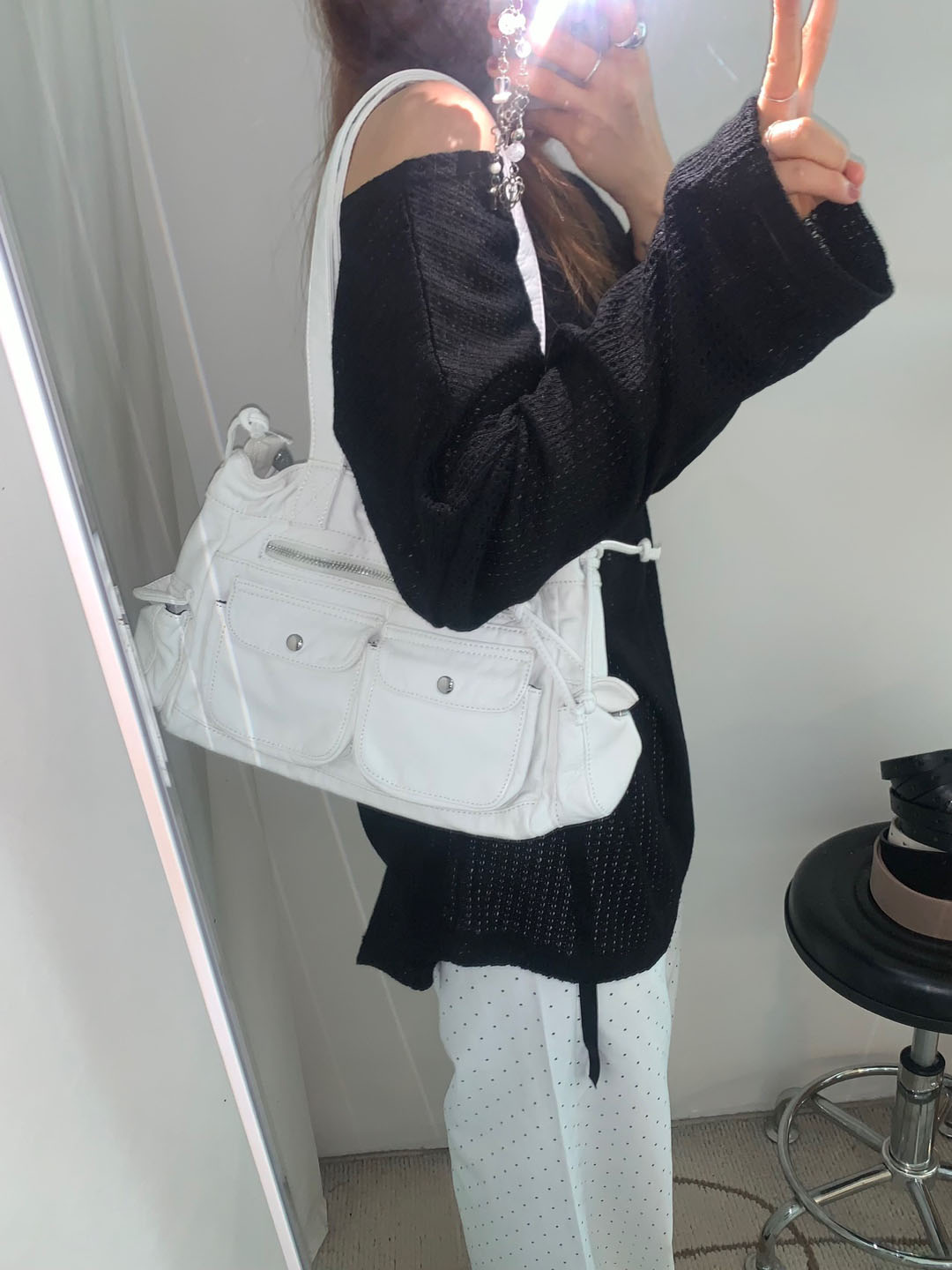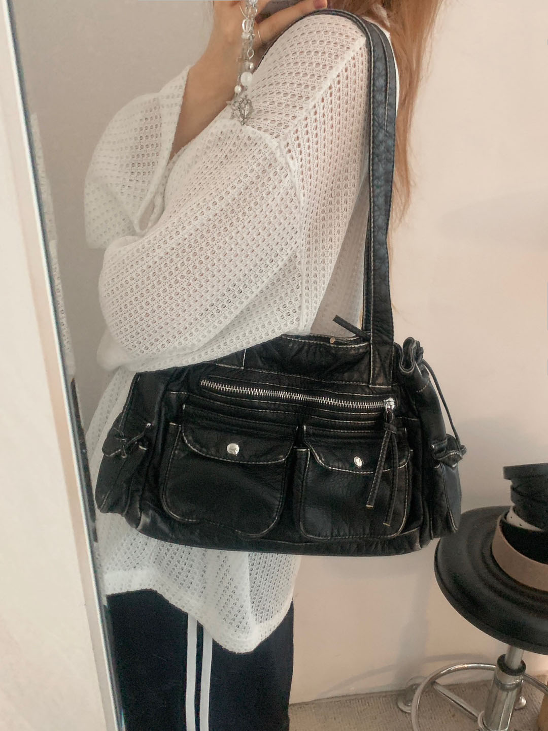 ダブルジップアップポケットレザーストリングショルダーバッグ