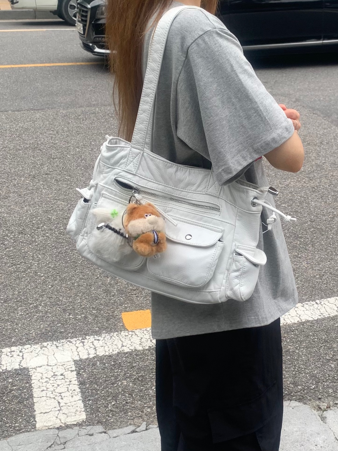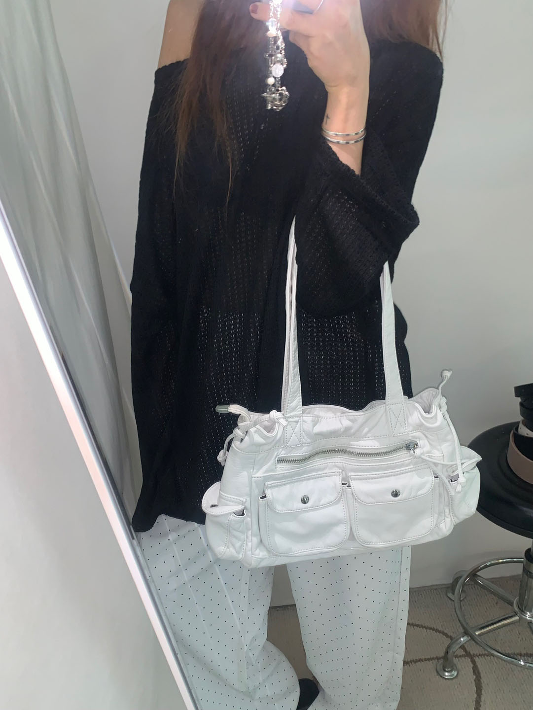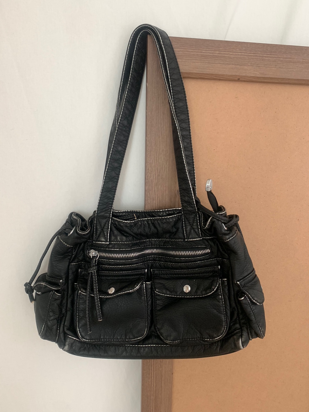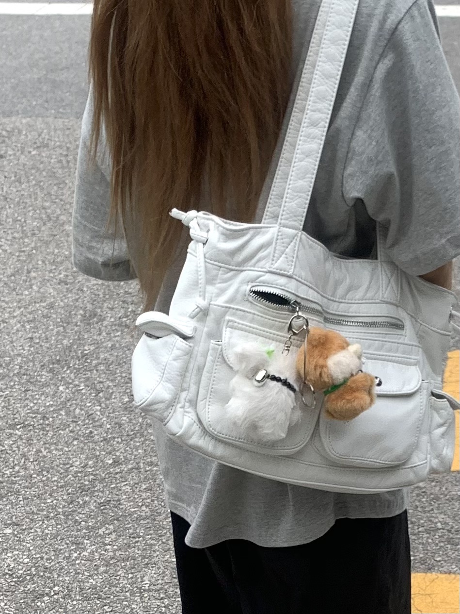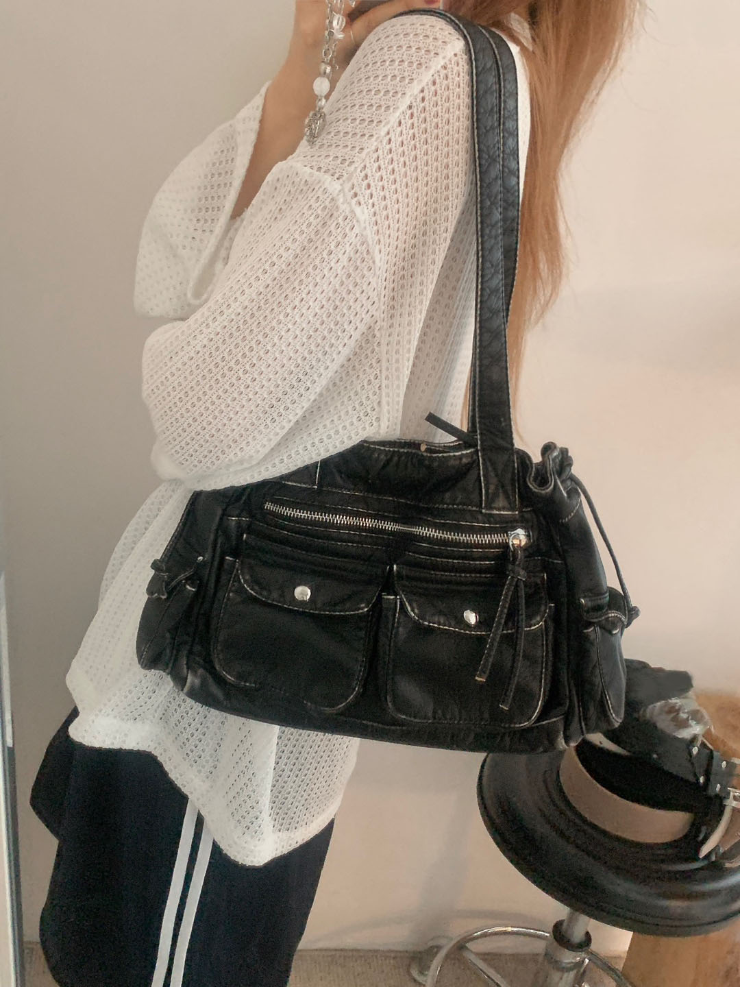 ダブルジップアップポケットレザーストリングショルダーバッグ