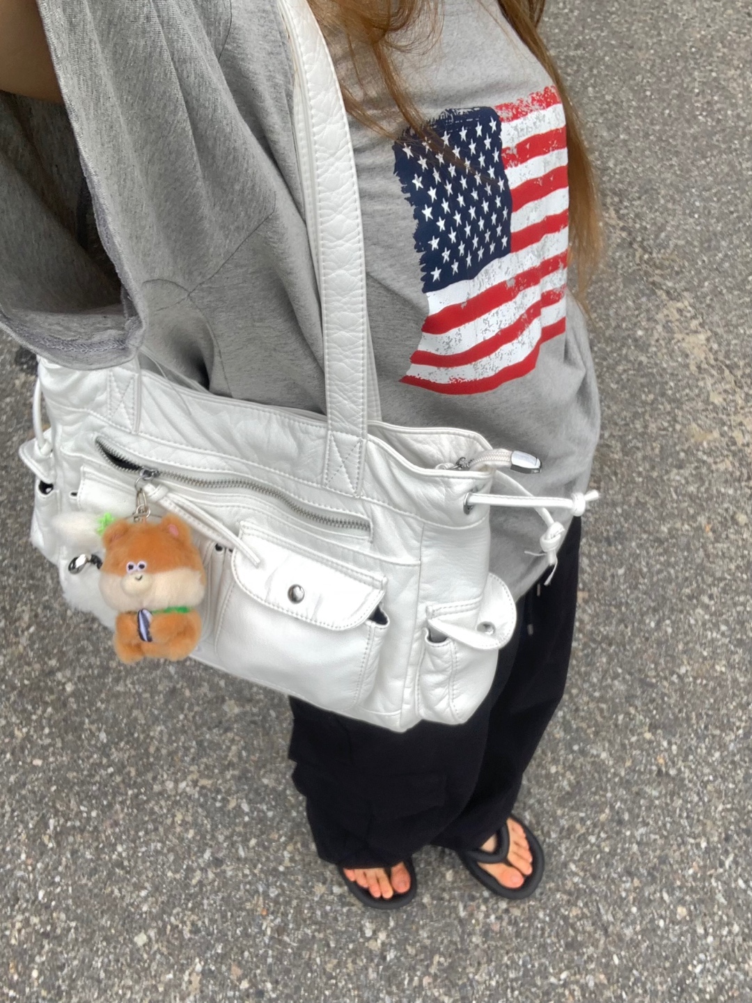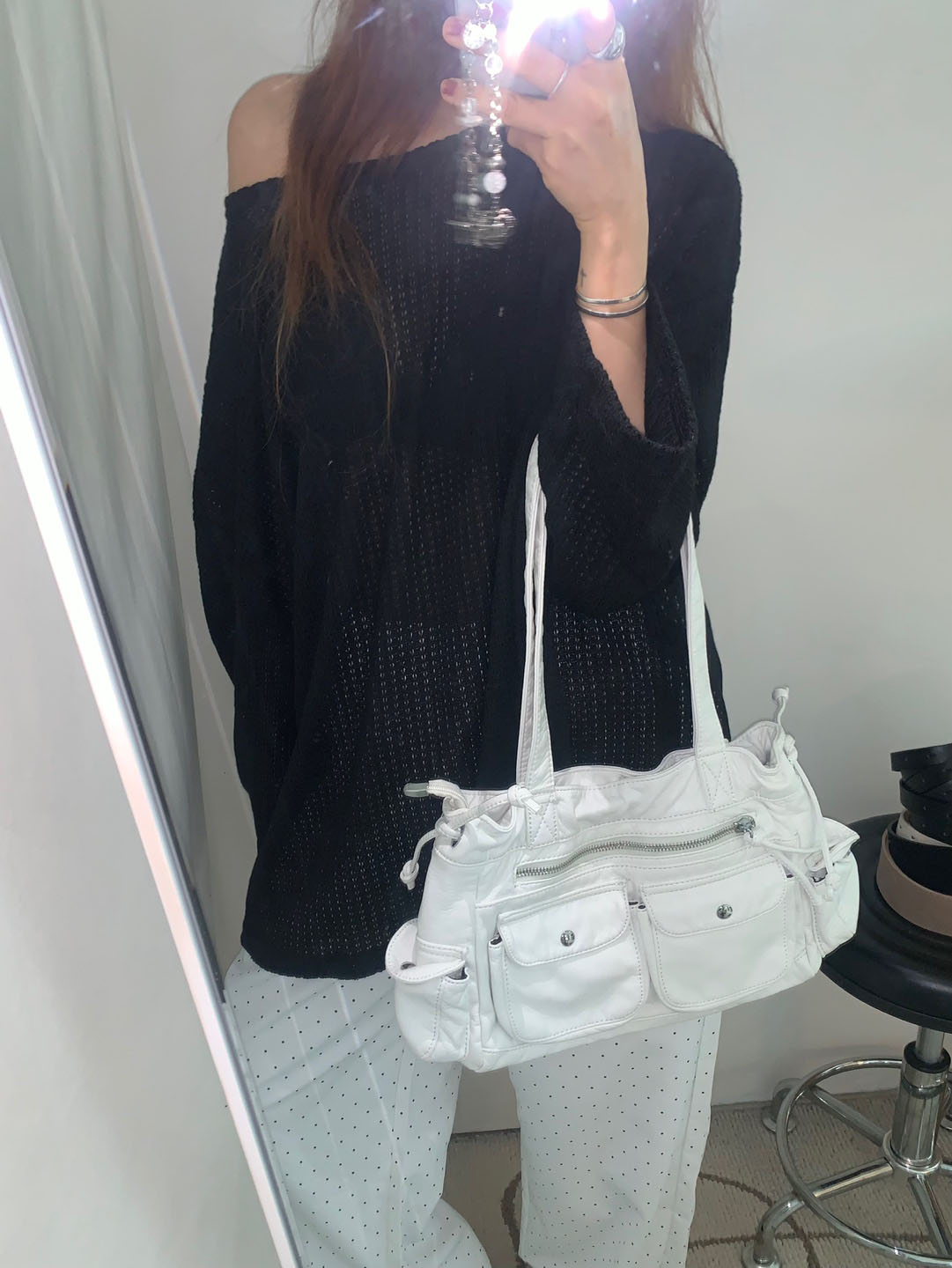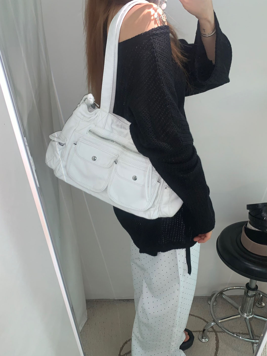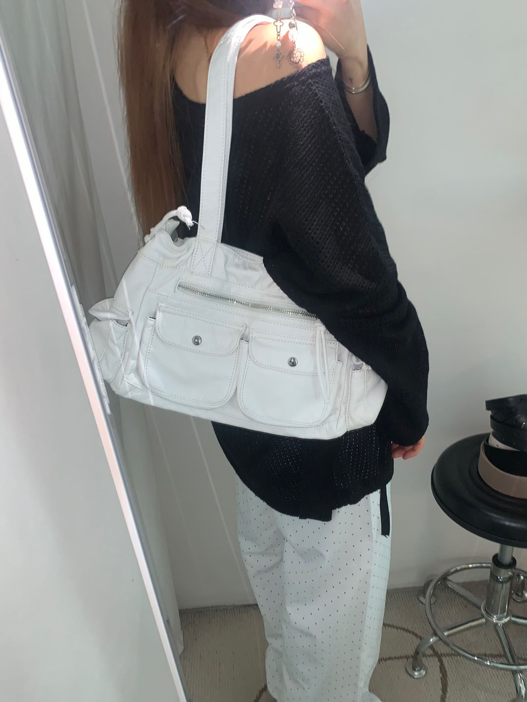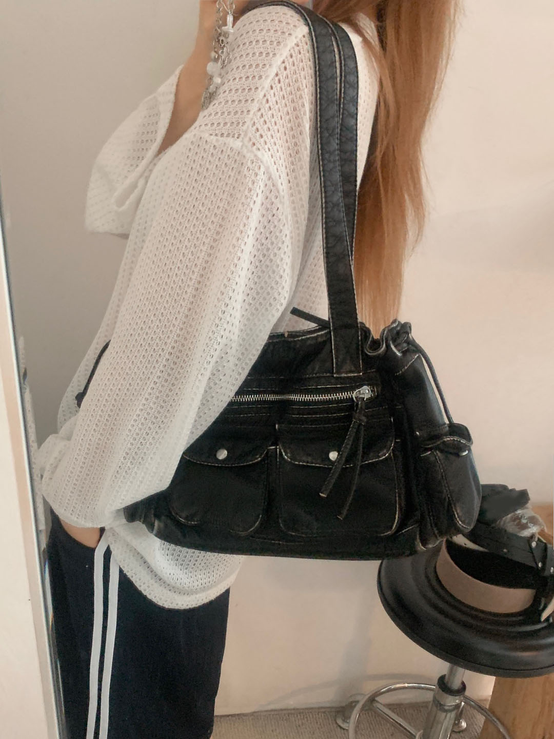 ダブルジップアップポケットレザーストリングショルダーバッグ