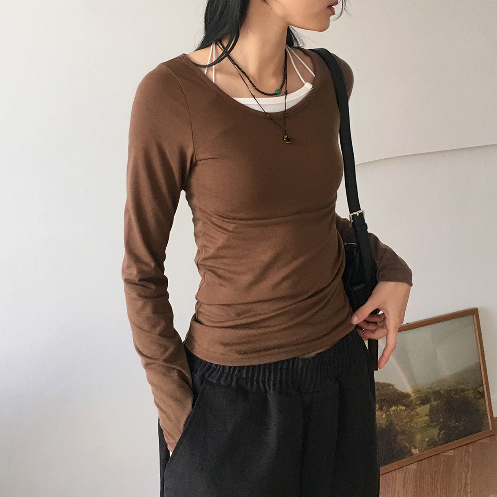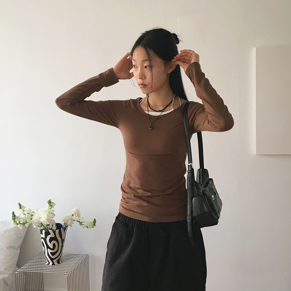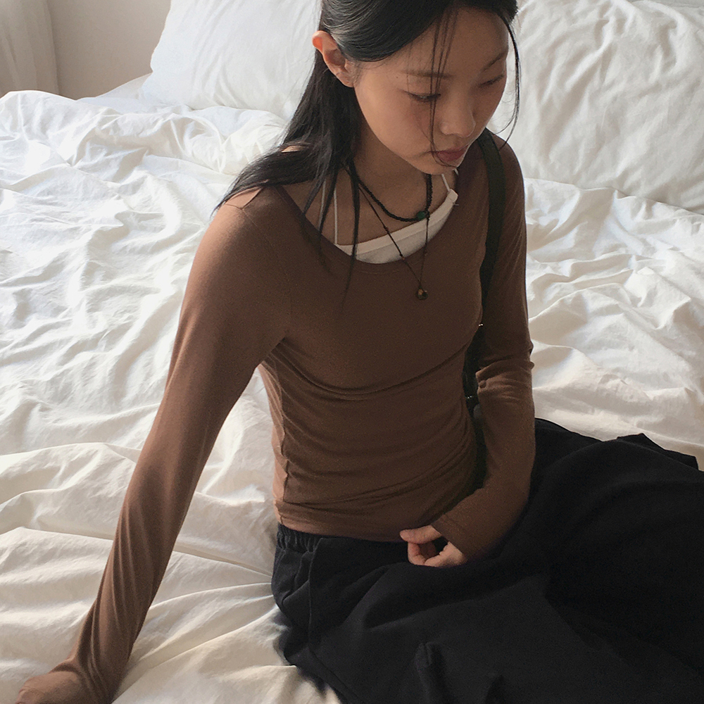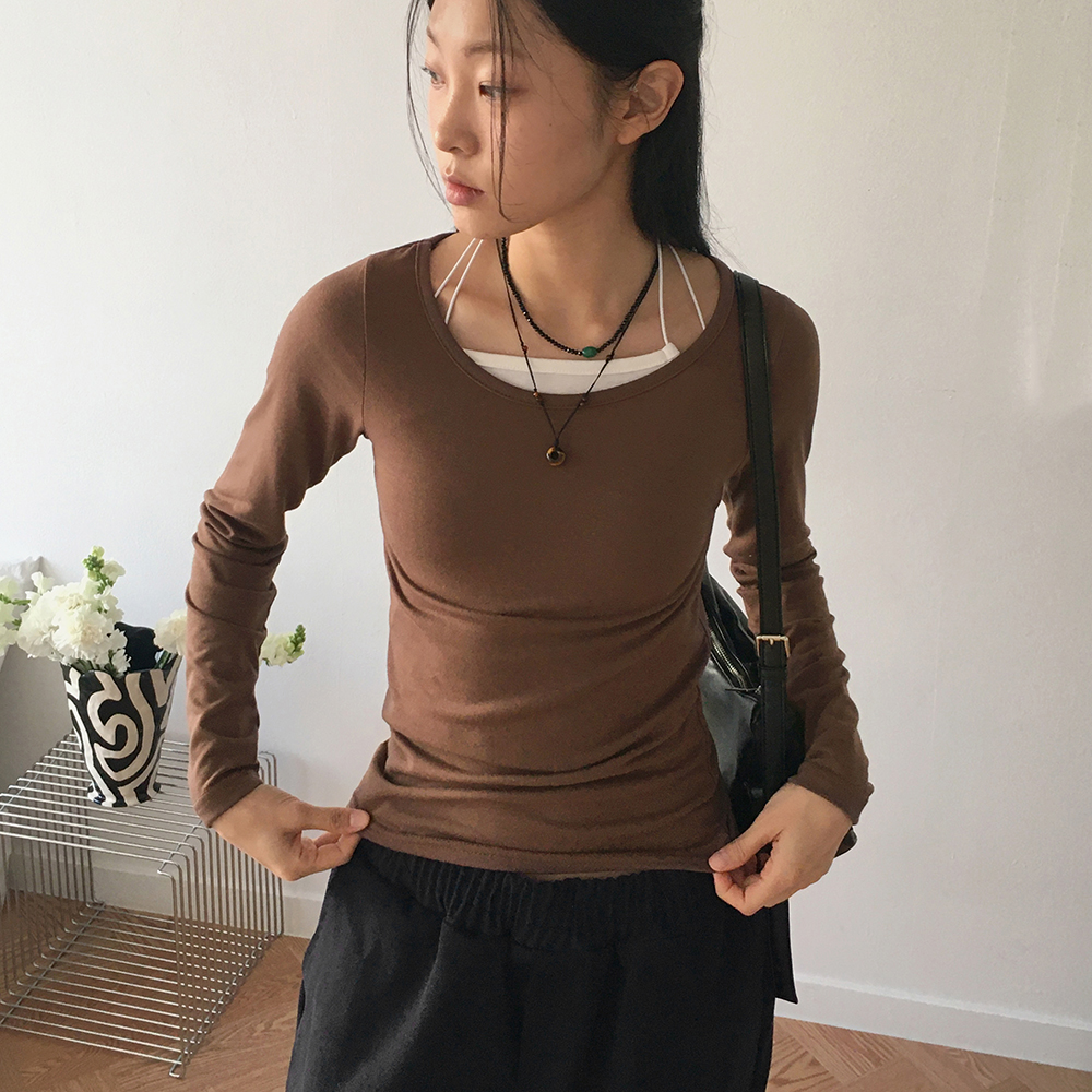 [裏地起毛] 無地レイヤードスリムUネック長袖Tシャツ