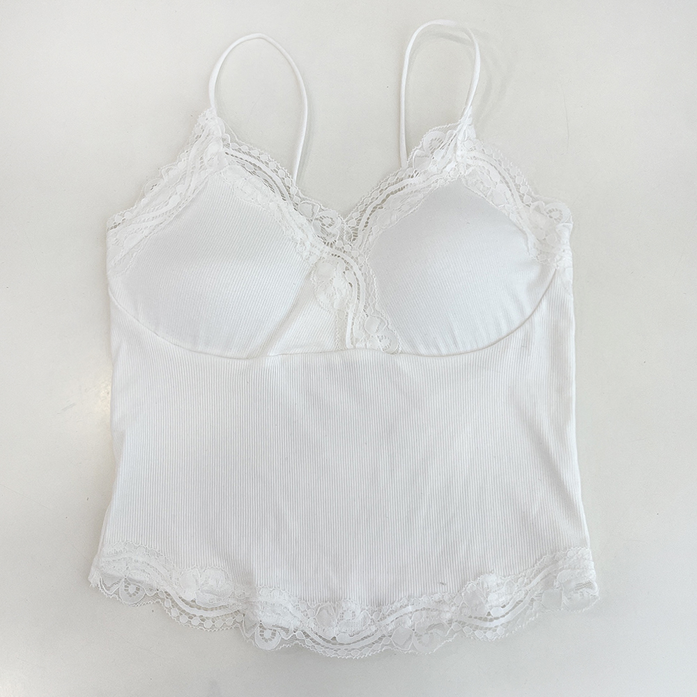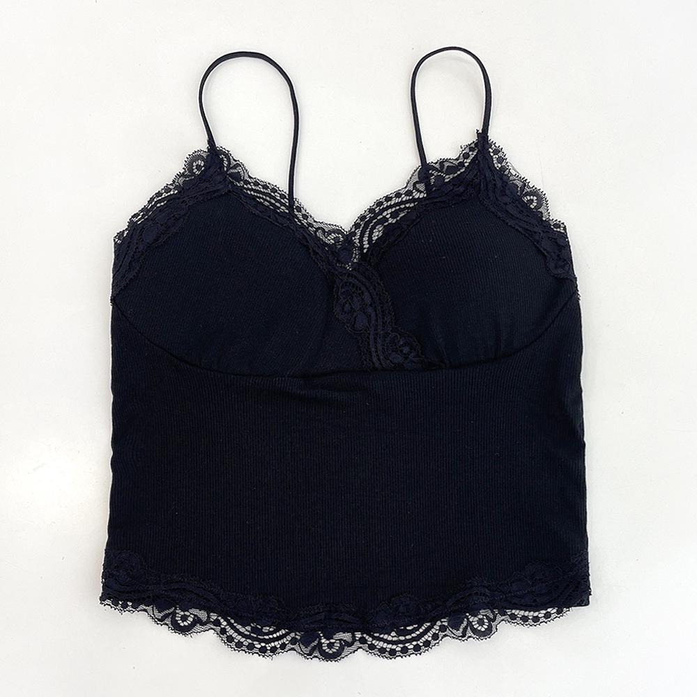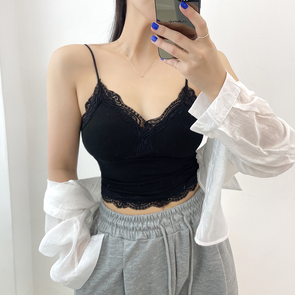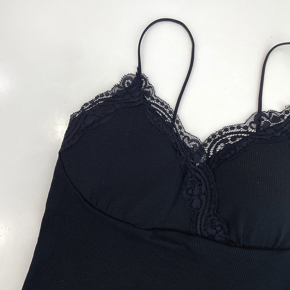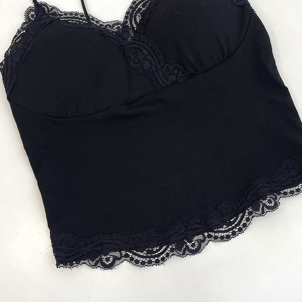[パッド付き] レースリブクロップドノースリーブ