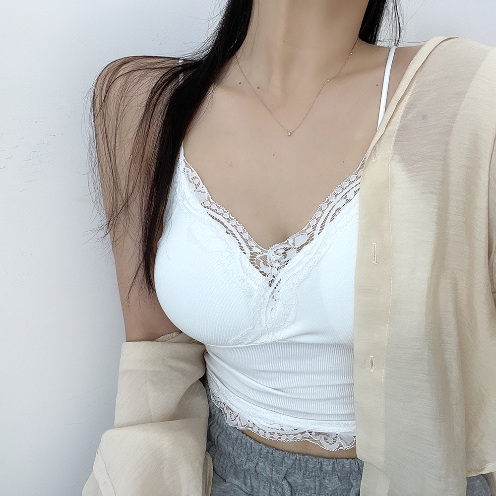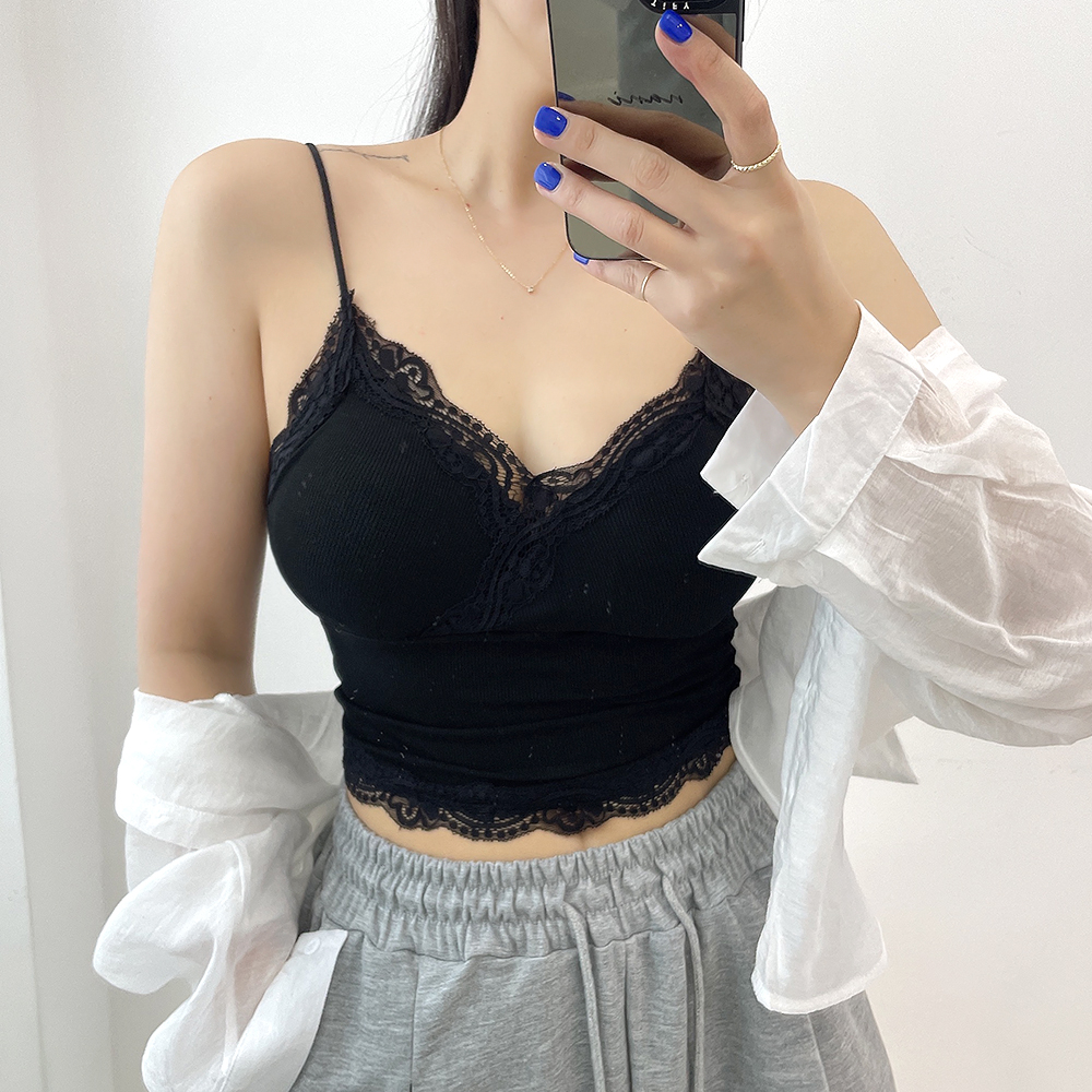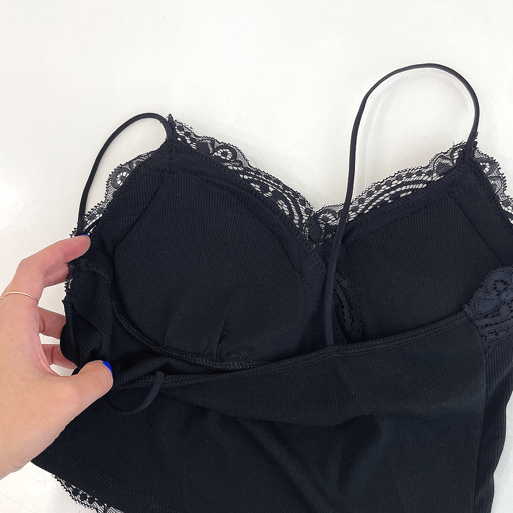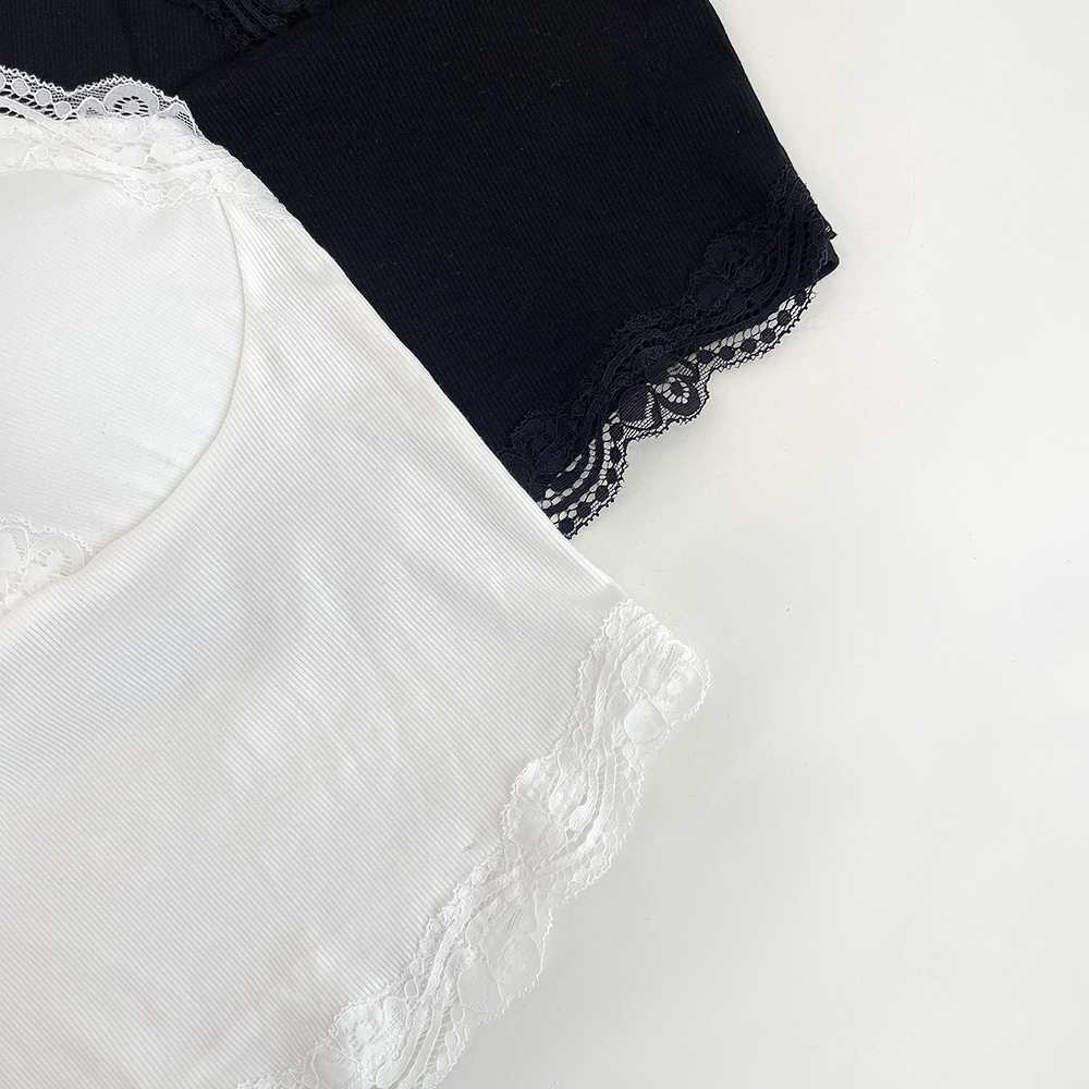 [パッド付き] レースリブクロップドノースリーブ