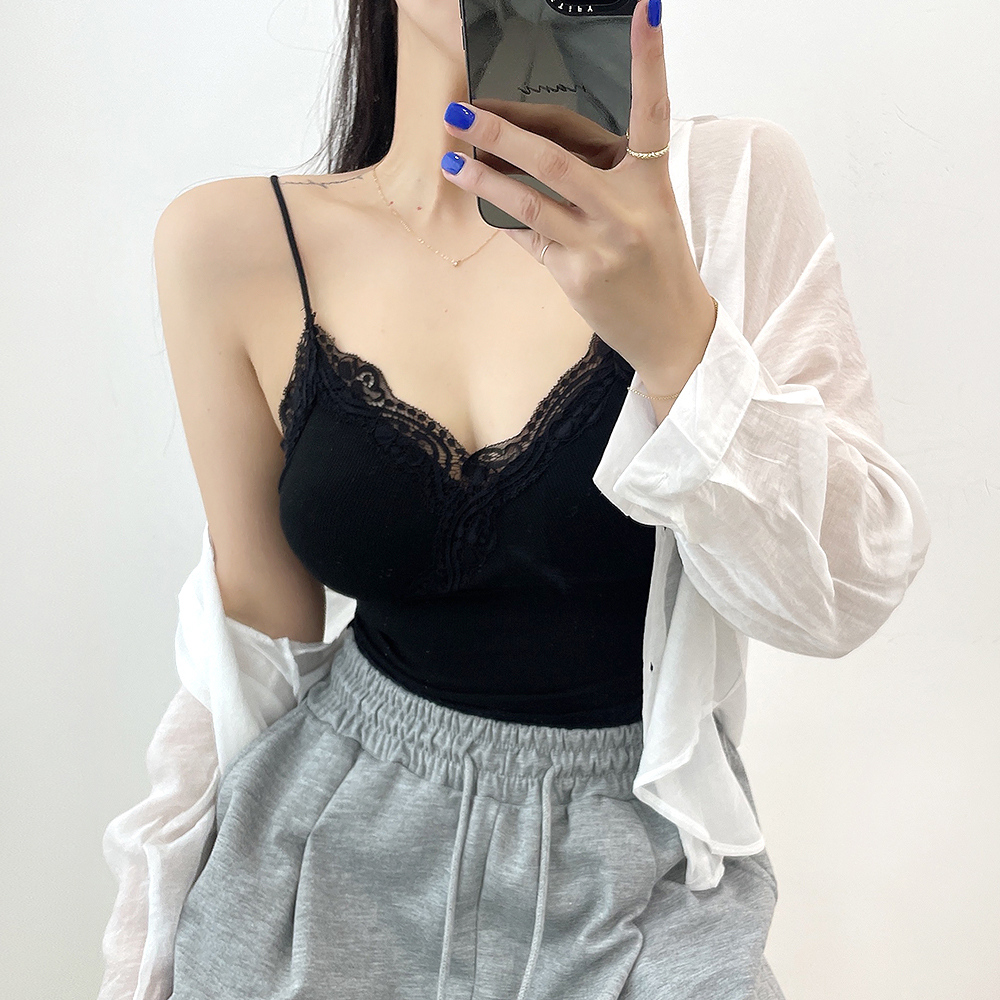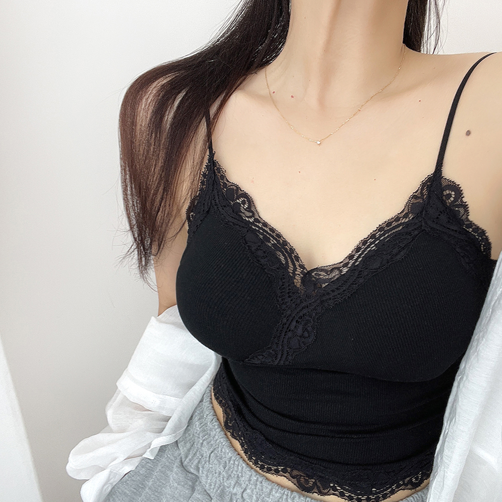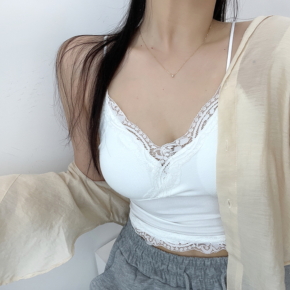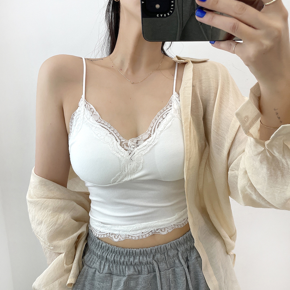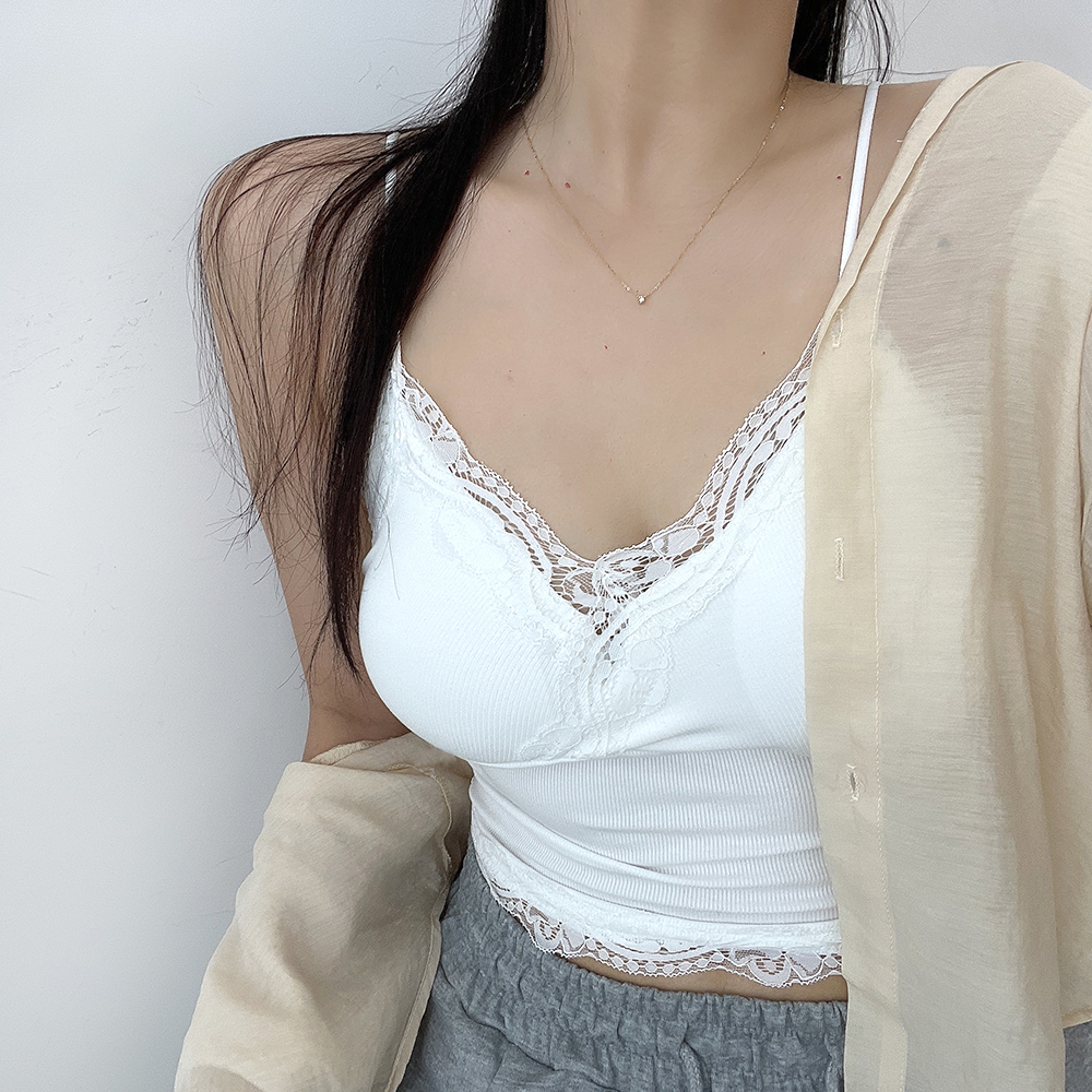 [パッド付き] レースリブクロップドノースリーブ