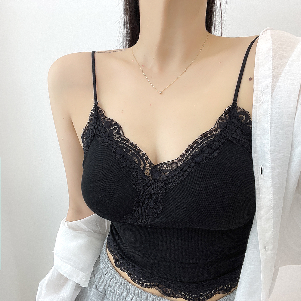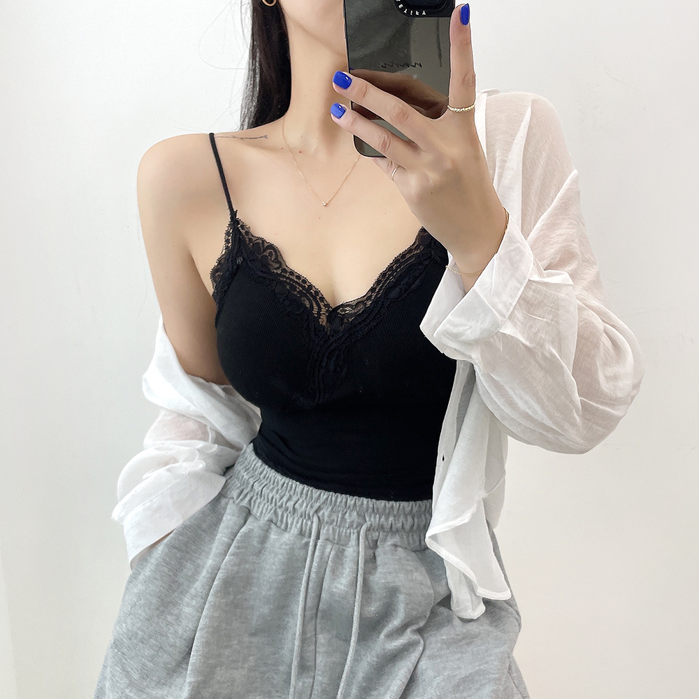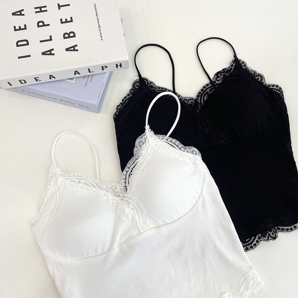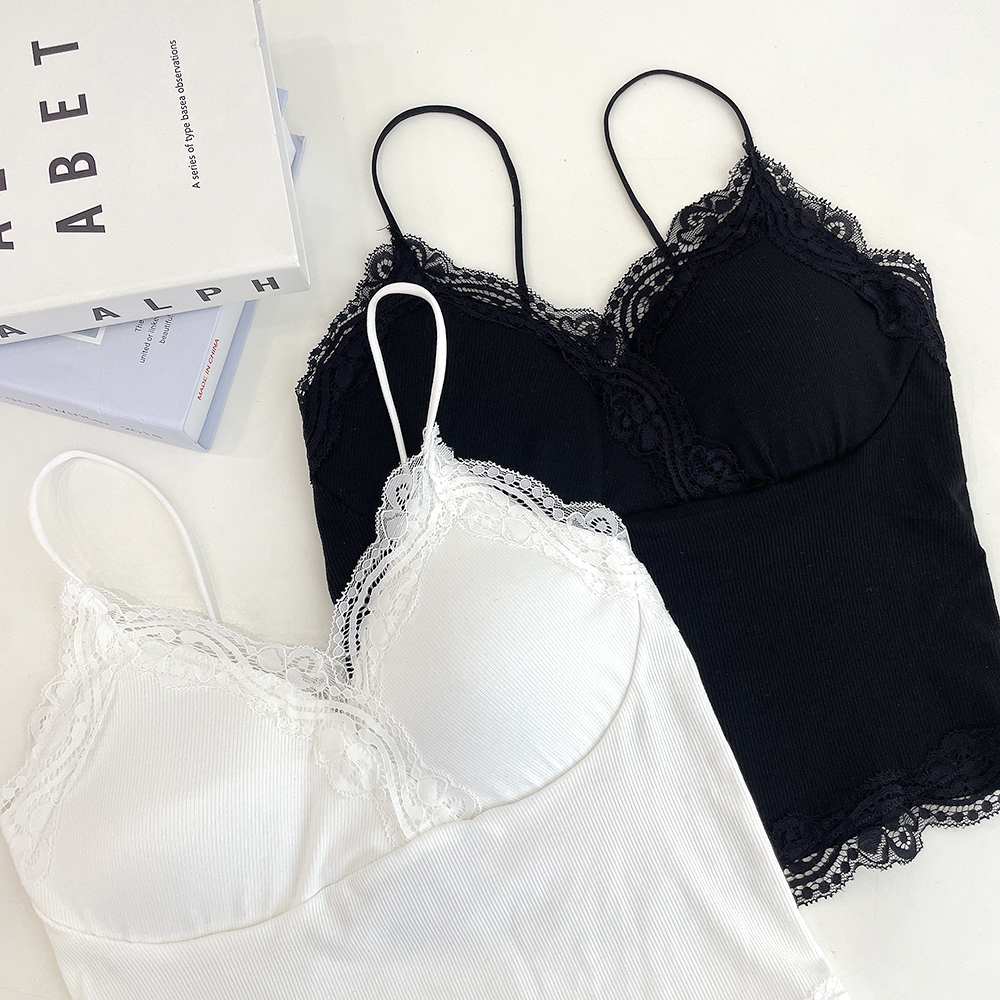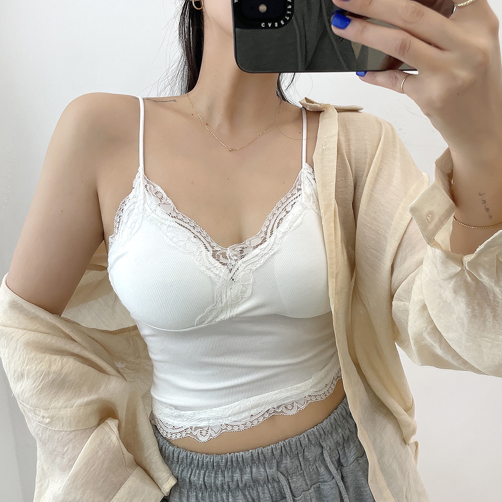 [パッド付き] レースリブクロップドノースリーブ