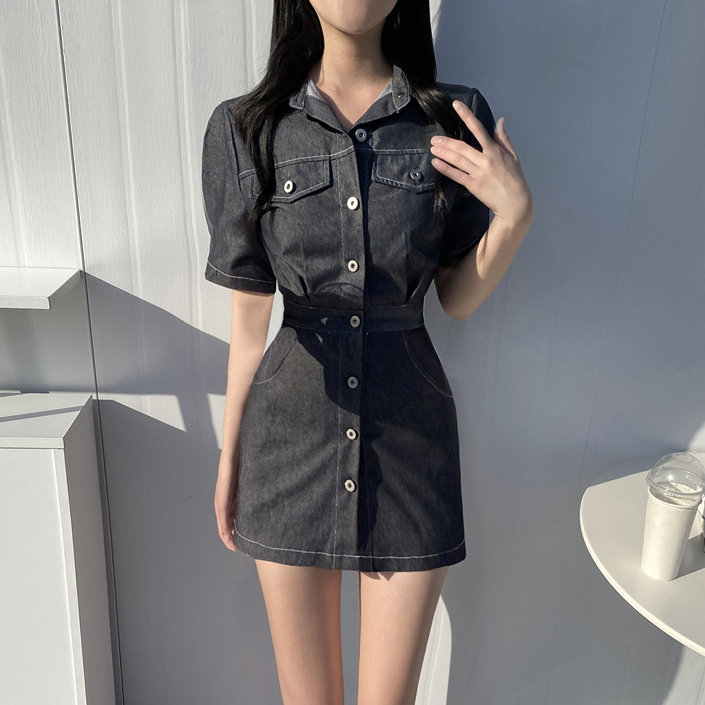 デニムボタン半袖バックゴムミニワンピース