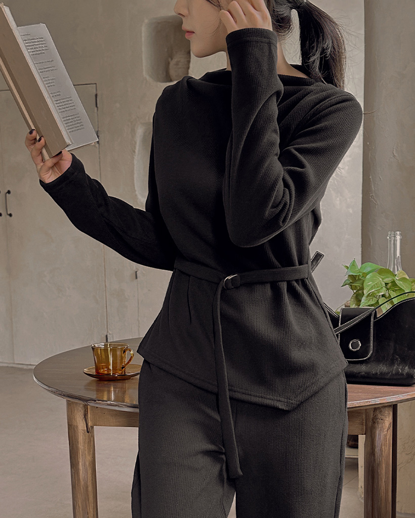 リブピンタックストラップトップス&ウエストゴムパンツツーピース上下セット