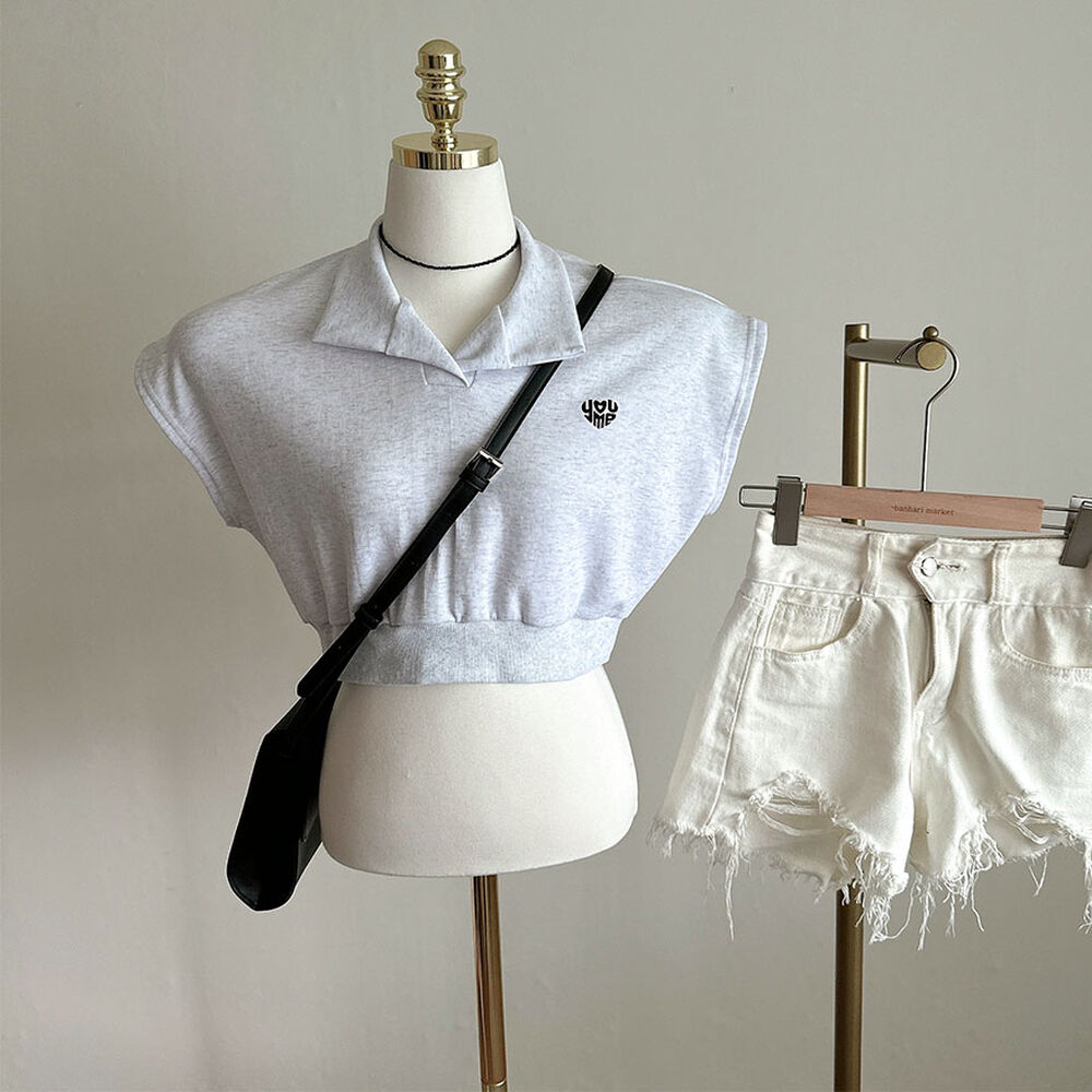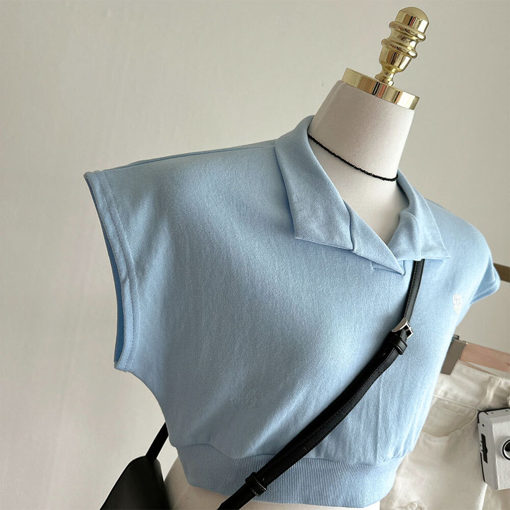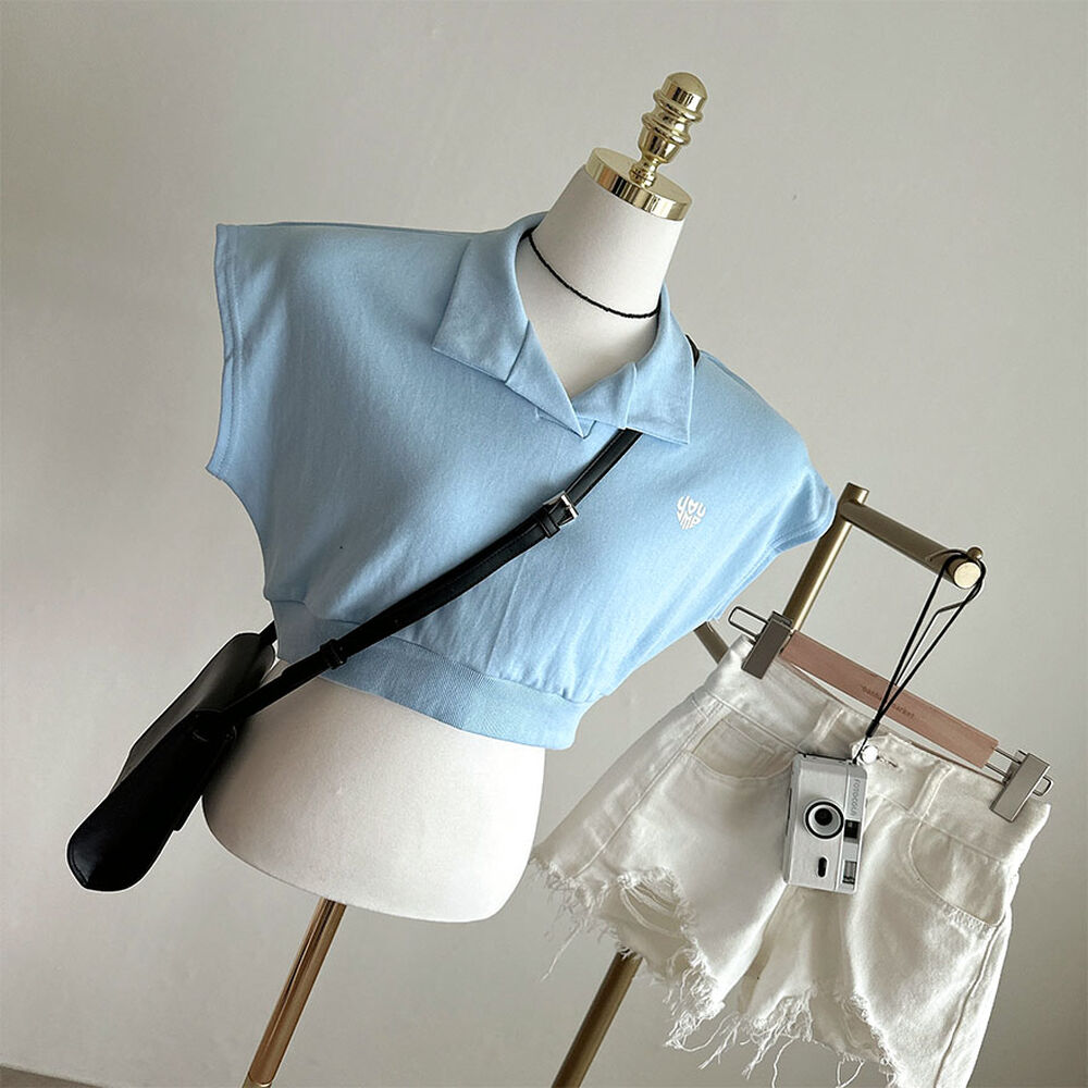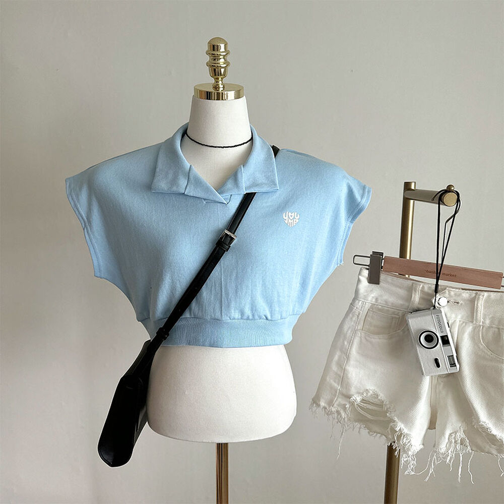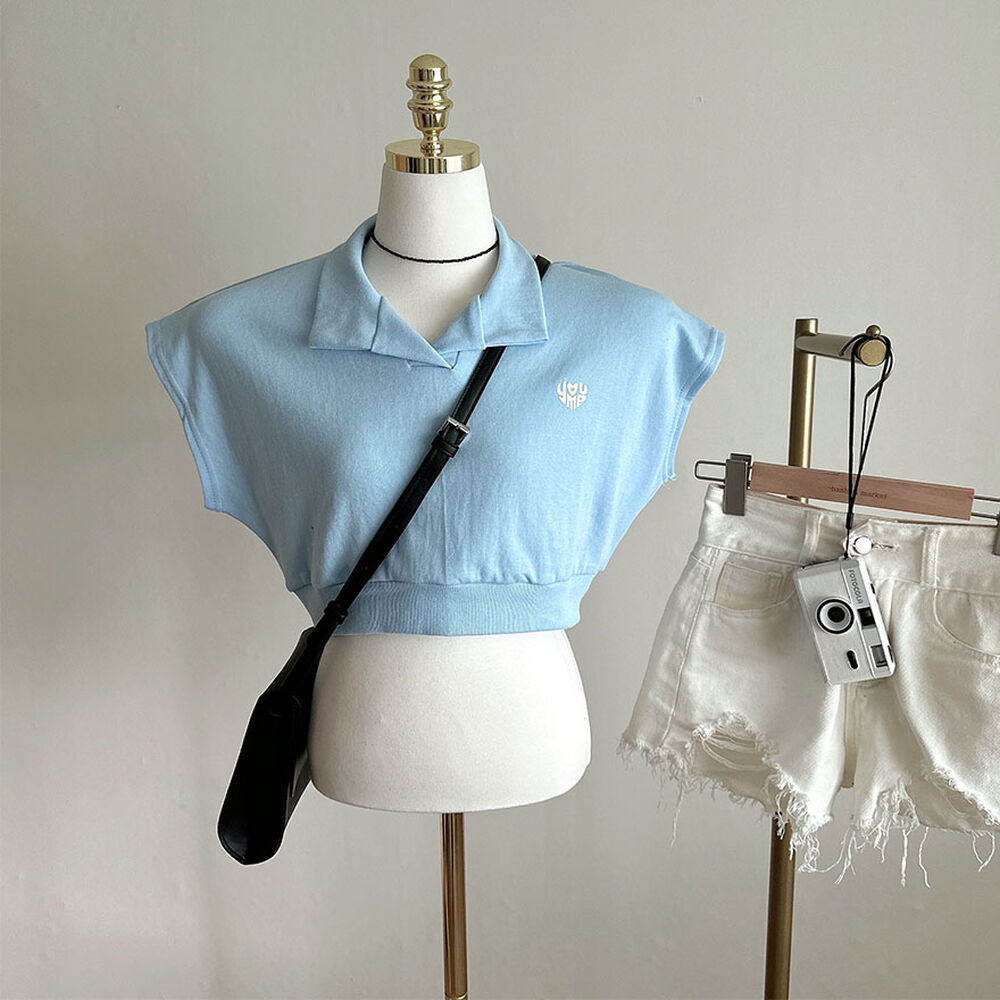 オープンカラーネッククロップドノースリーブTシャツ
