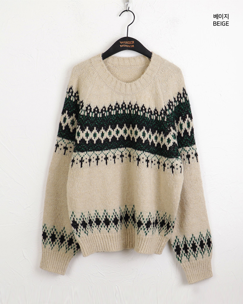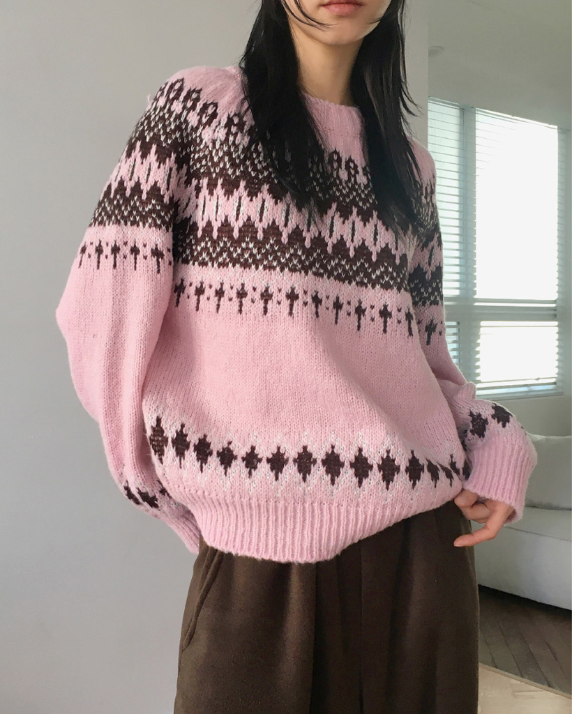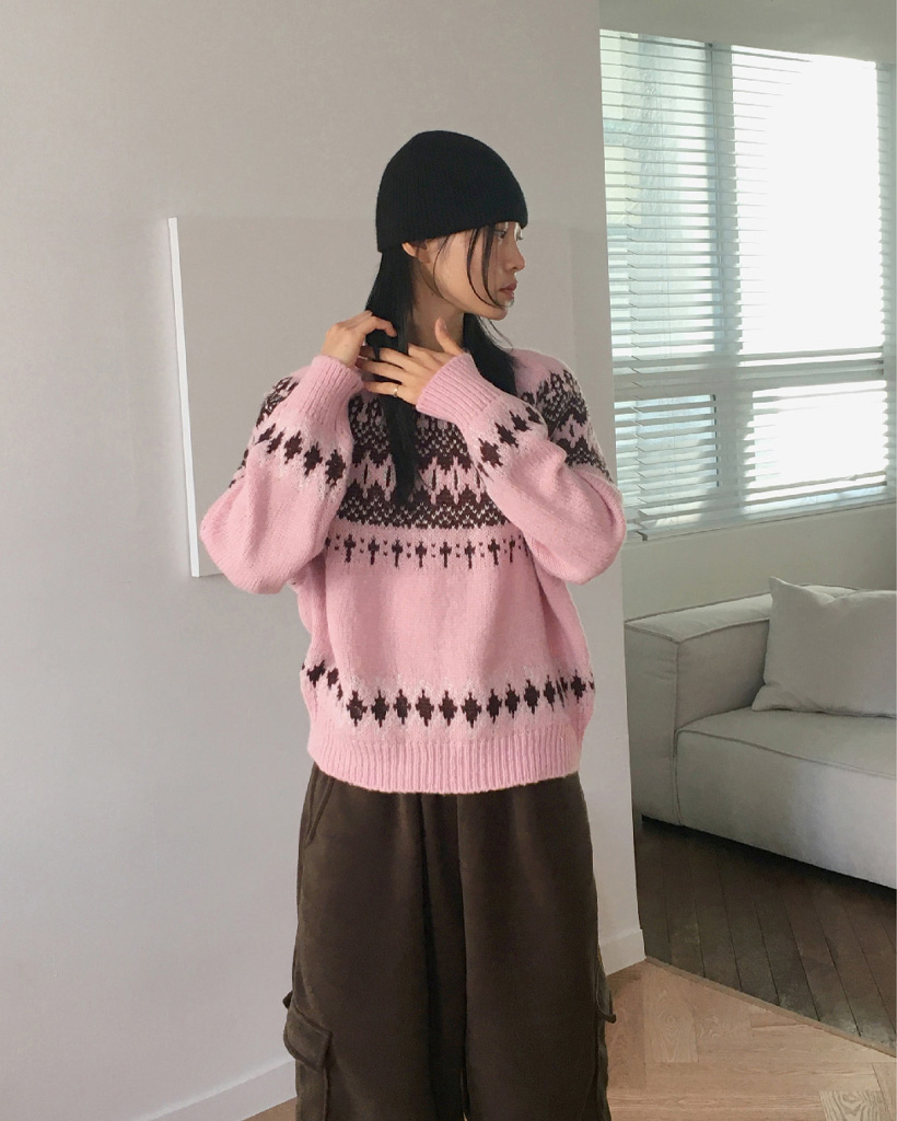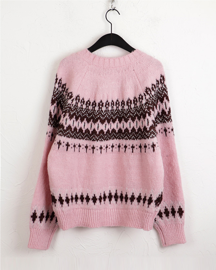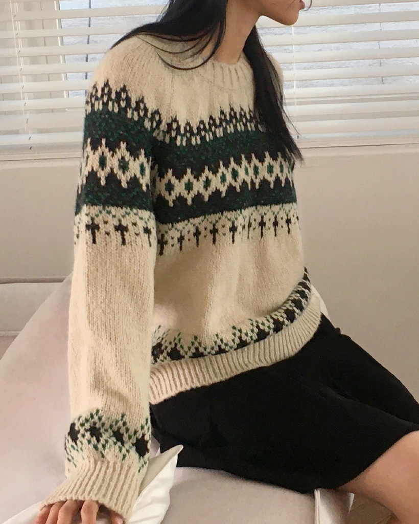 ヴィンテージノルディック柄ラウンド長袖ニット