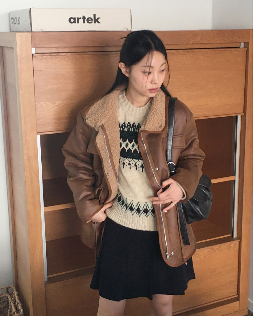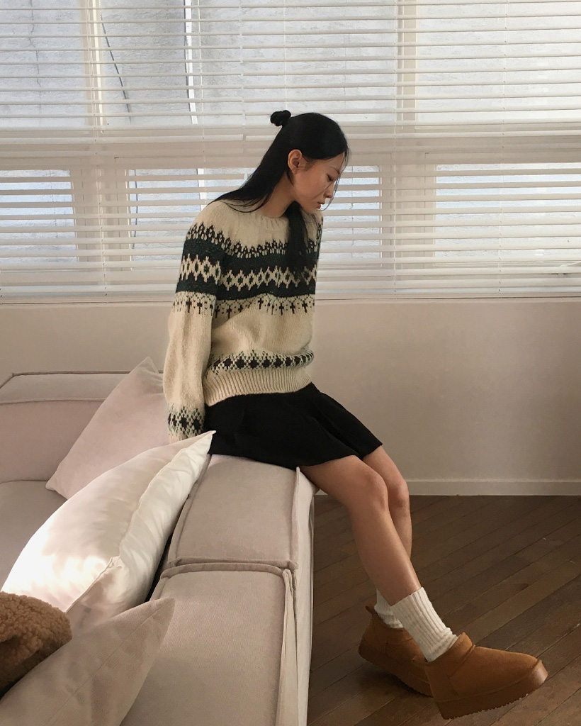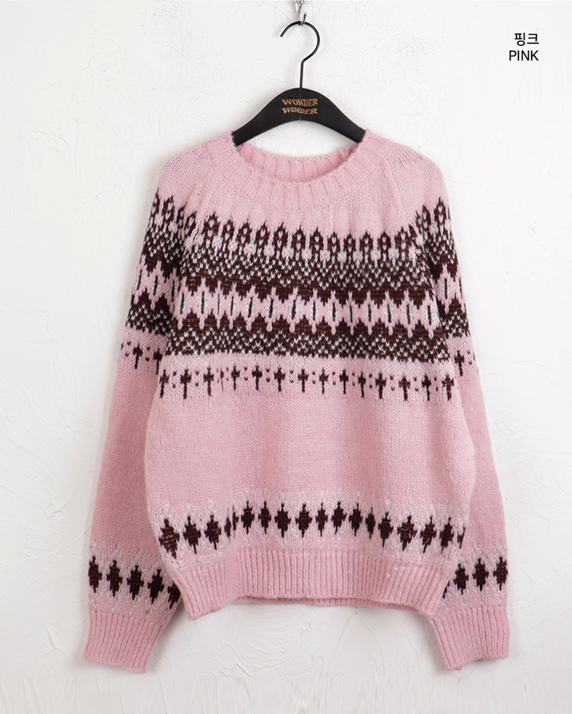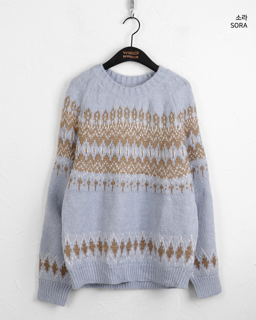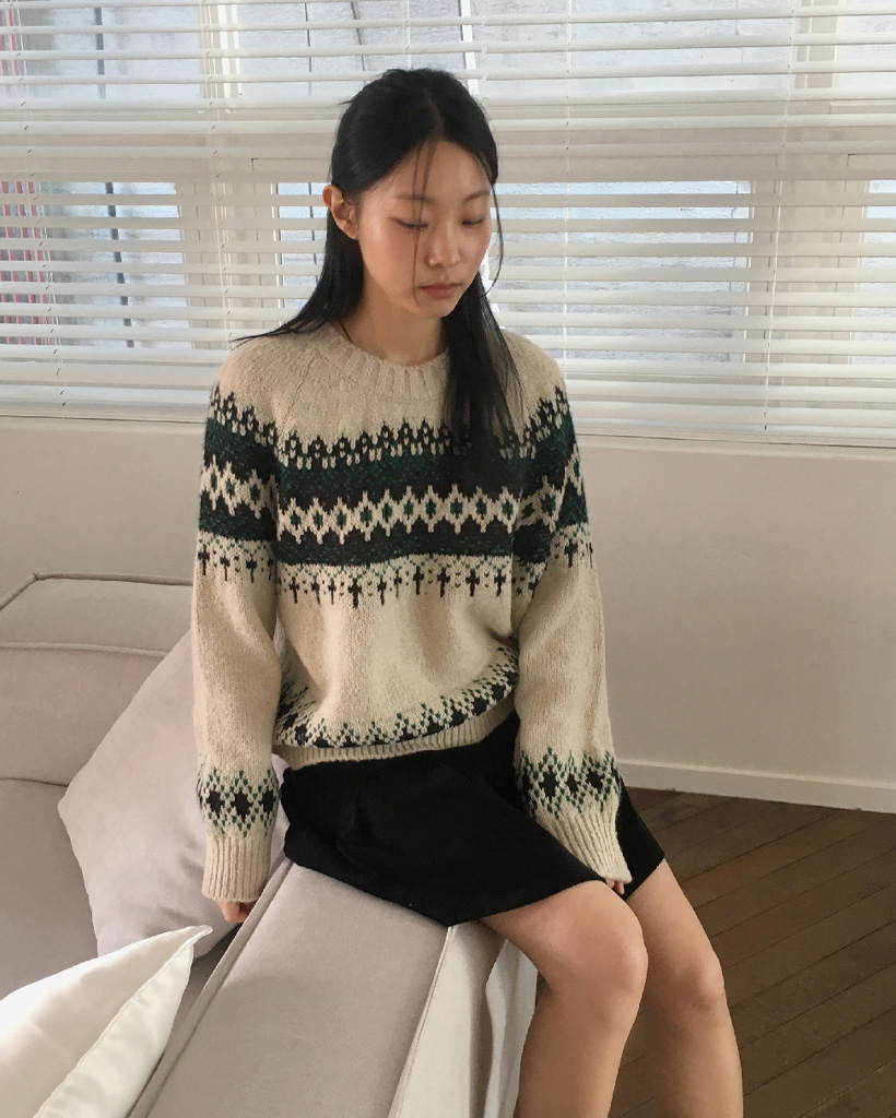 ヴィンテージノルディック柄ラウンド長袖ニット