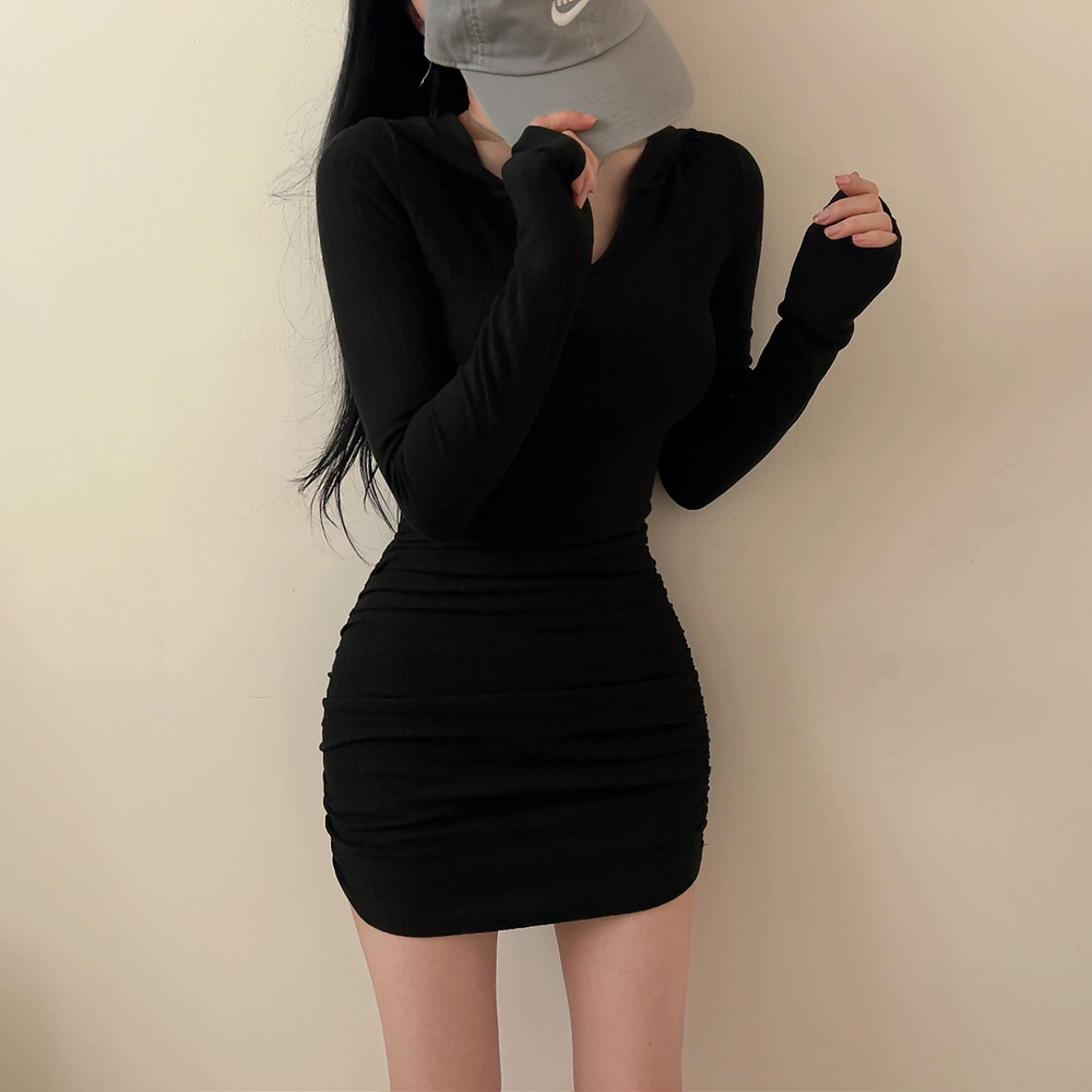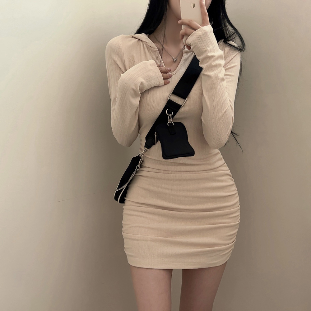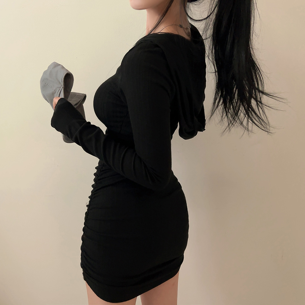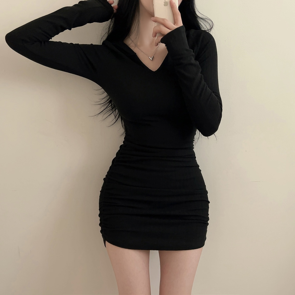 カジュアルリブVネックフード付き長袖サイドシャーリングミニワンピース