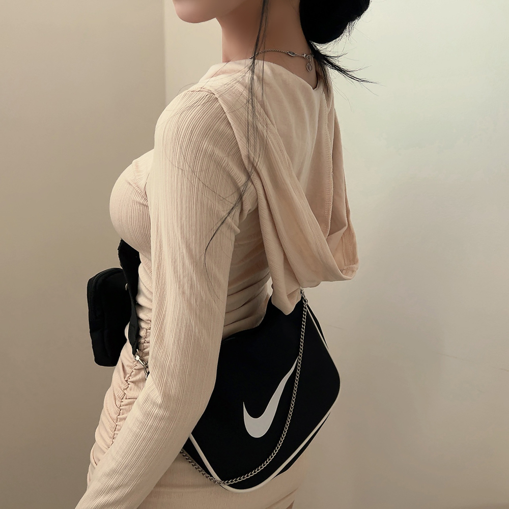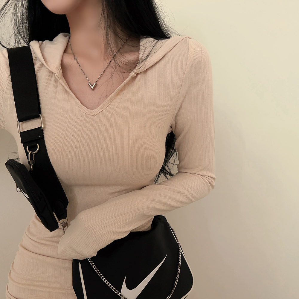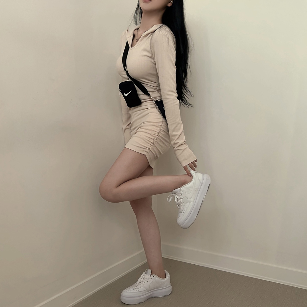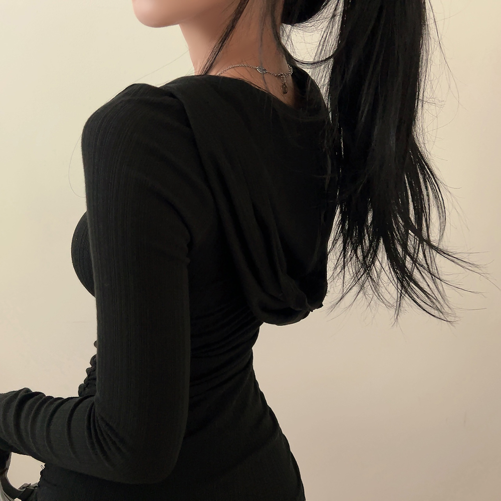カジュアルリブVネックフード付き長袖サイドシャーリングミニワンピース