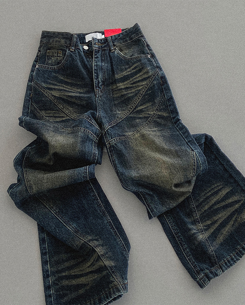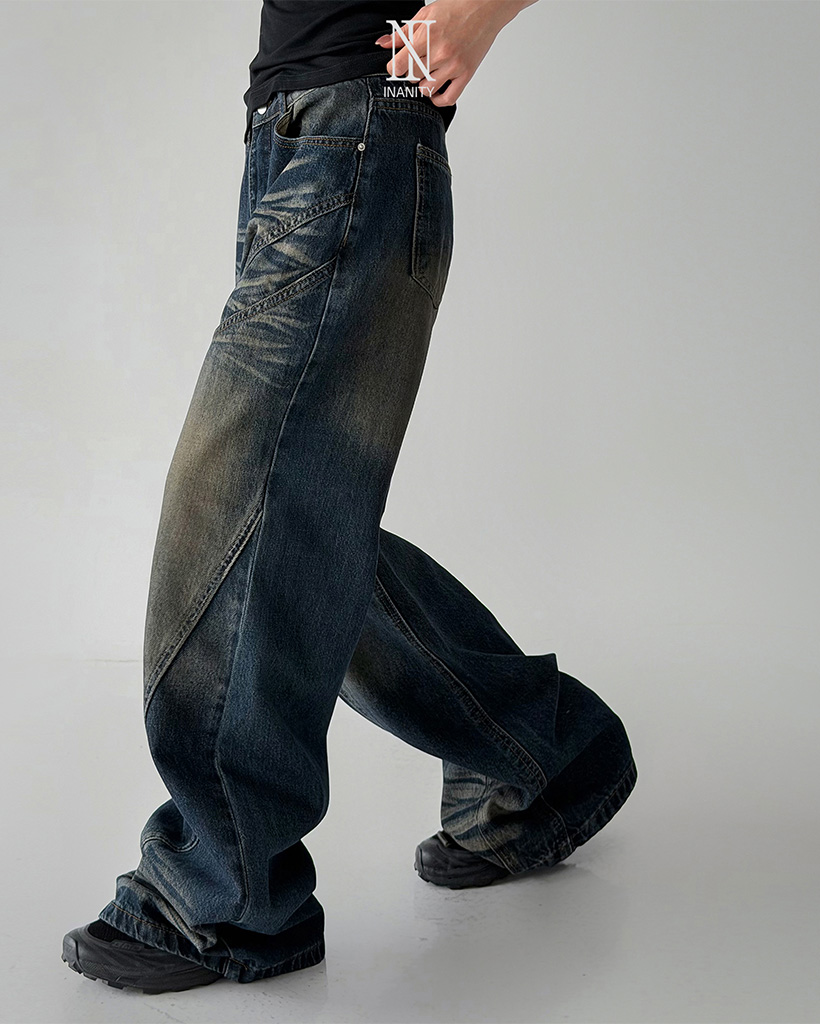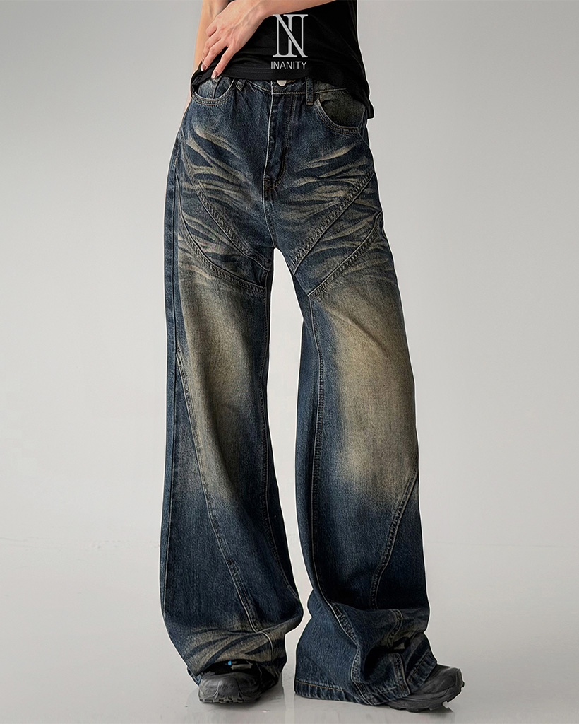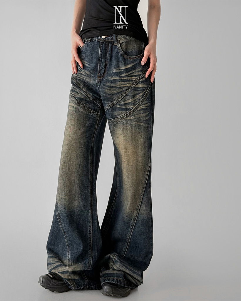 ダブルスリットフレアワイドヴィンテージウォッシュデニムパンツ