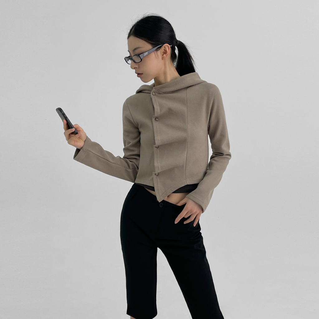 テリングクロップラッフルフードカーディガン