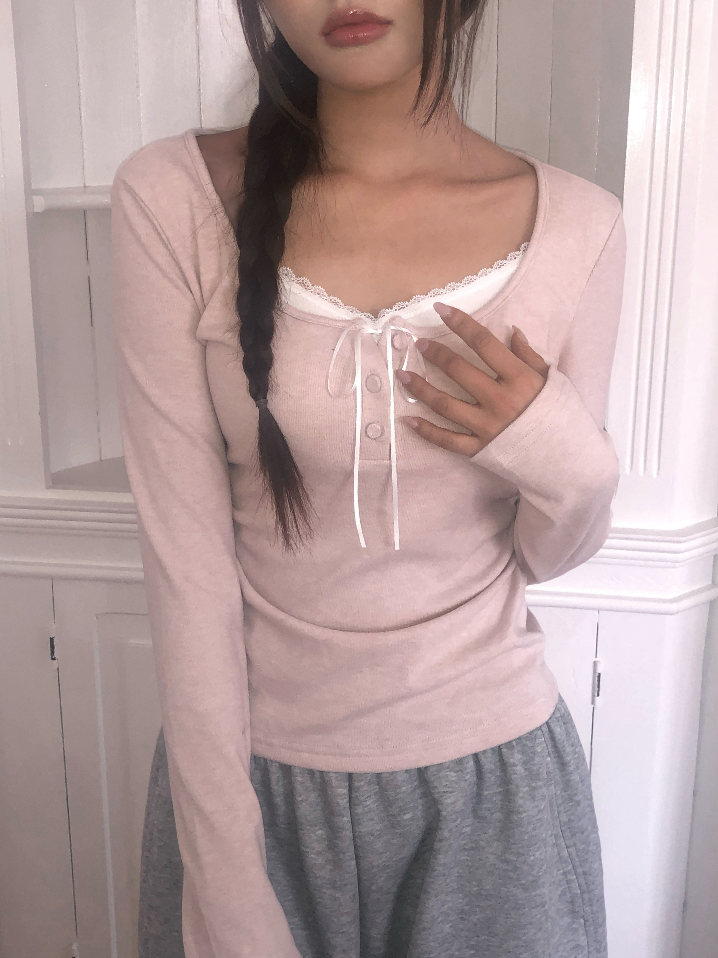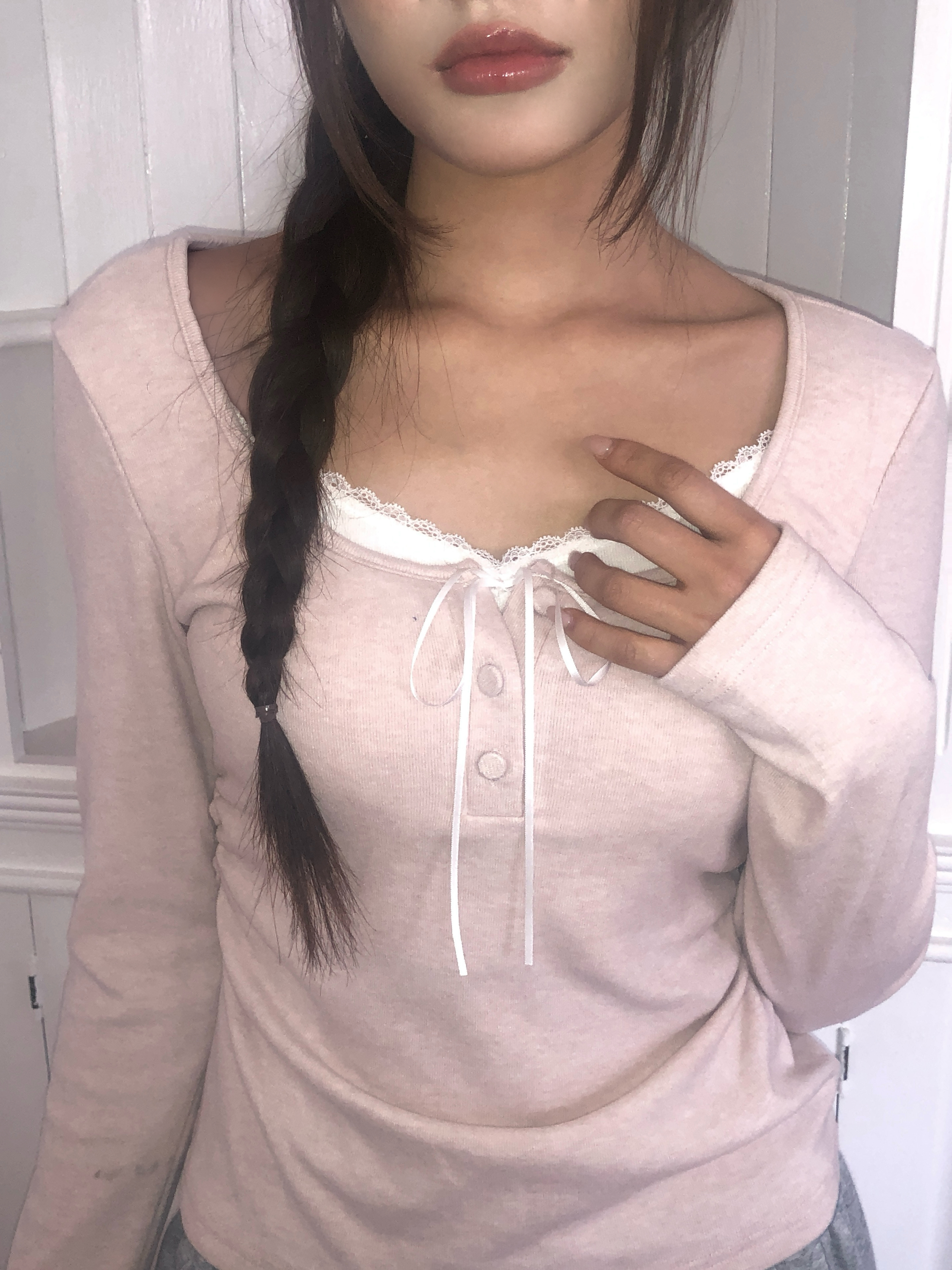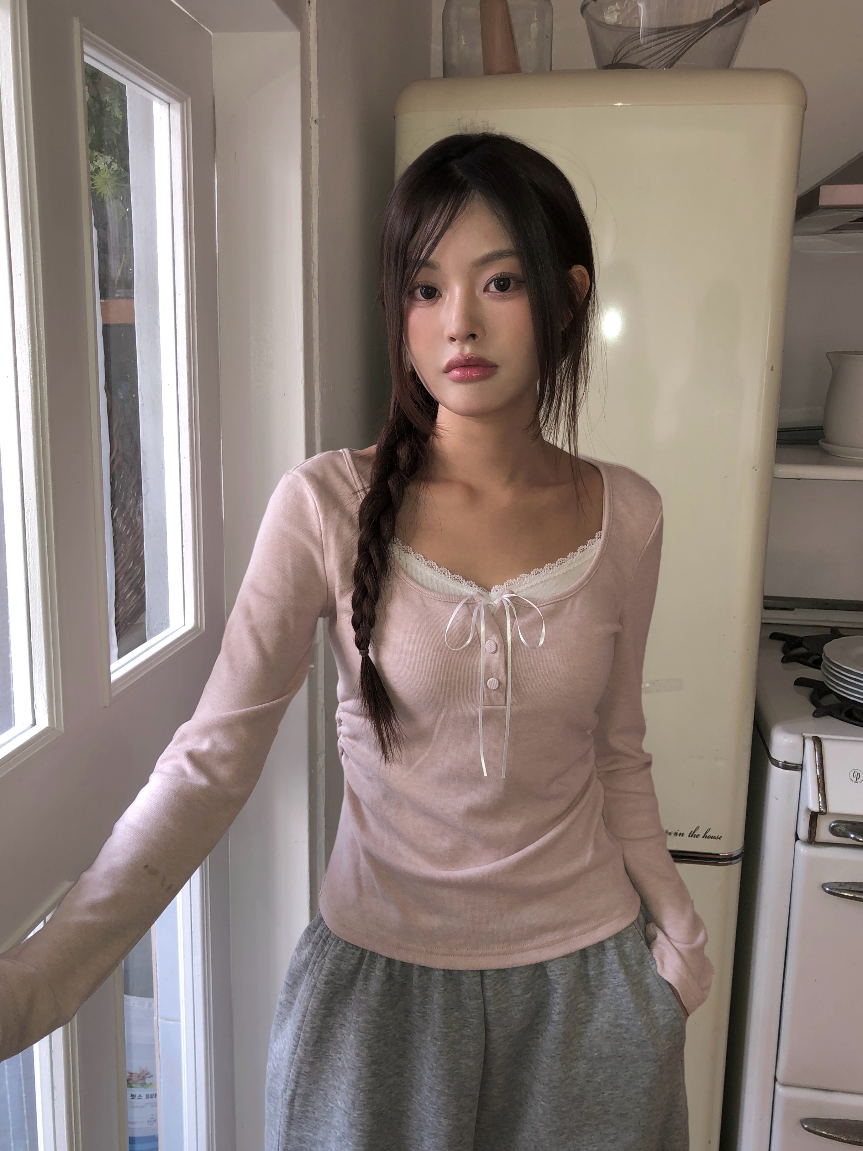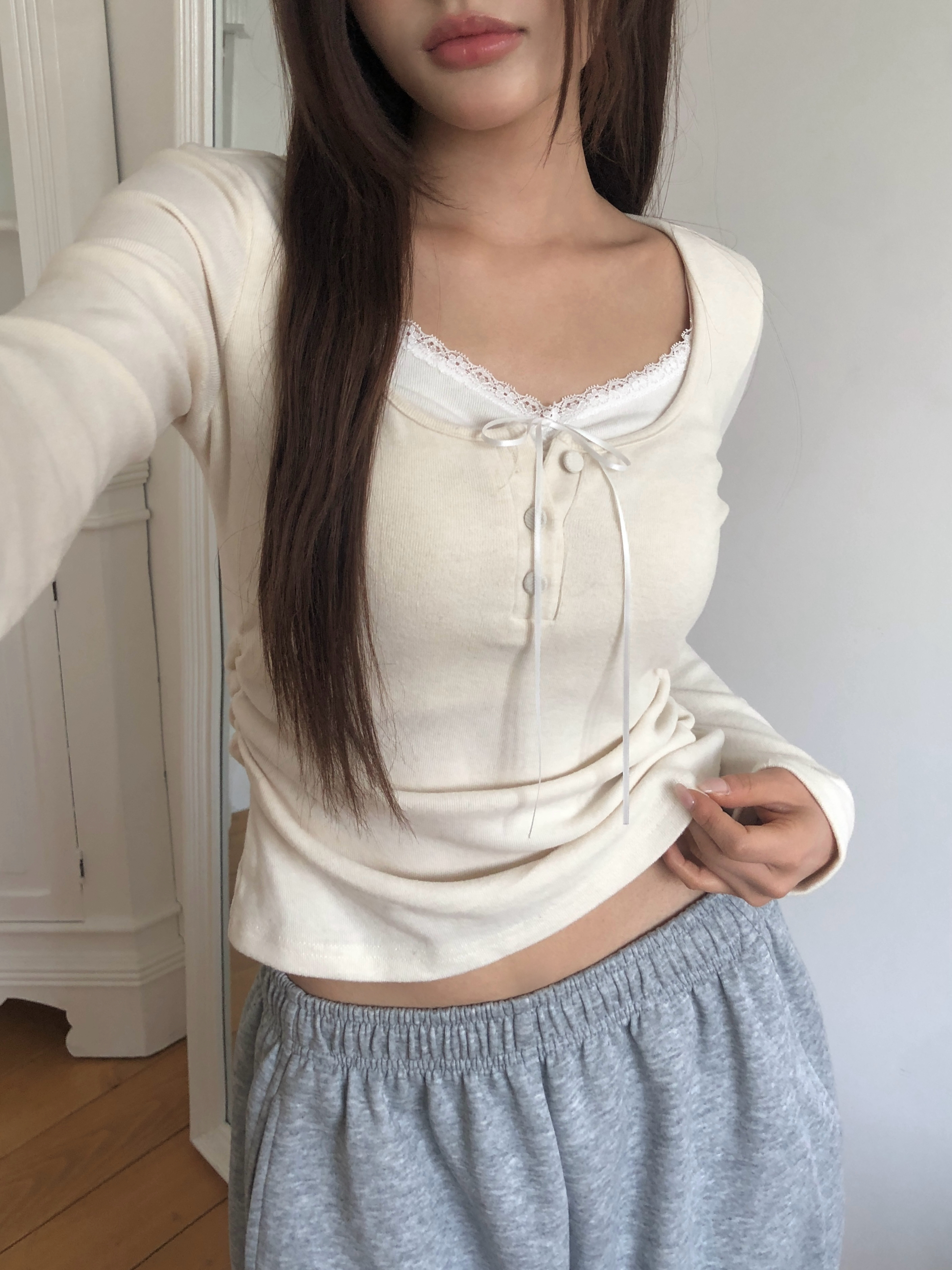 レースレイヤードサイドシャーリングUネックボタンTシャツ