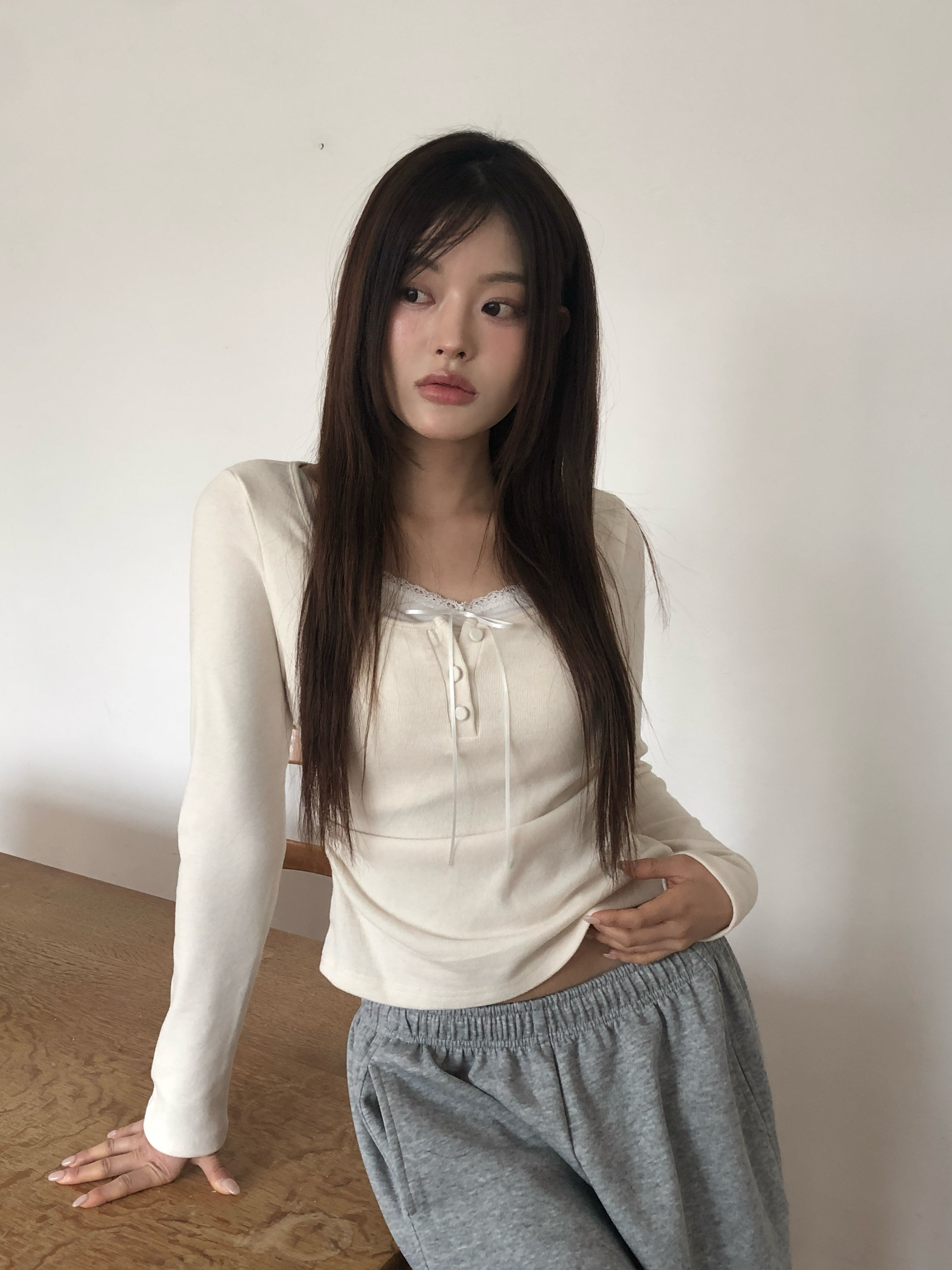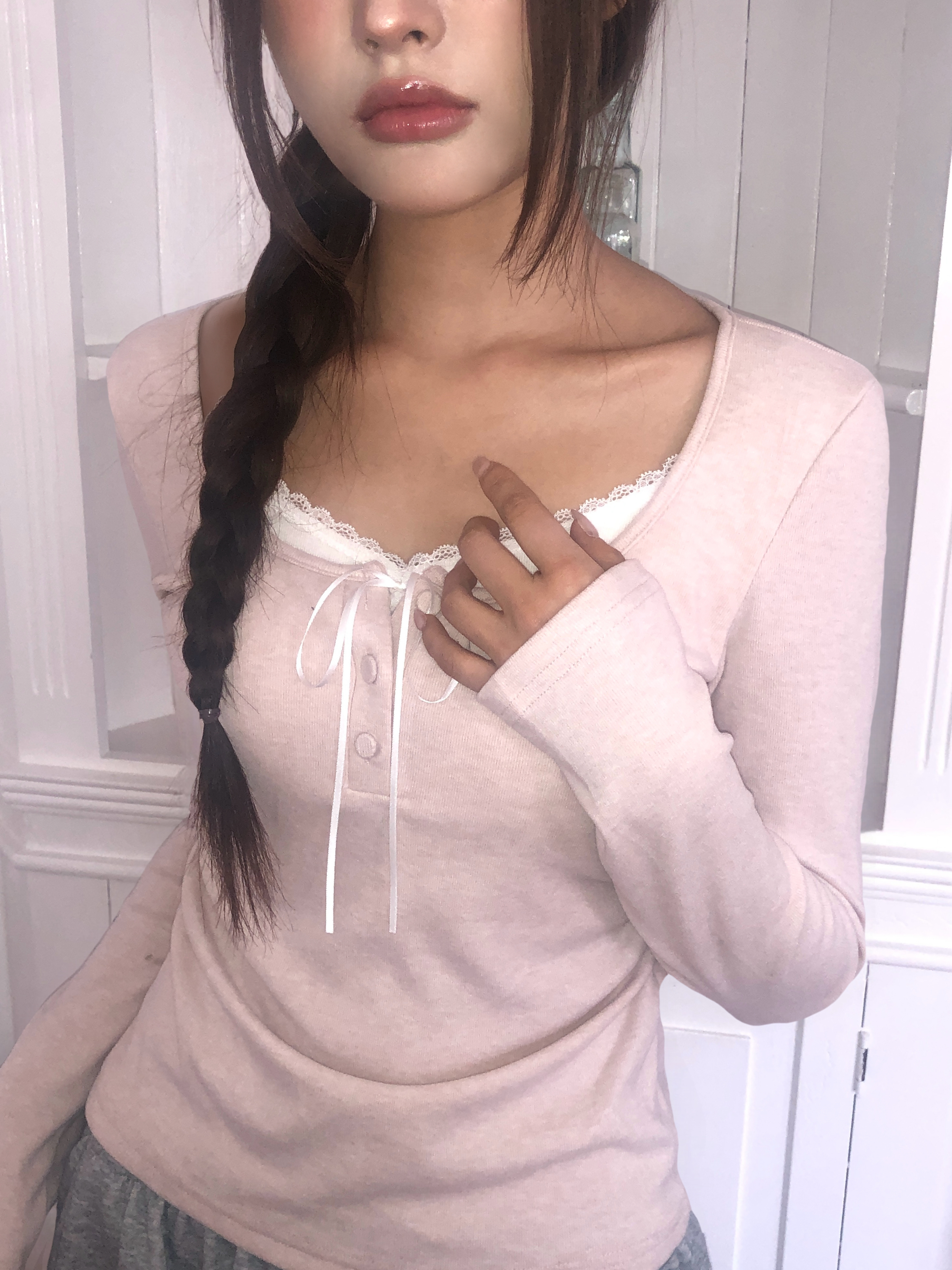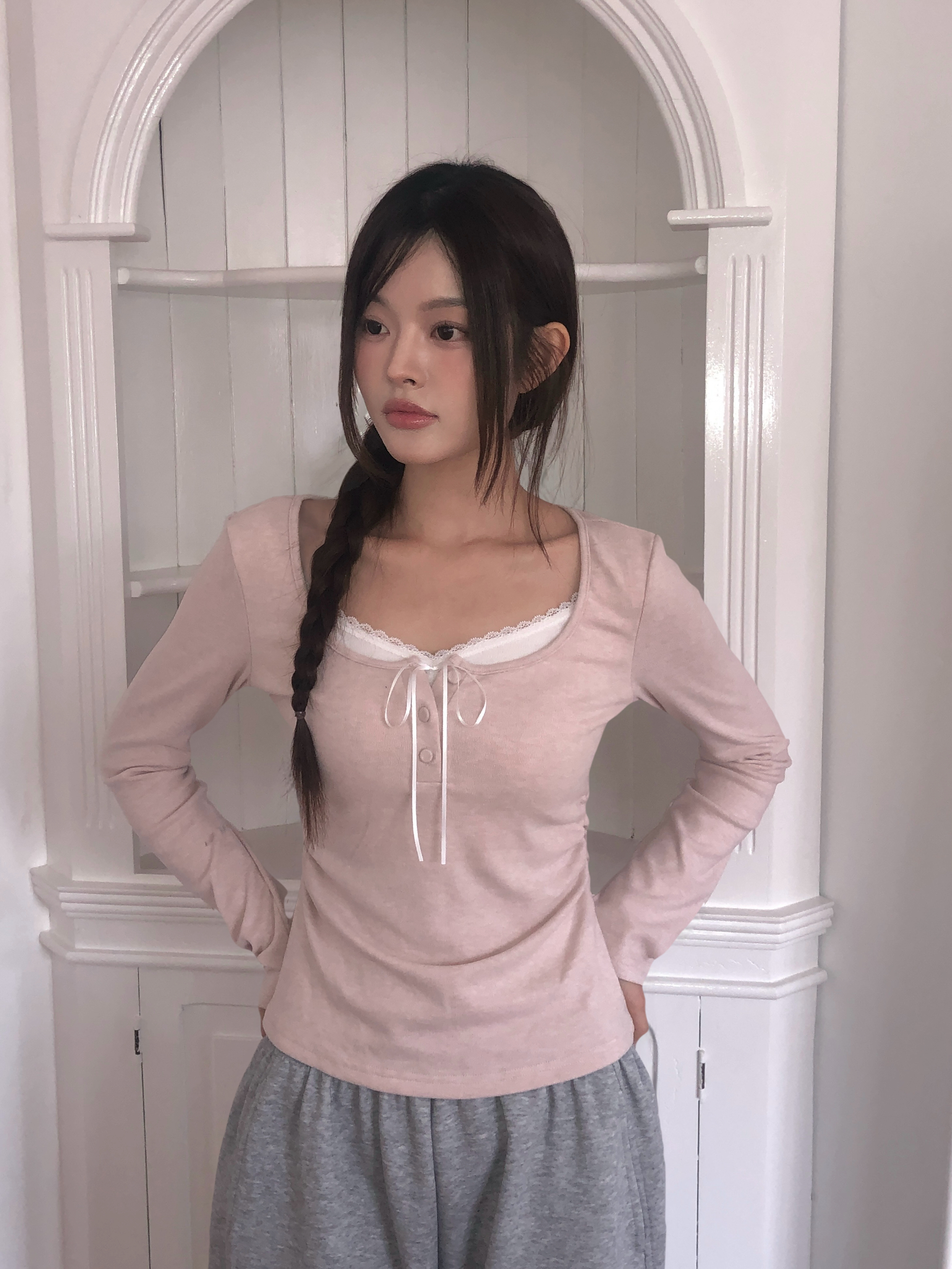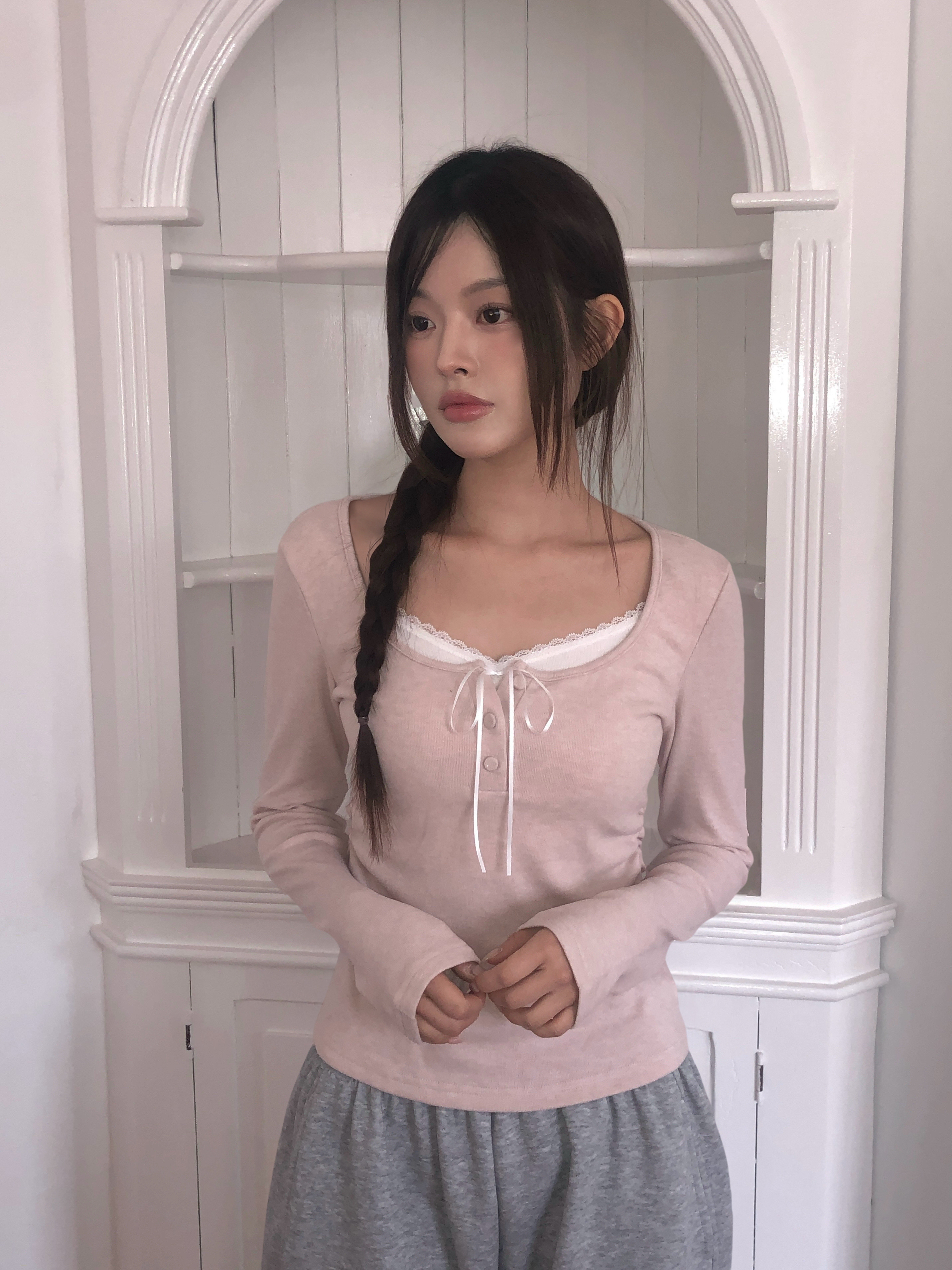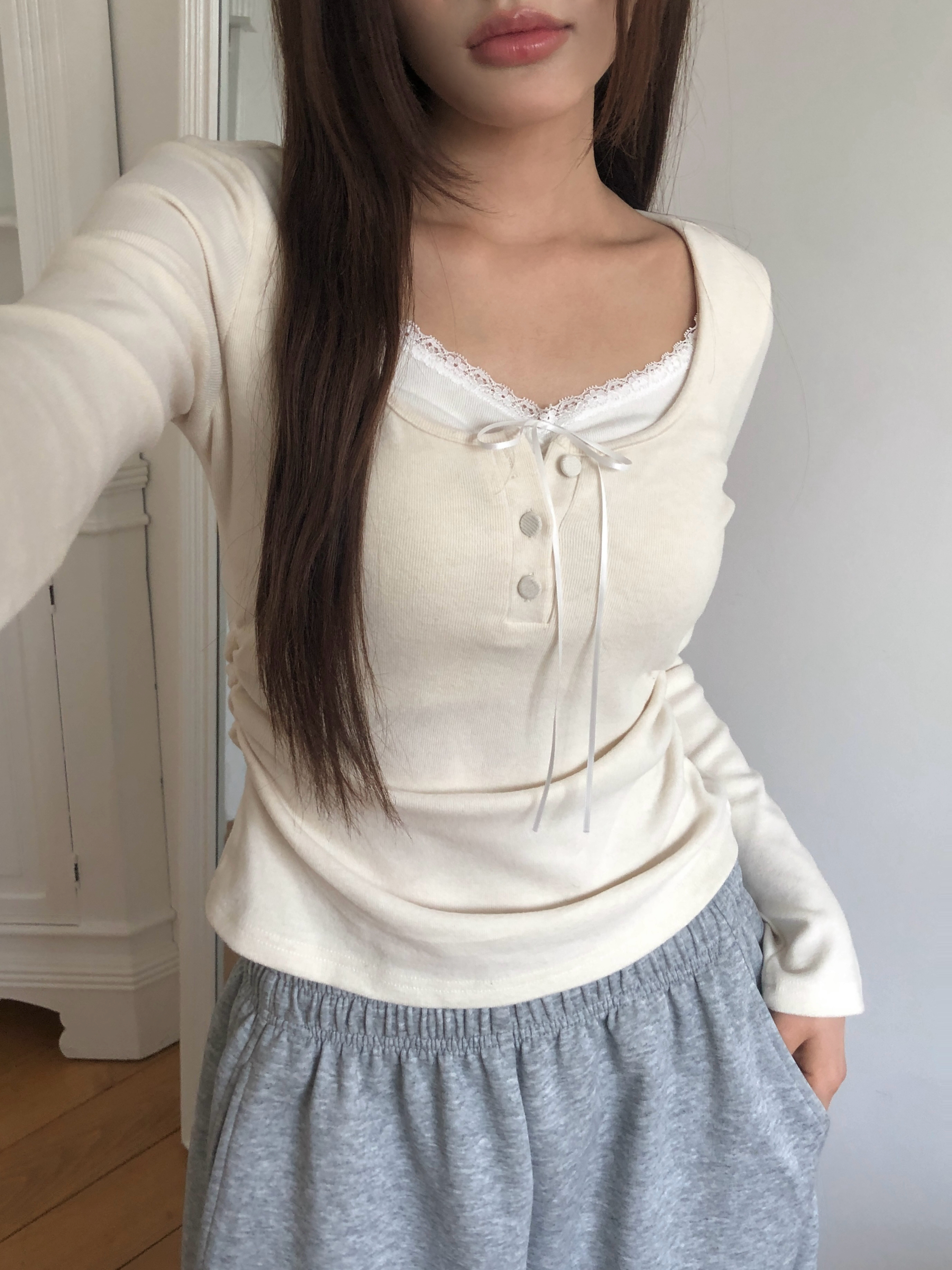 レースレイヤードサイドシャーリングUネックボタンTシャツ