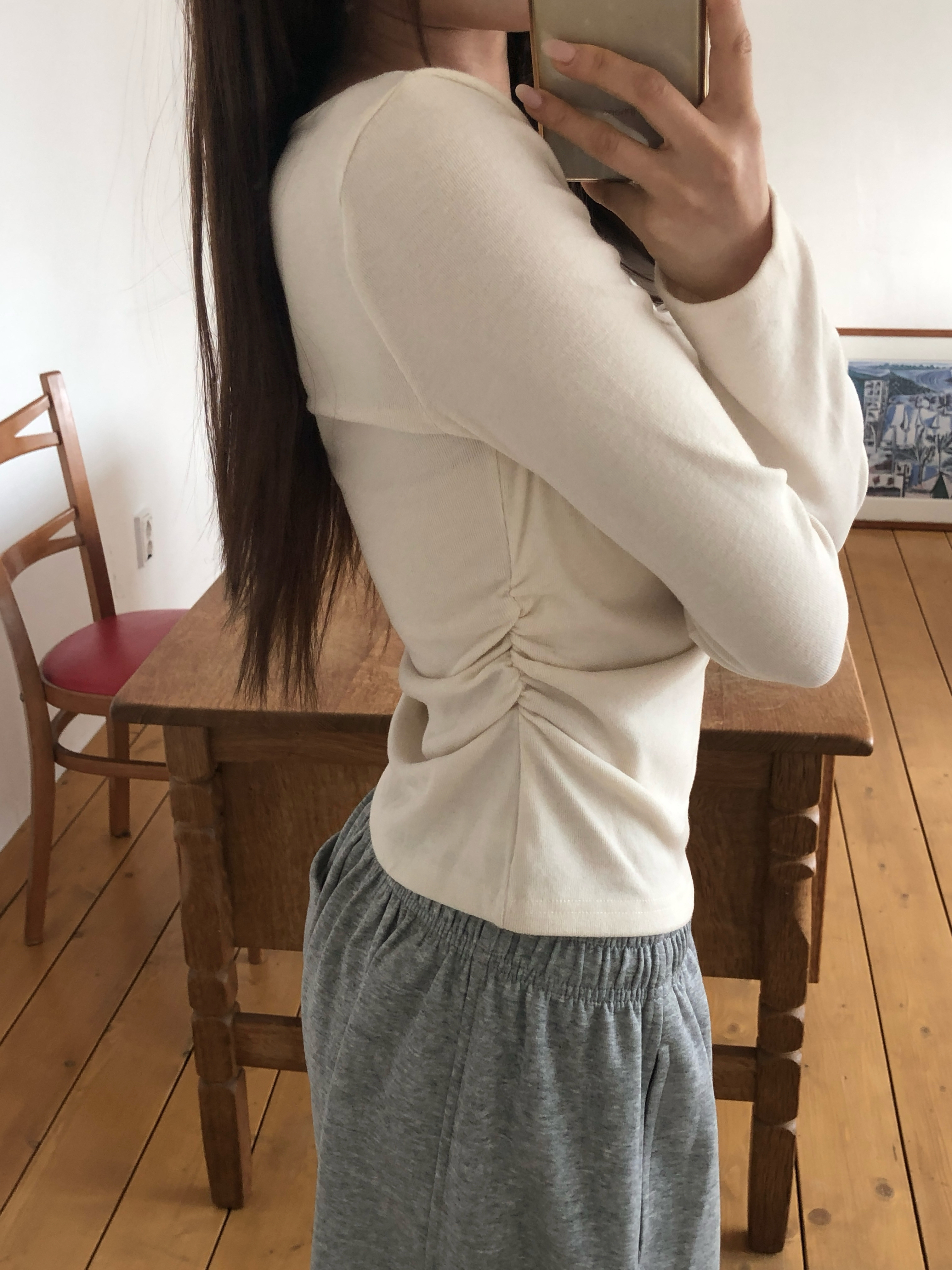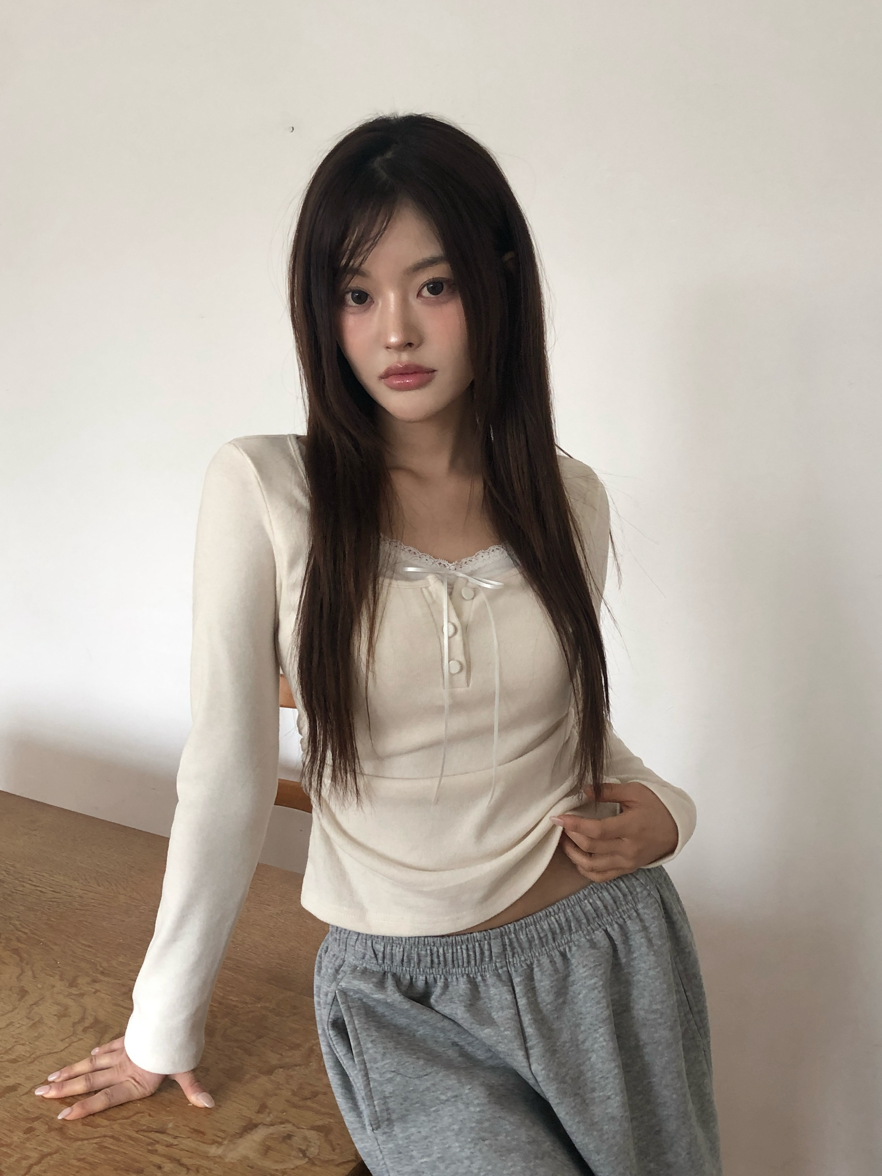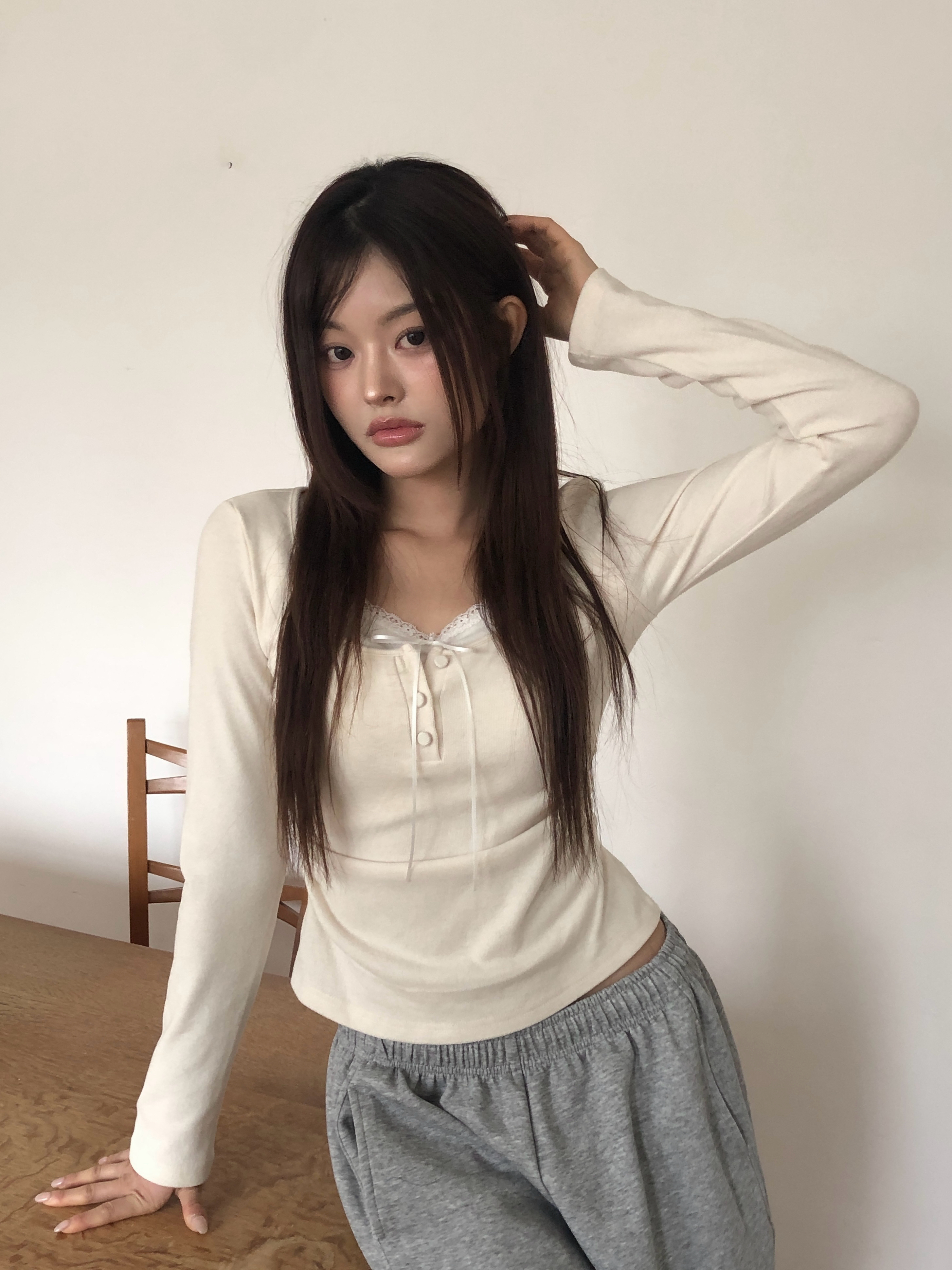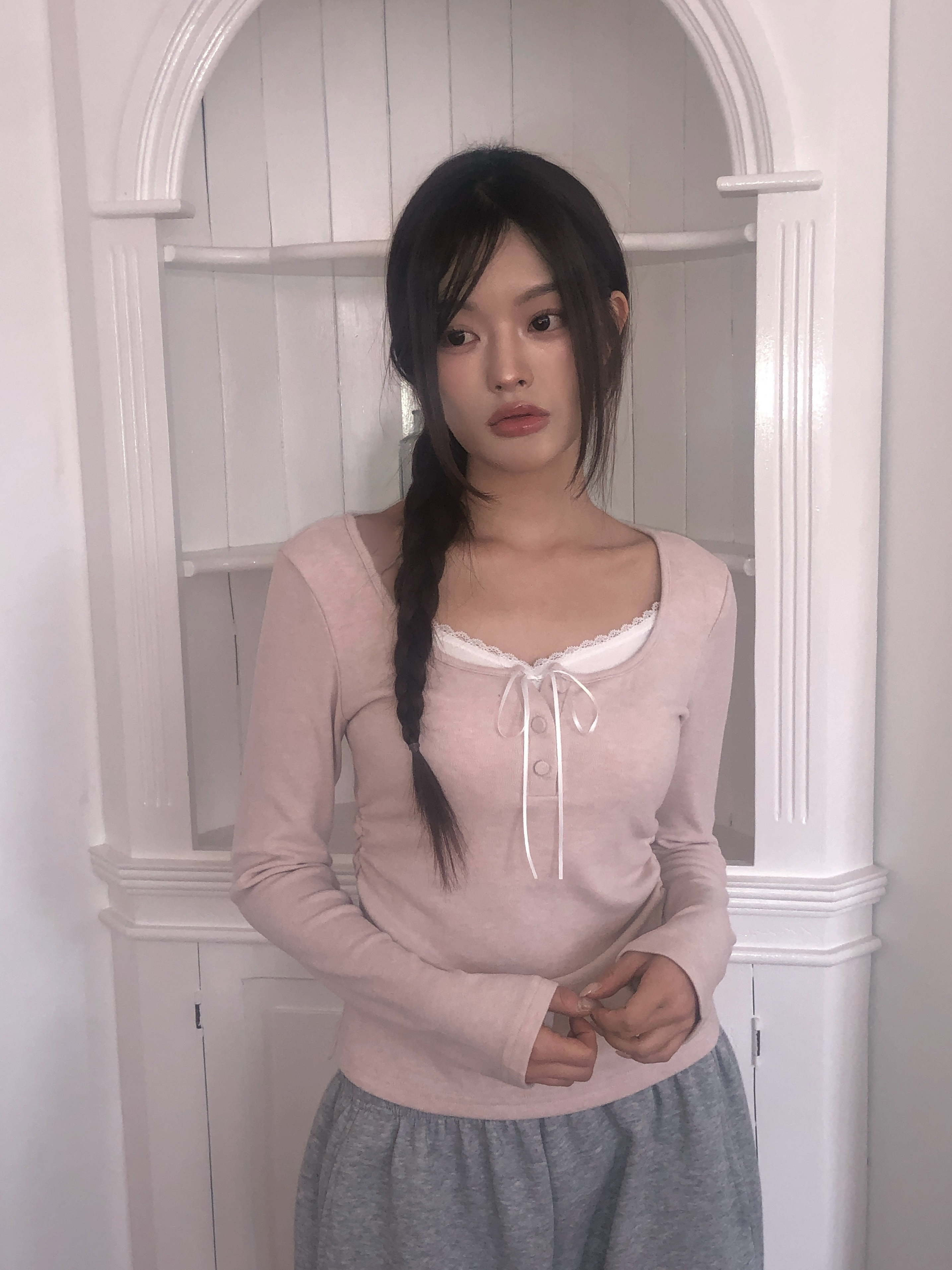 レースレイヤードサイドシャーリングUネックボタンTシャツ
