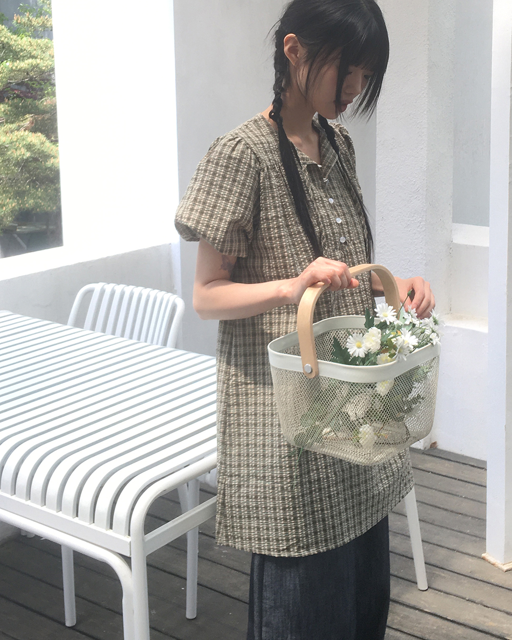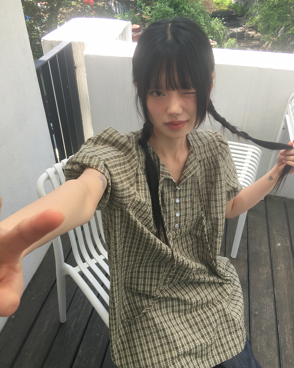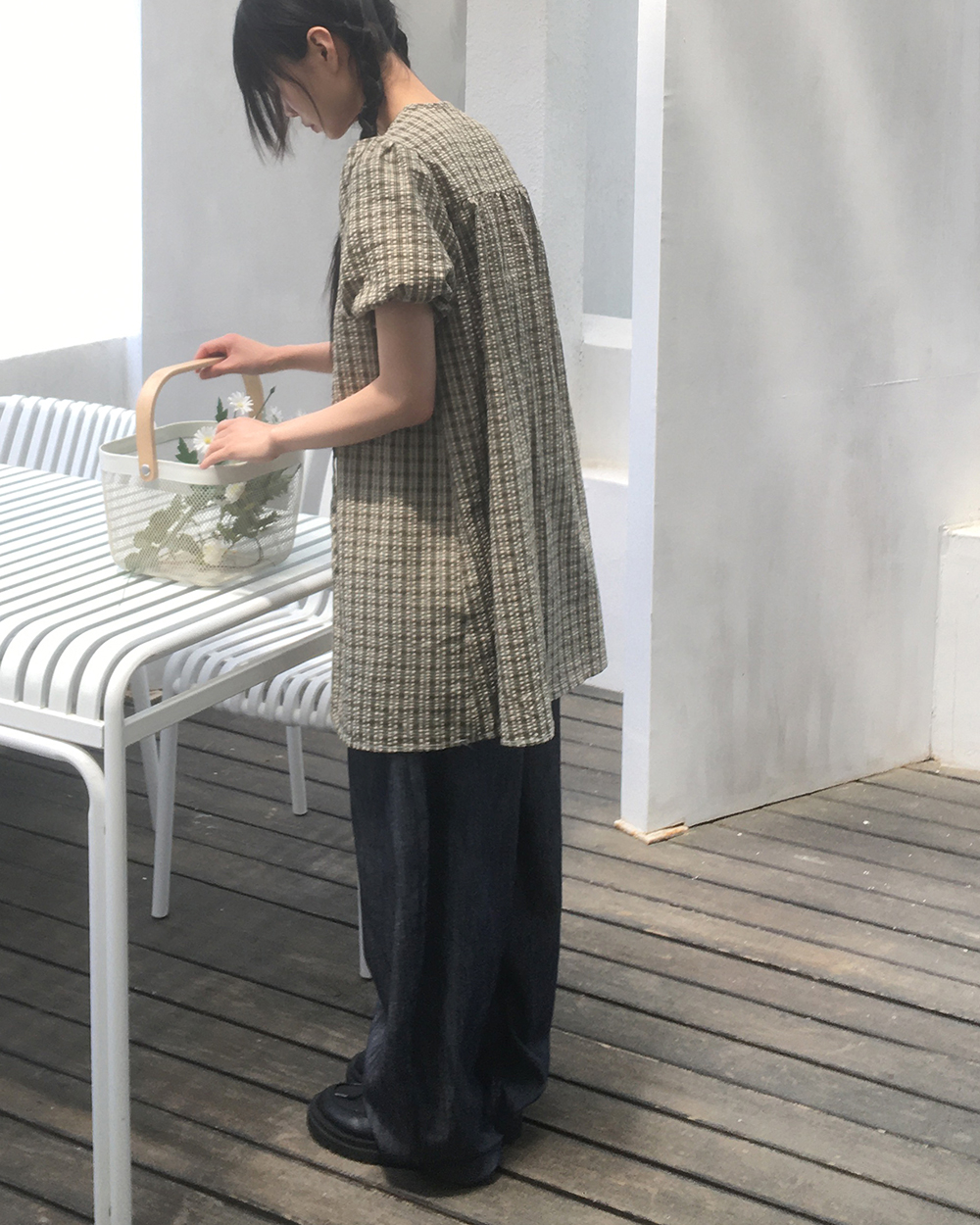 チェックボタンストラップ半袖ワンピース