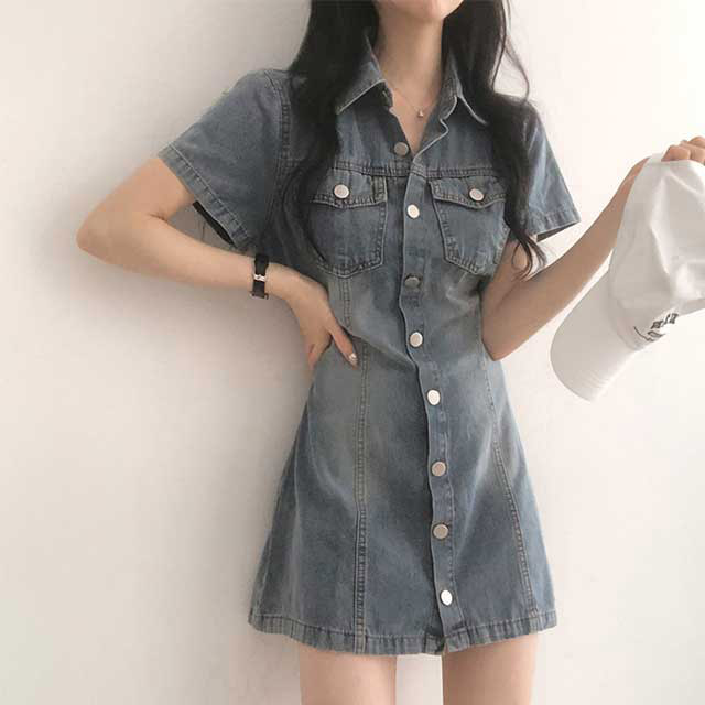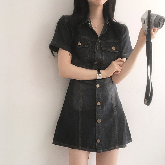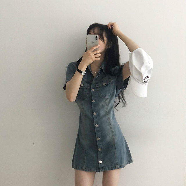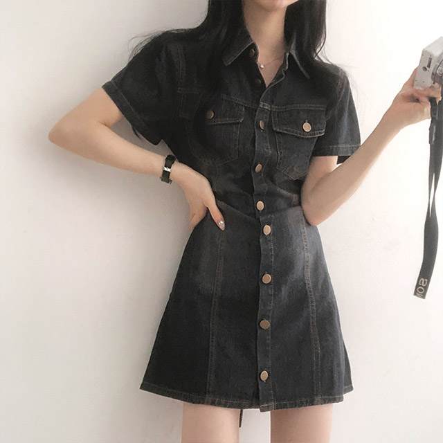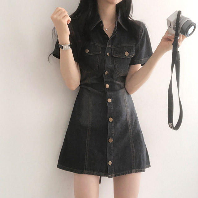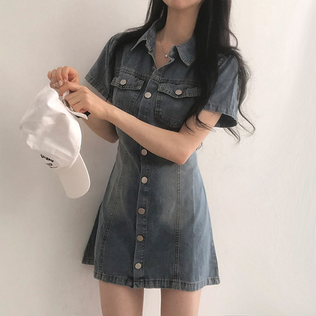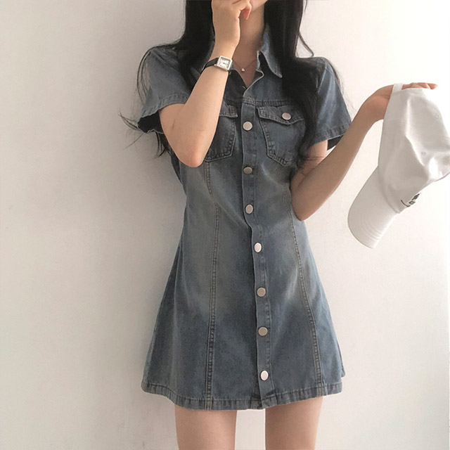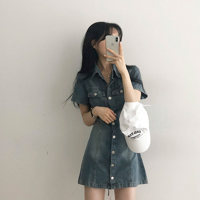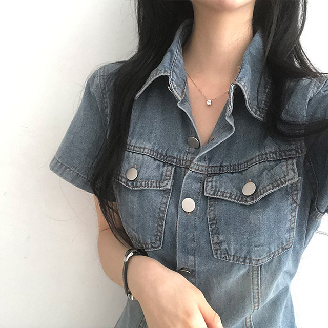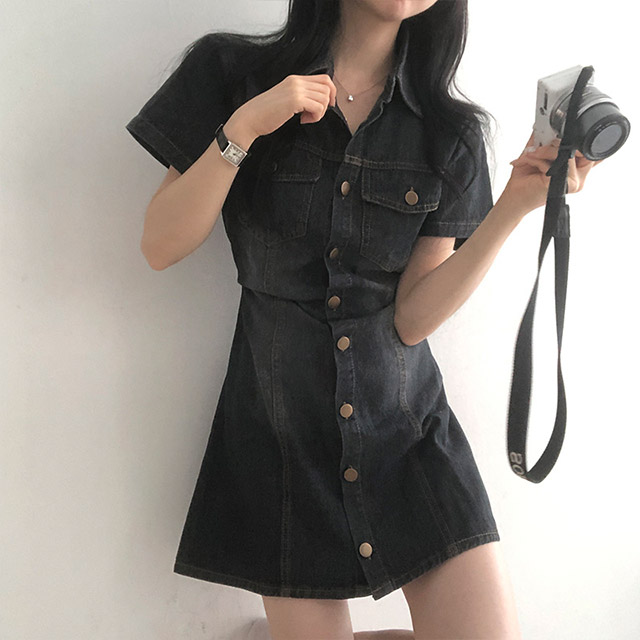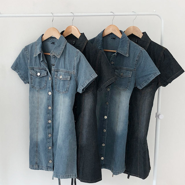 [2Color/ショート&ロング]デニムボタン半袖ワンピース