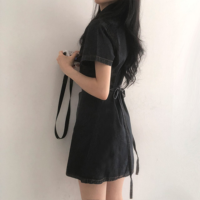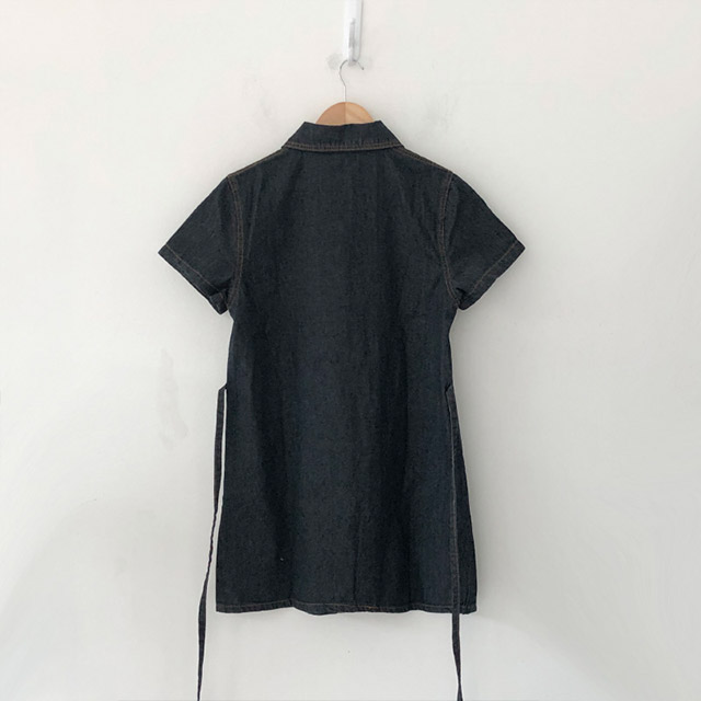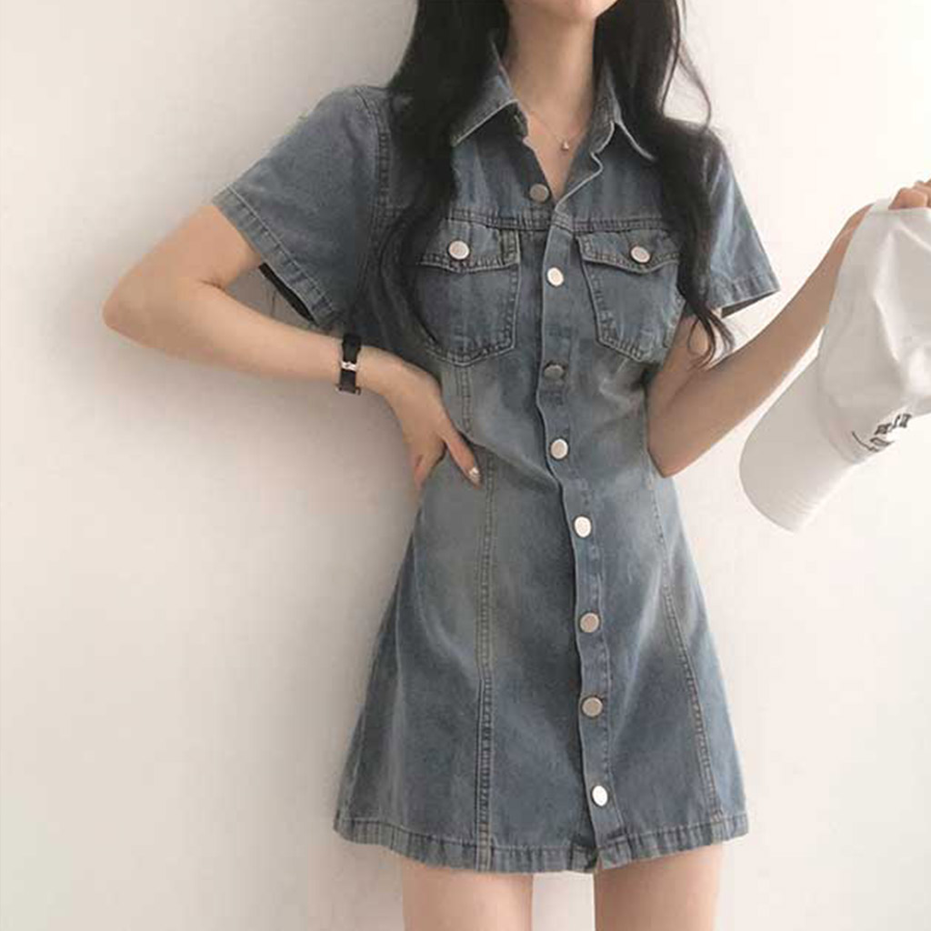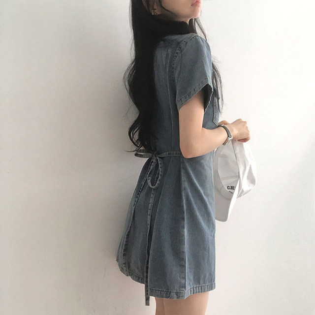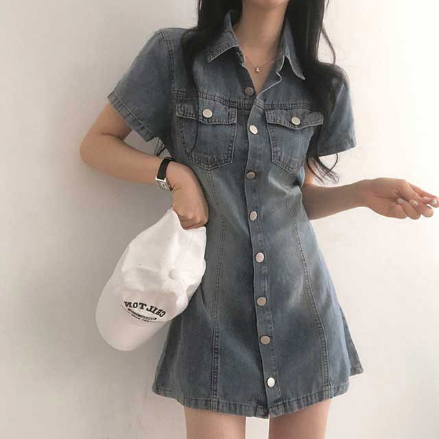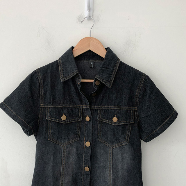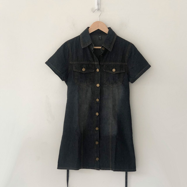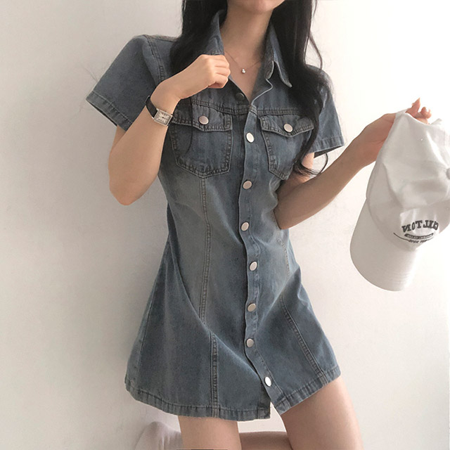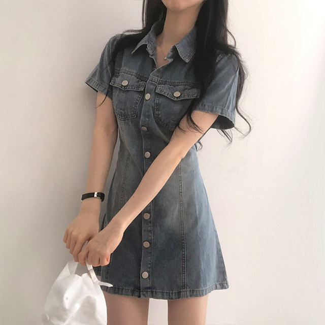 [2Color/ショート&ロング]デニムボタン半袖ワンピース