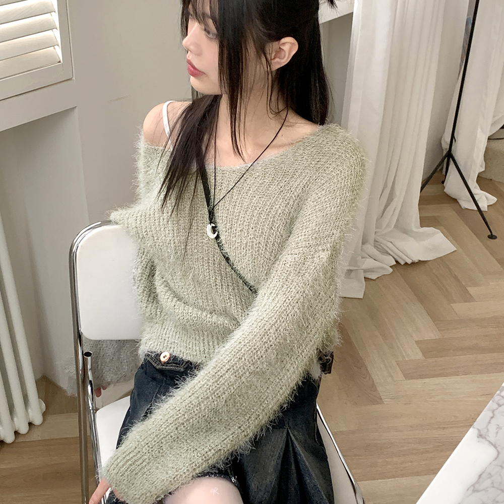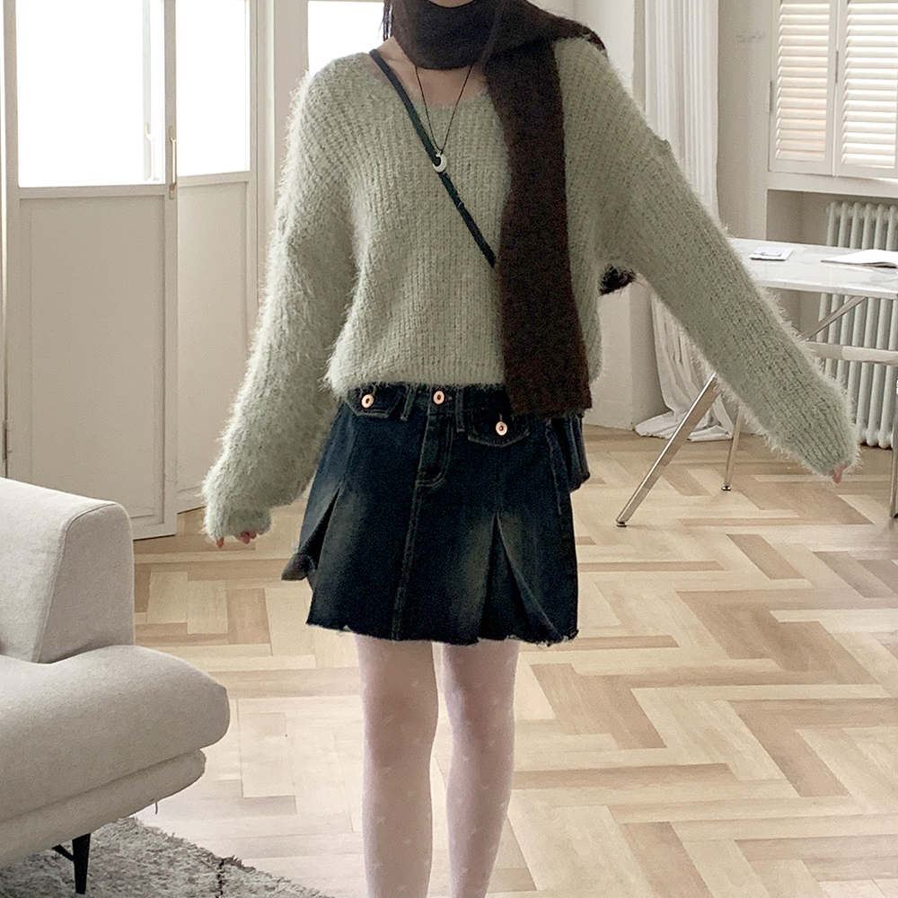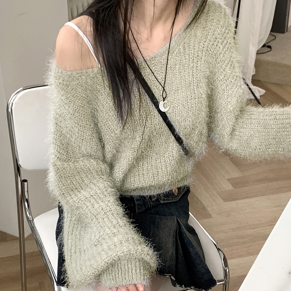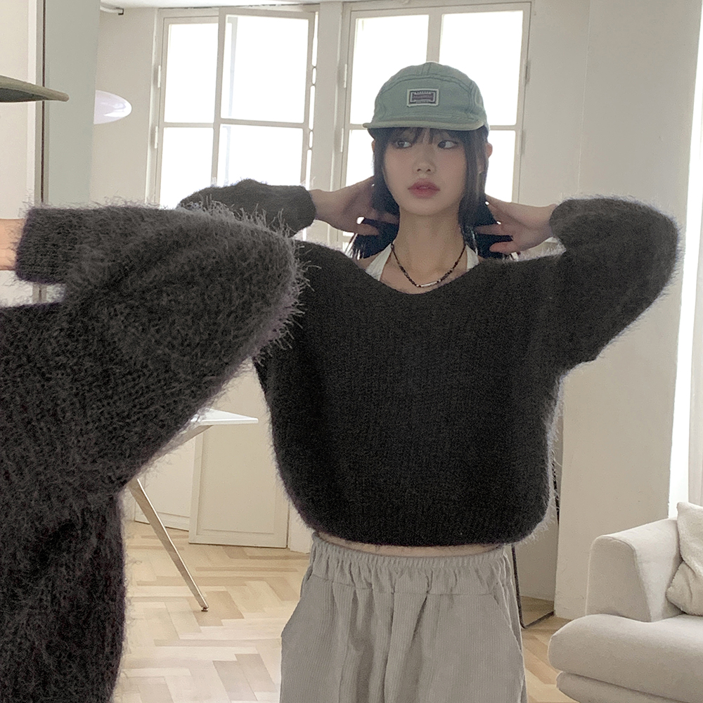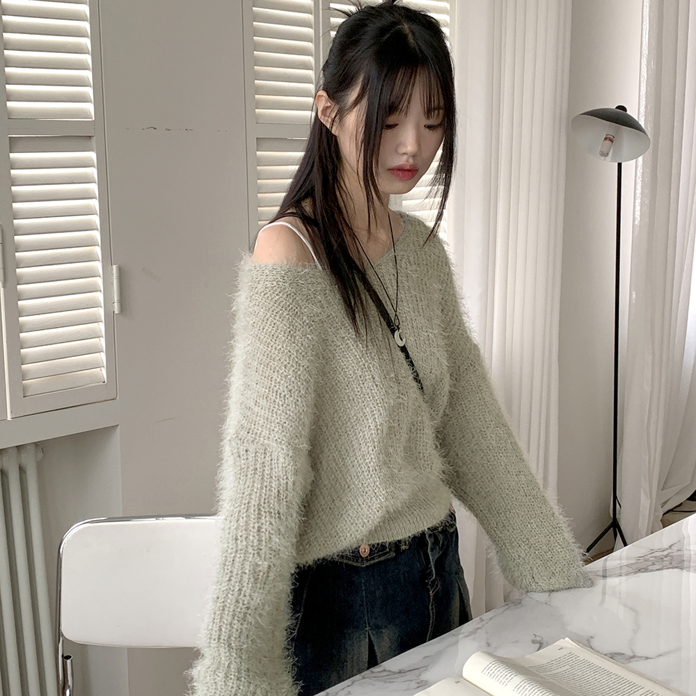 Vネックアンゴラ長袖ニット