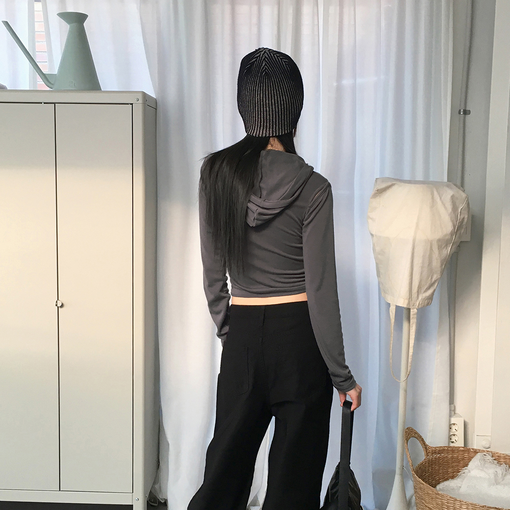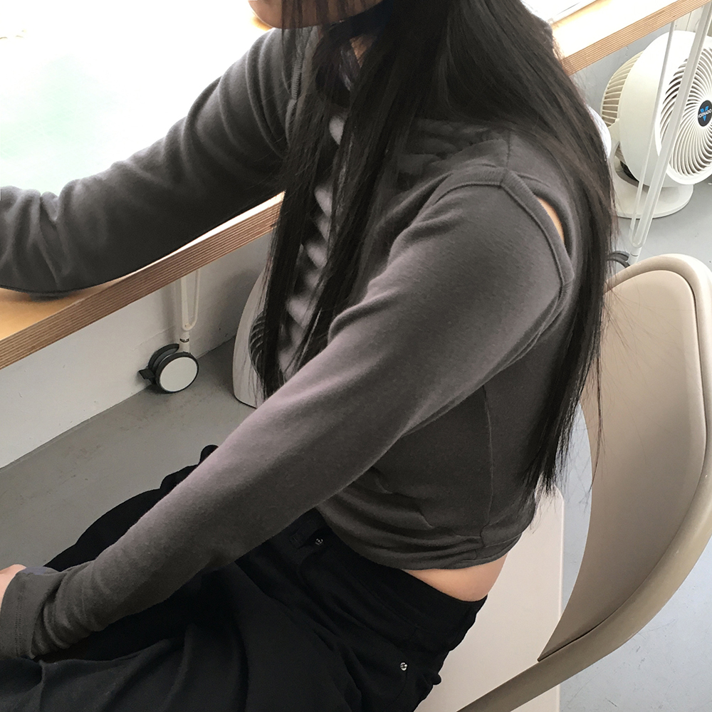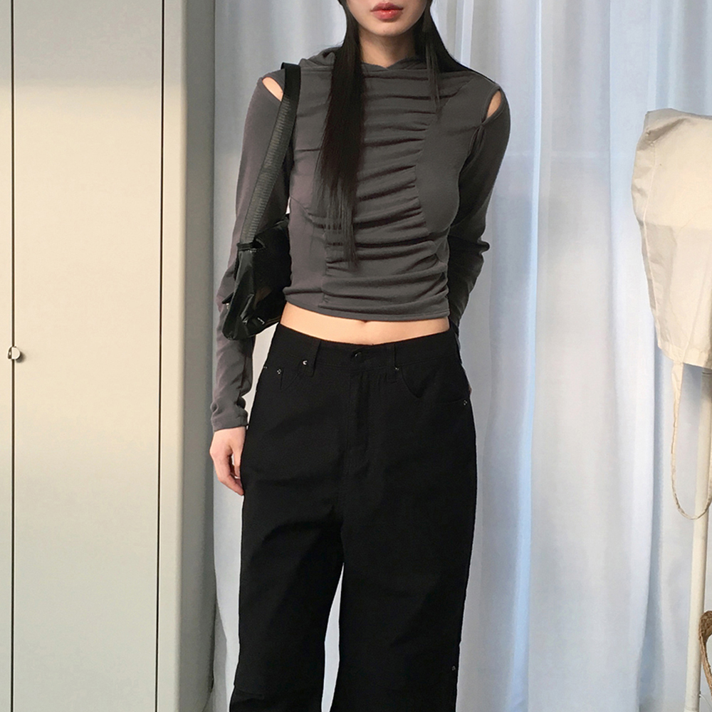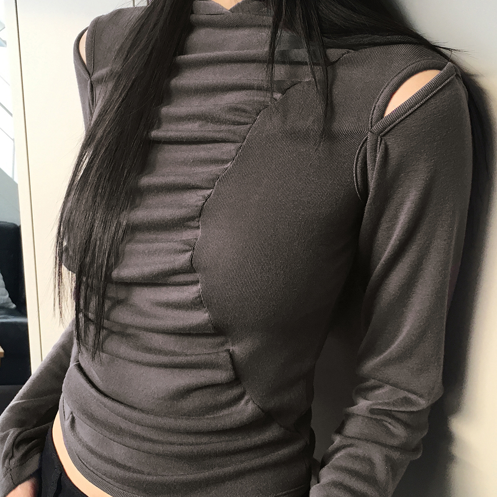 シャーリング肩スリットフード付きTシャツ