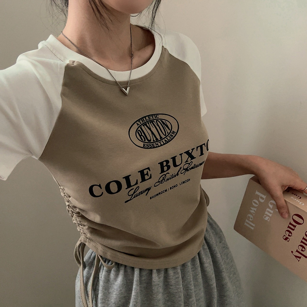 プリントラウンドバイカラーストリングクロップド半袖Tシャツ