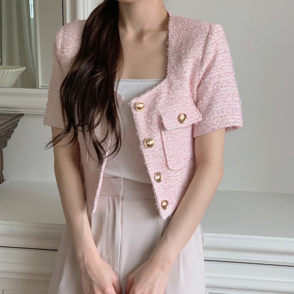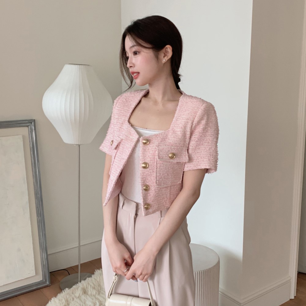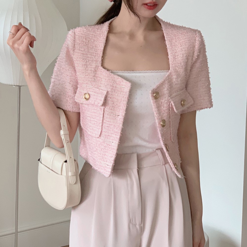 スクエアネッククロップドツイード半袖ジャケット(2color)