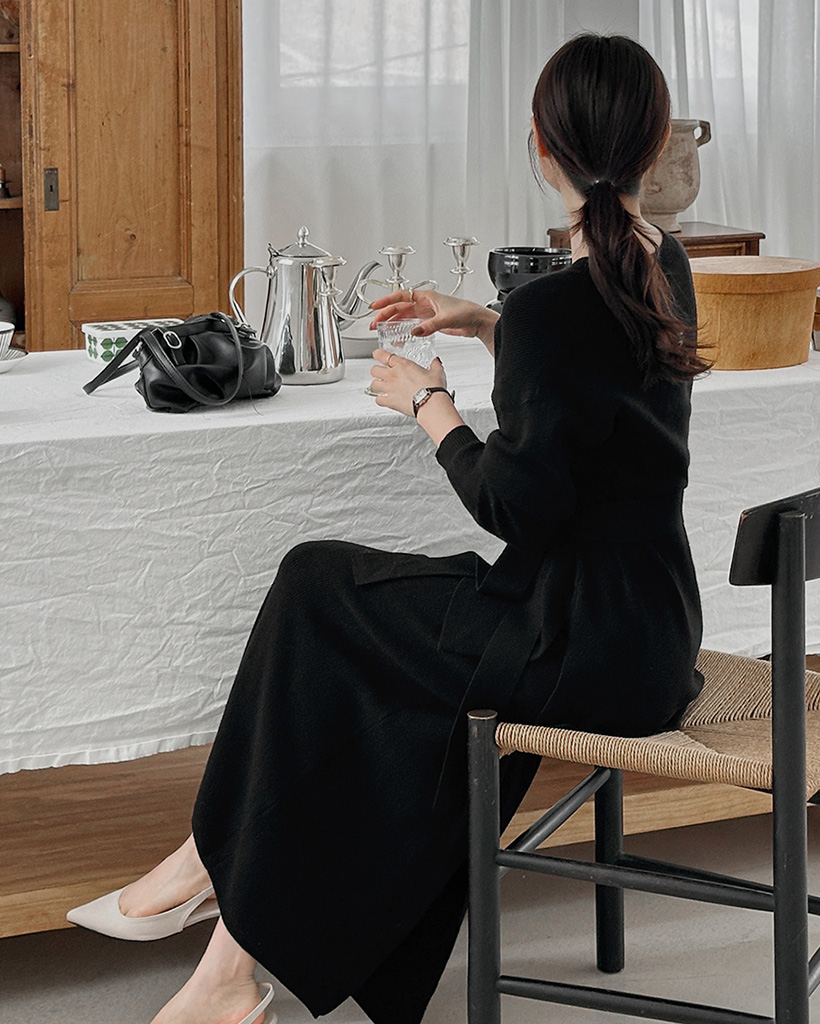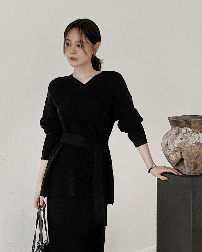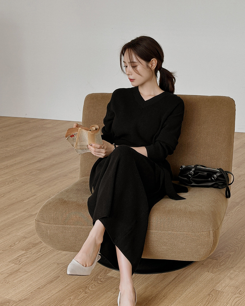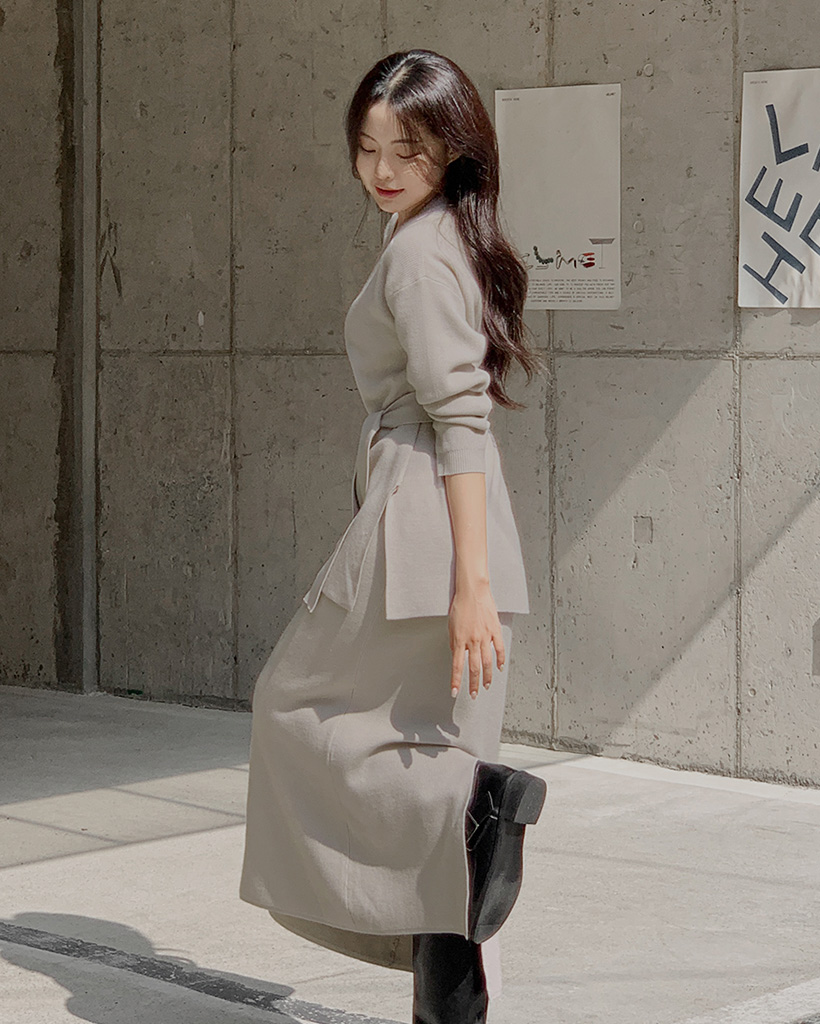 Vネックストラップニット&ウエストゴムスリットロングスカートセット