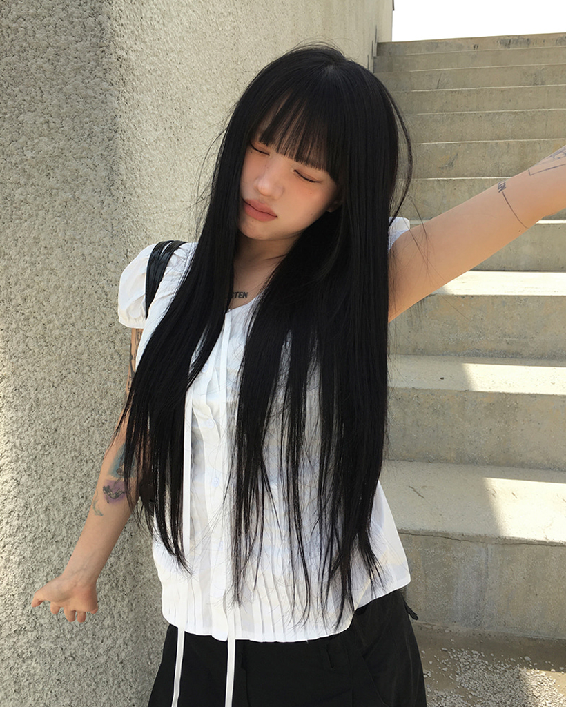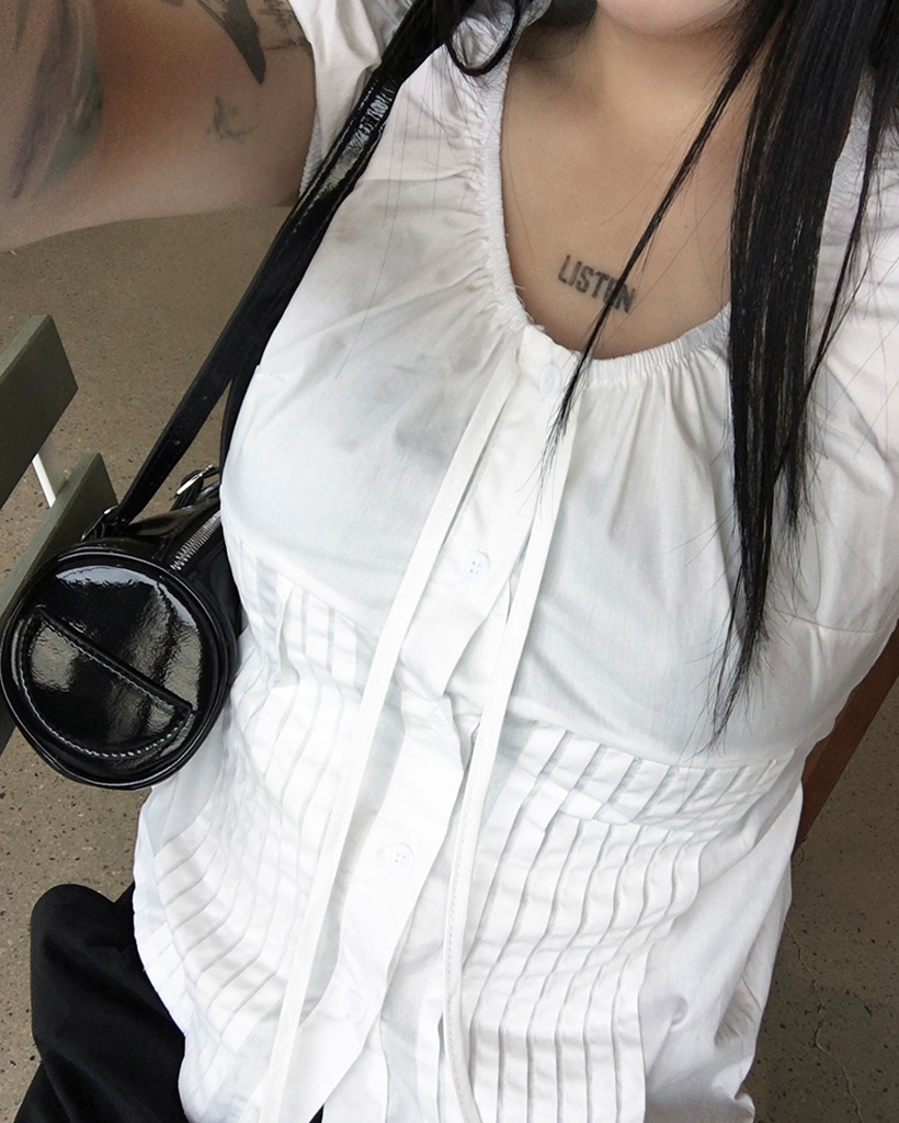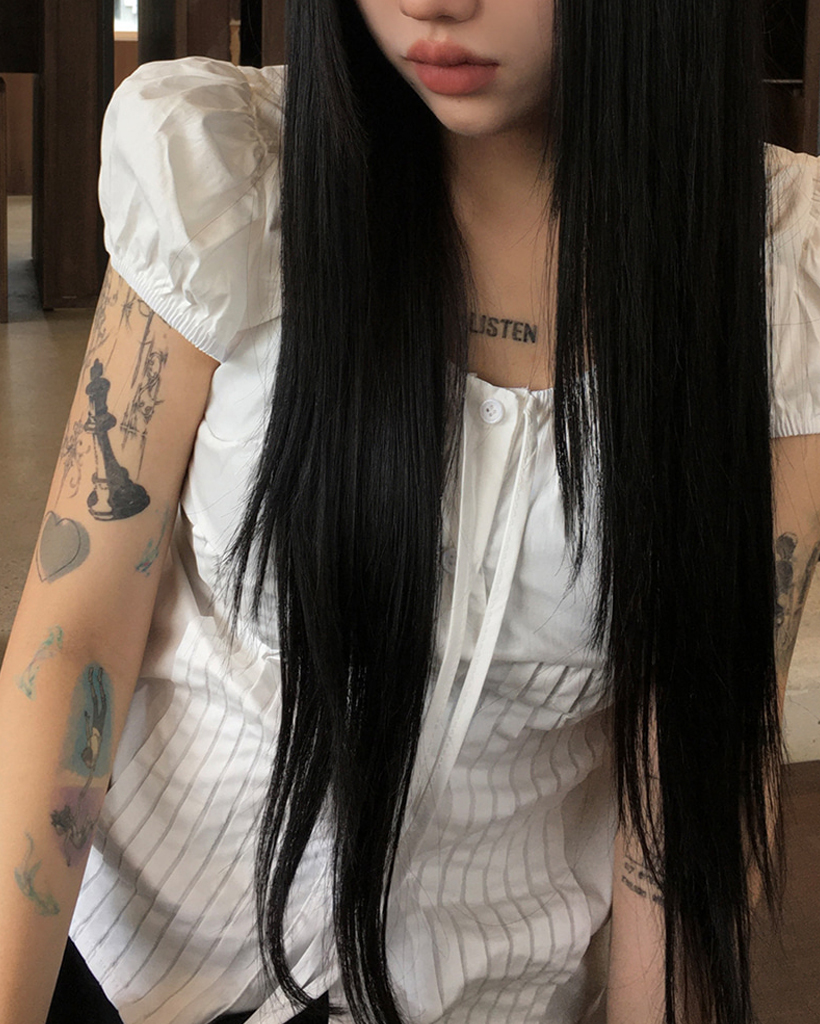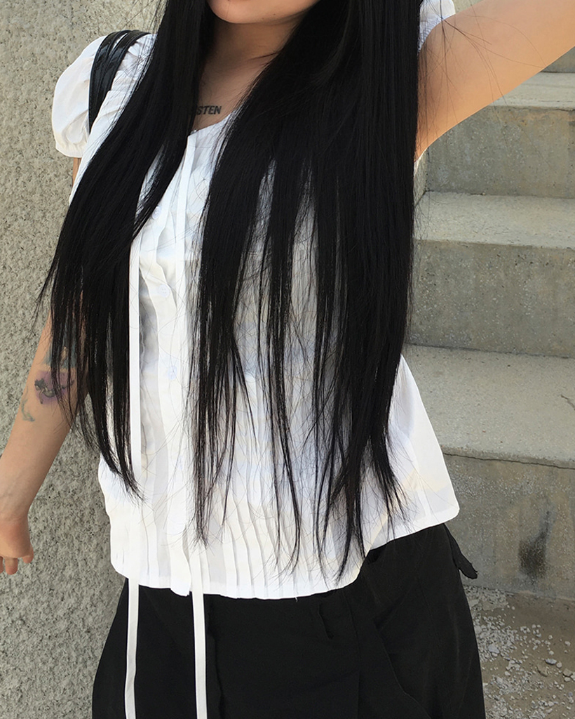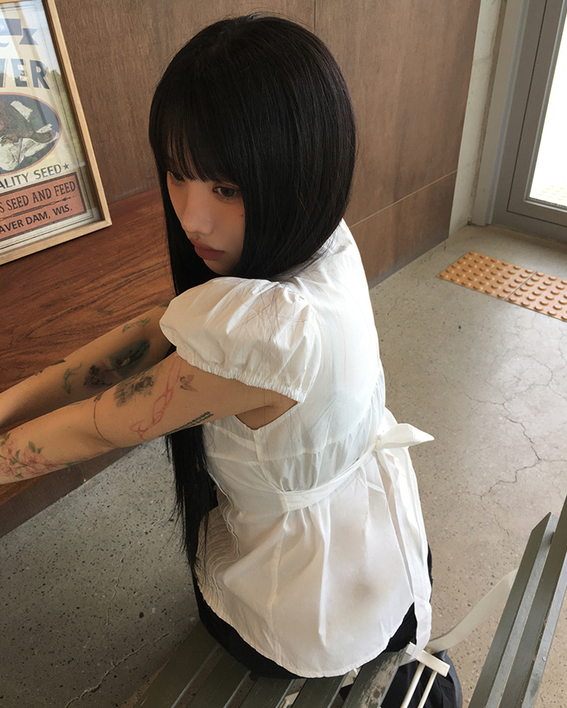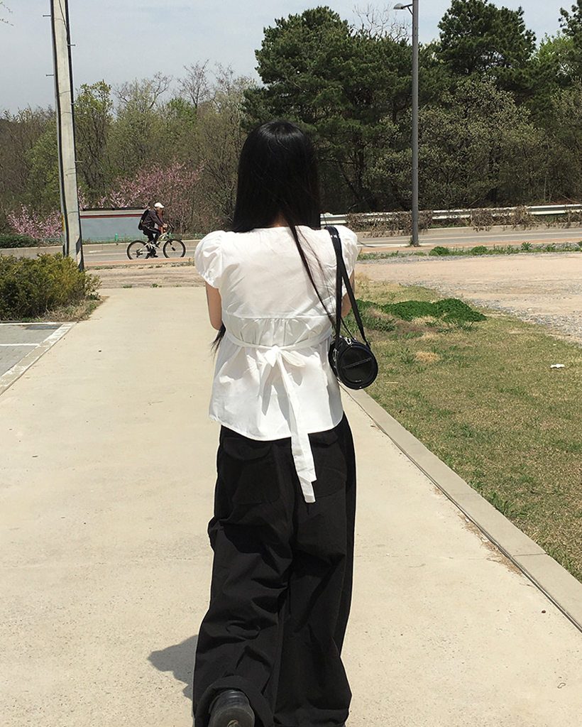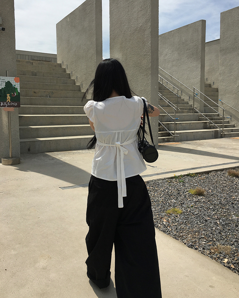 [腰のくびれフィット] サマーリボンストラップタックパフスリーブブラウス (2color)