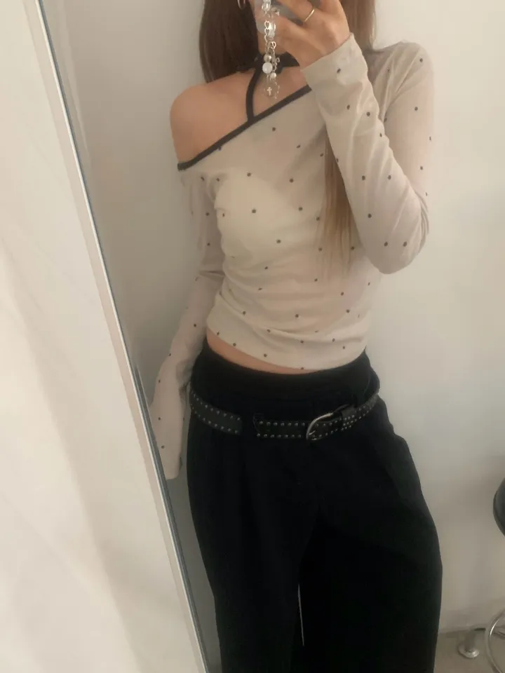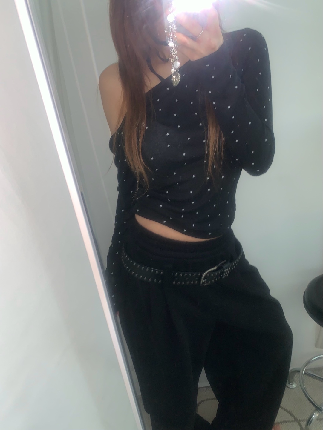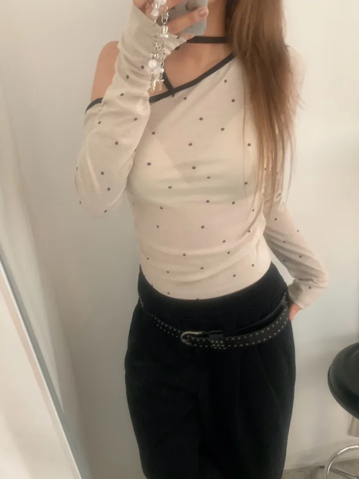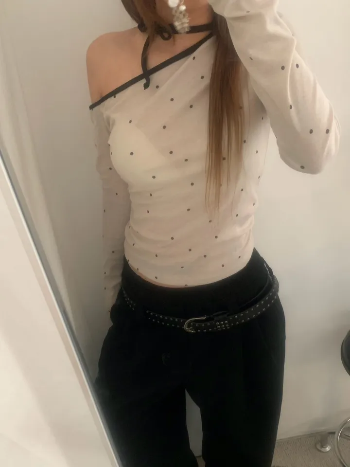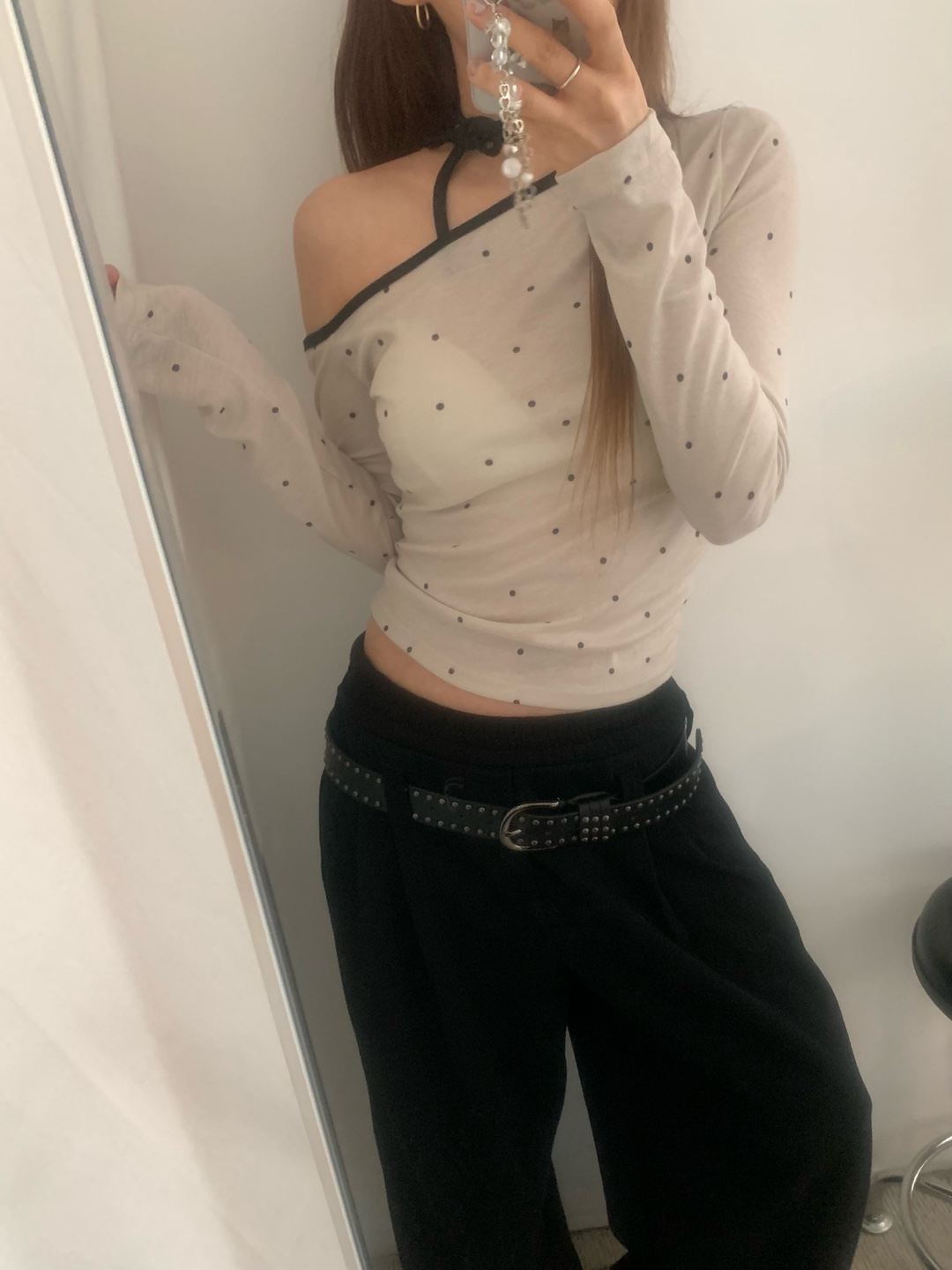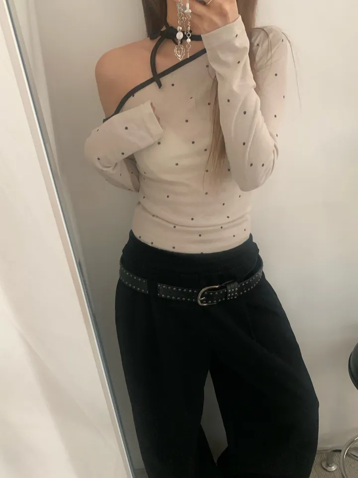 ドットアシンメトリーオフショルチョーカーTシャツ