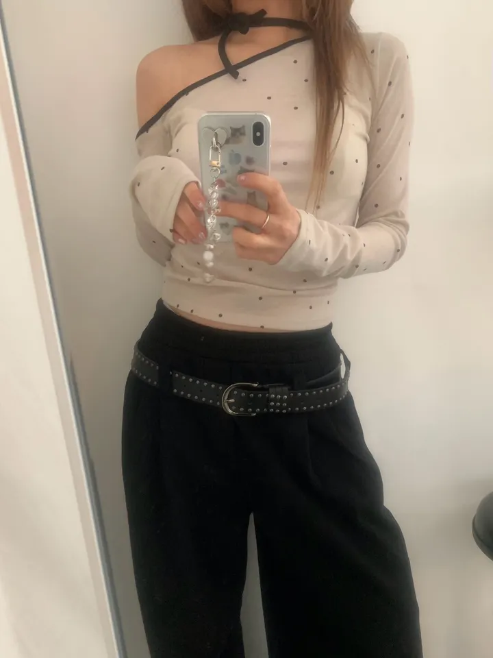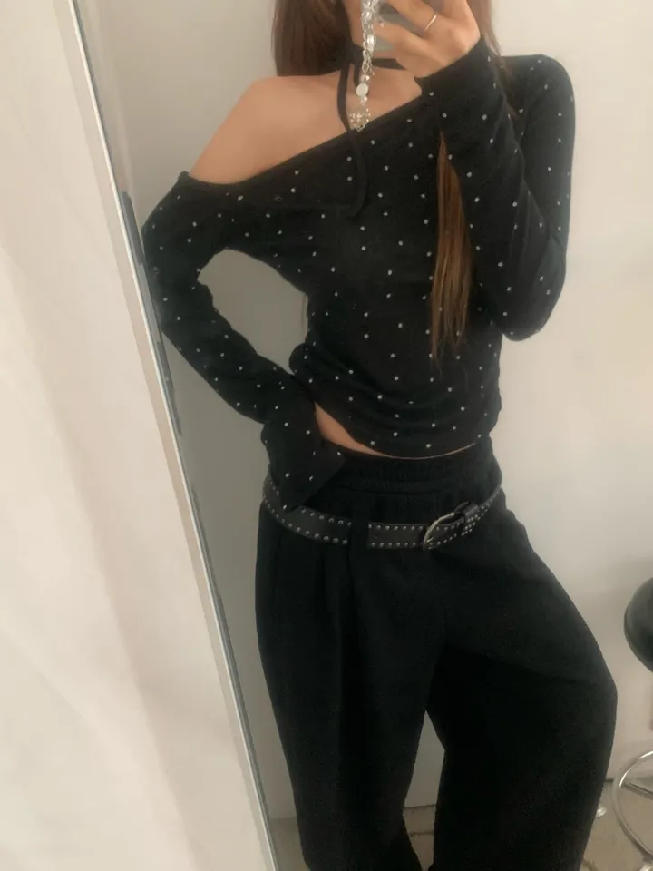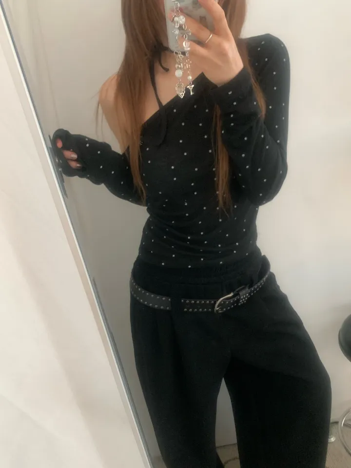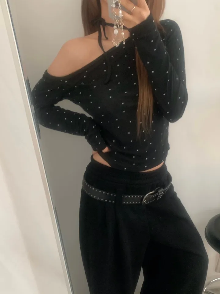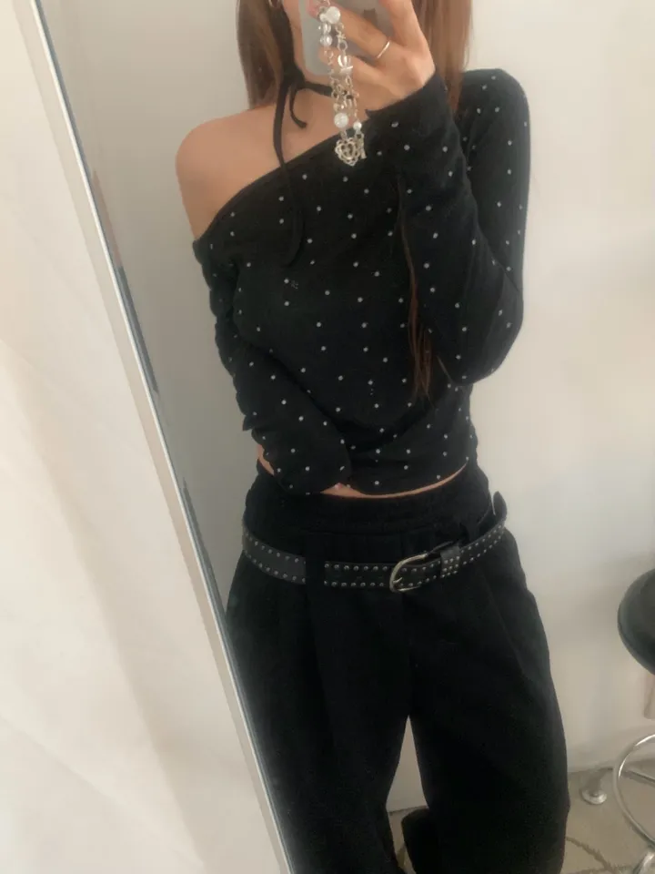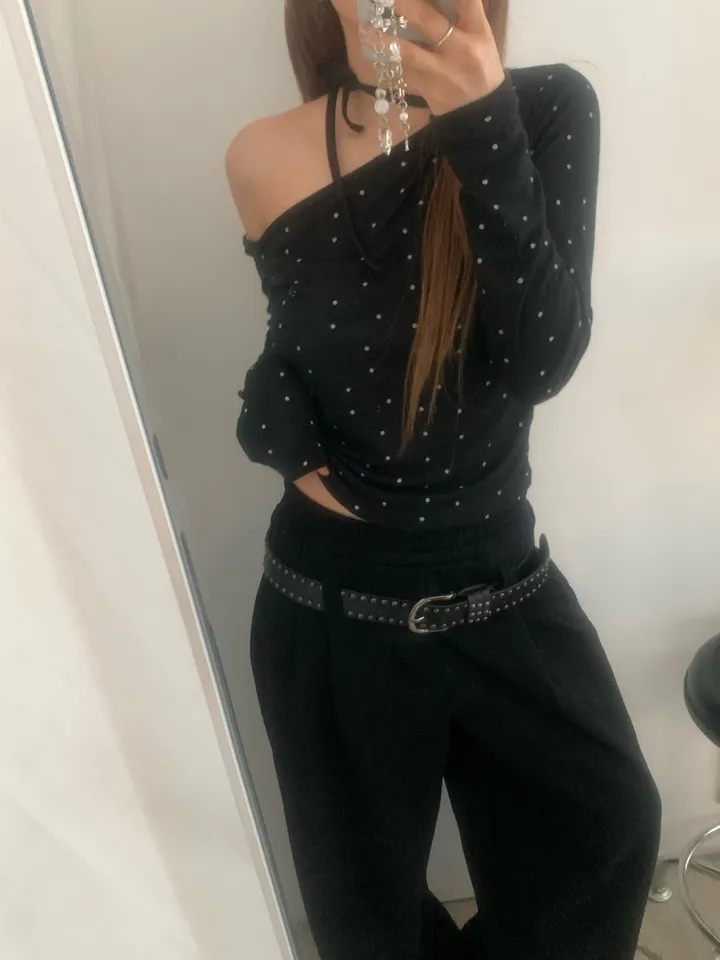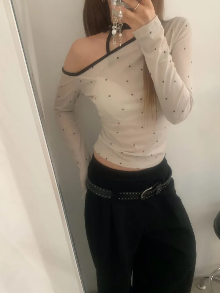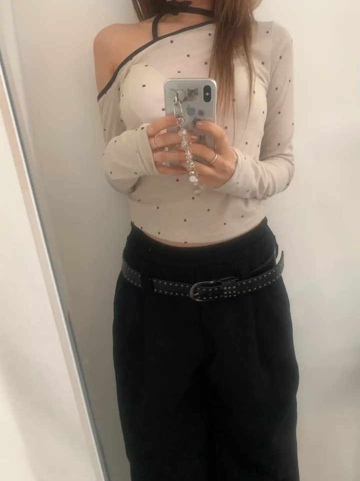 ドットアシンメトリーオフショルチョーカーTシャツ