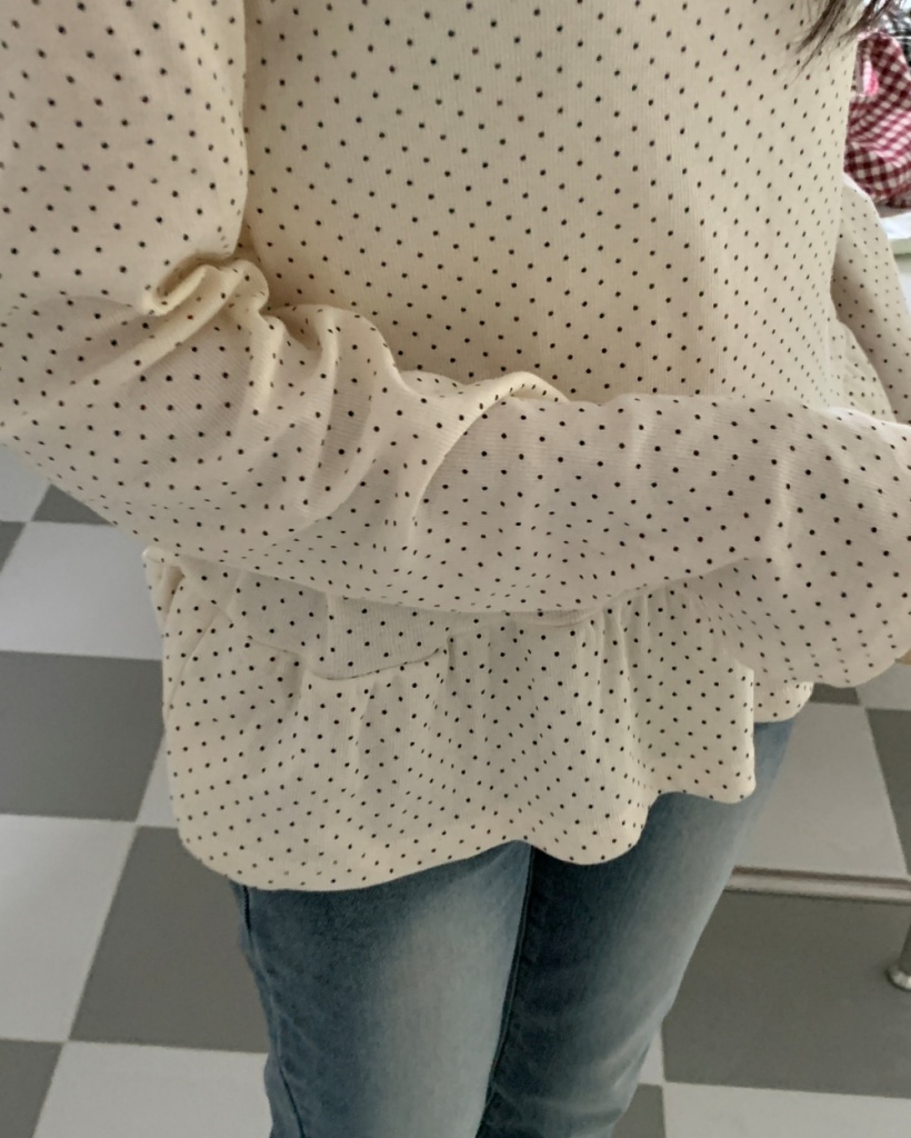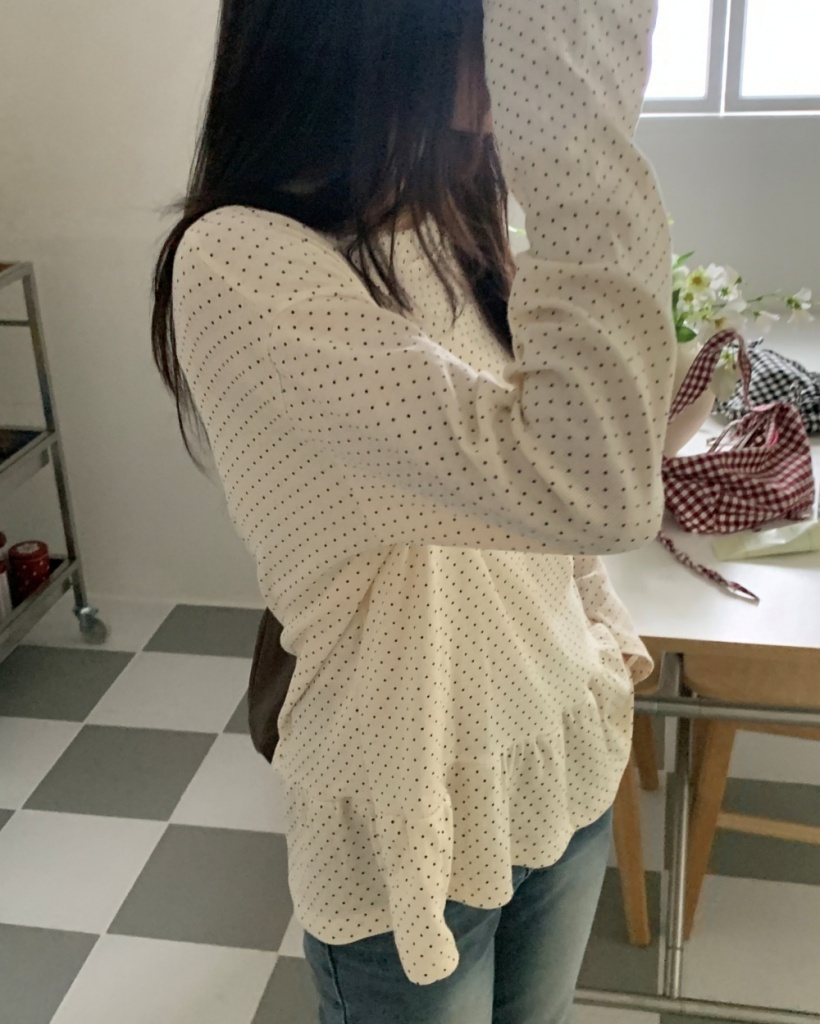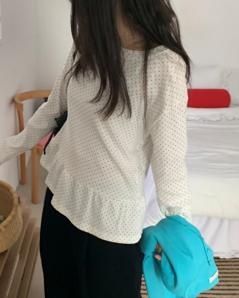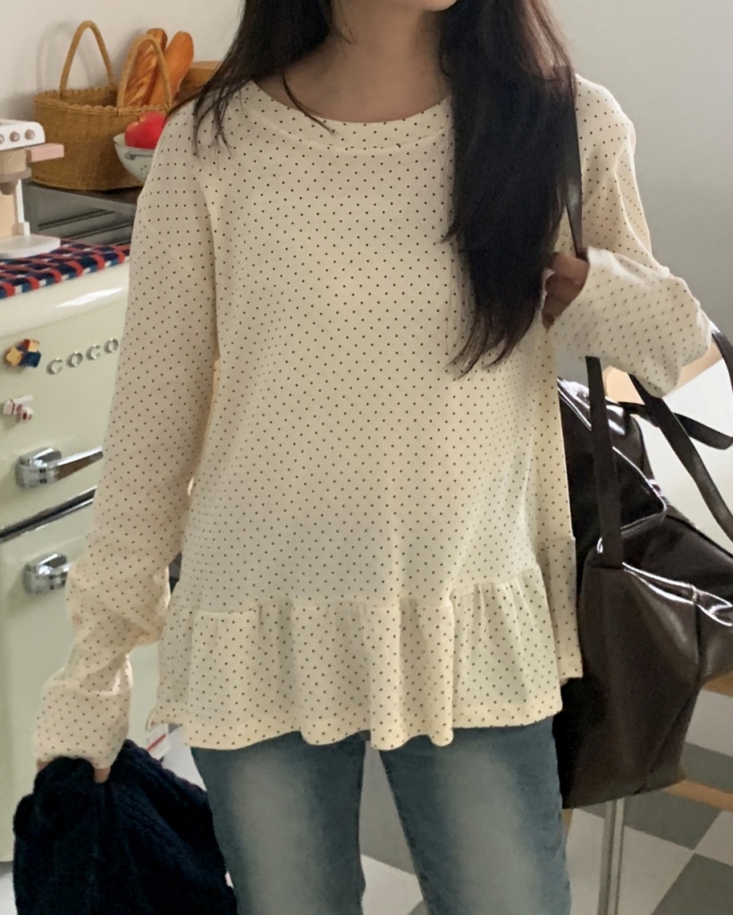 ドット/水玉柄ラウンドネックルーズフィットフリルレイヤードシャーリングベーシック長袖Tシャツ3color