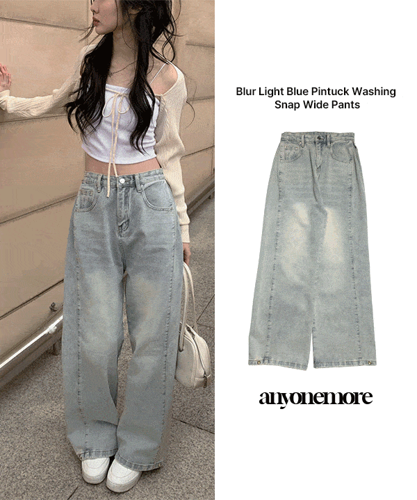 裾ボタンライトブルータックワイドデニムパンツ