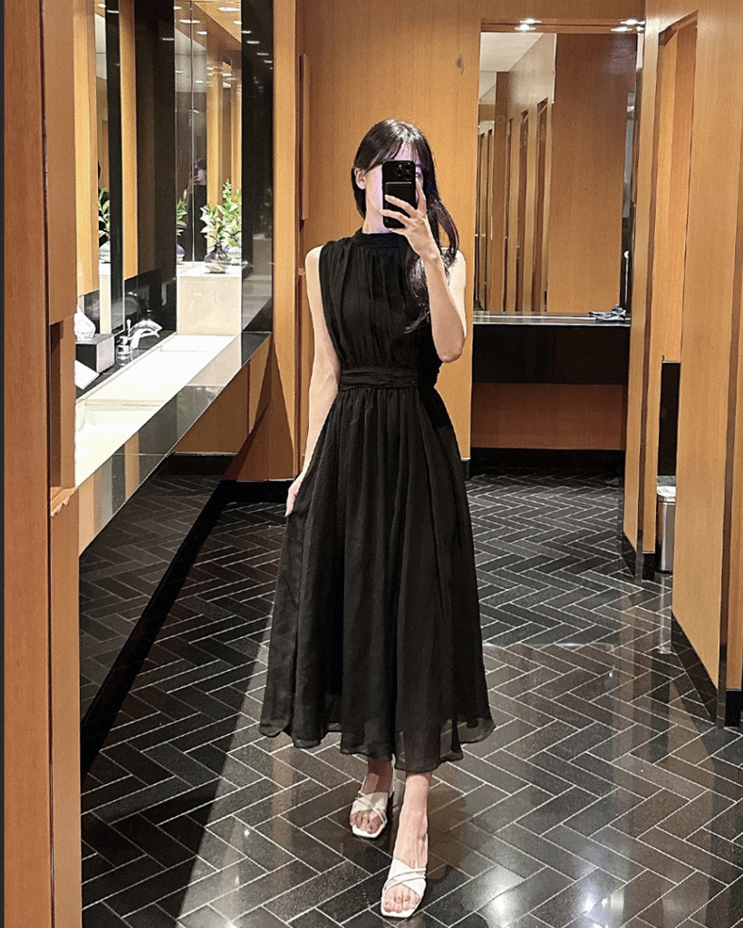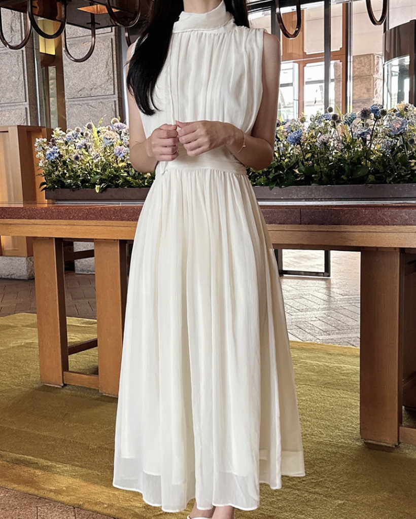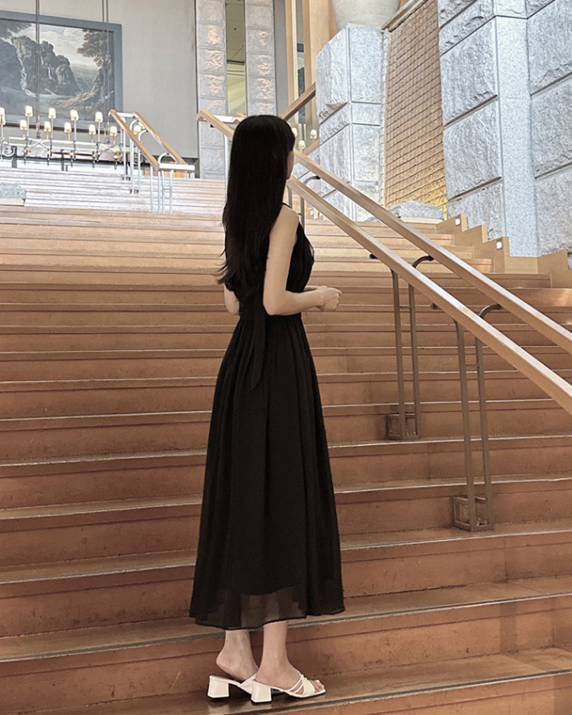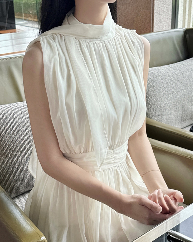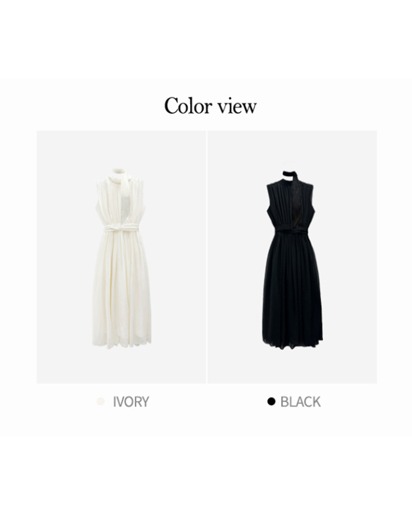 シルキー シフォン ボウタイ ホルターネック フレア ロング ワンピース